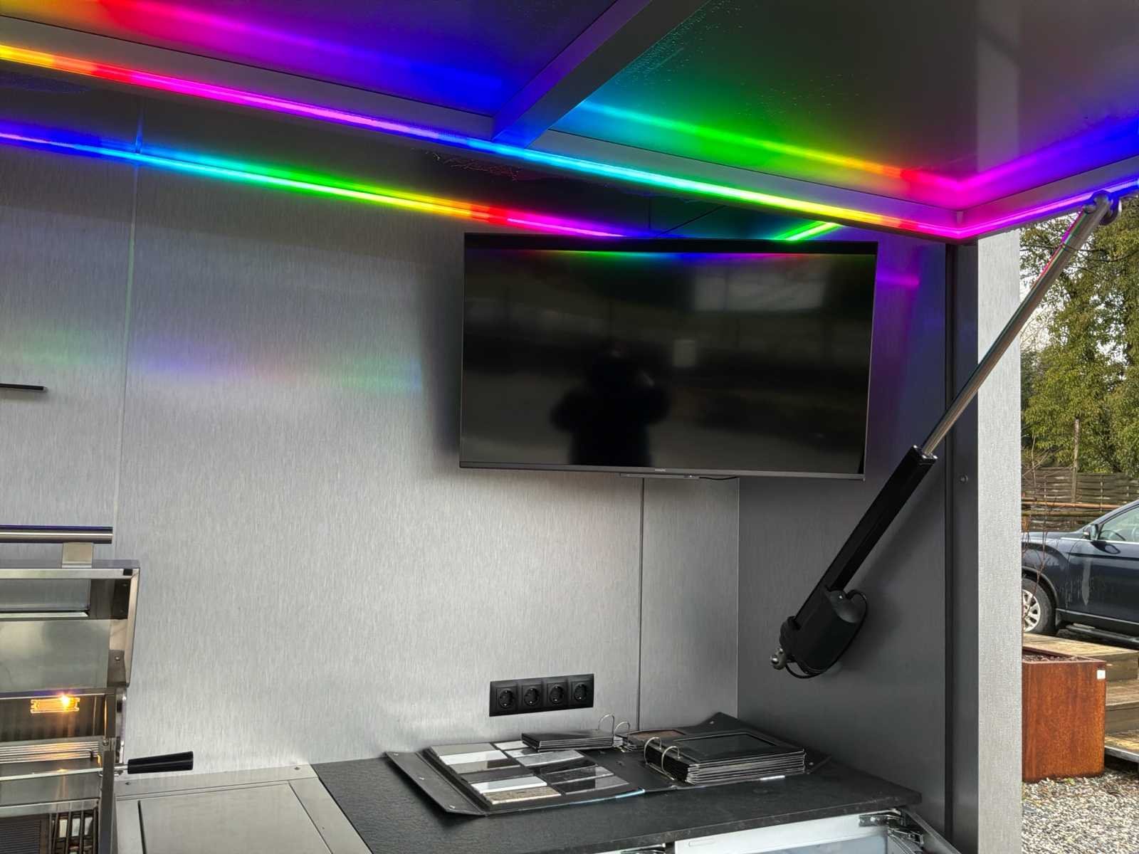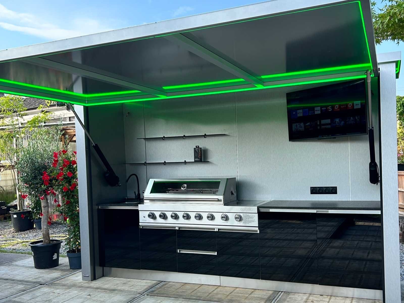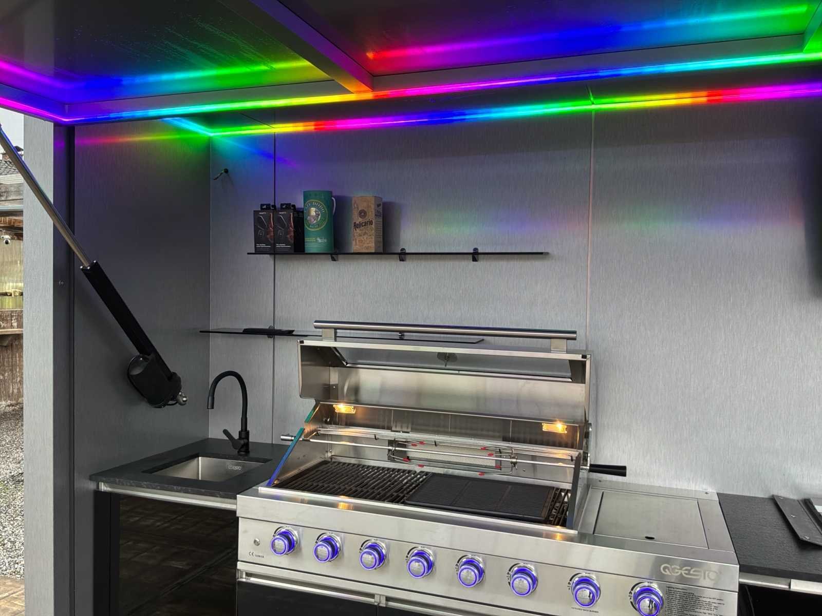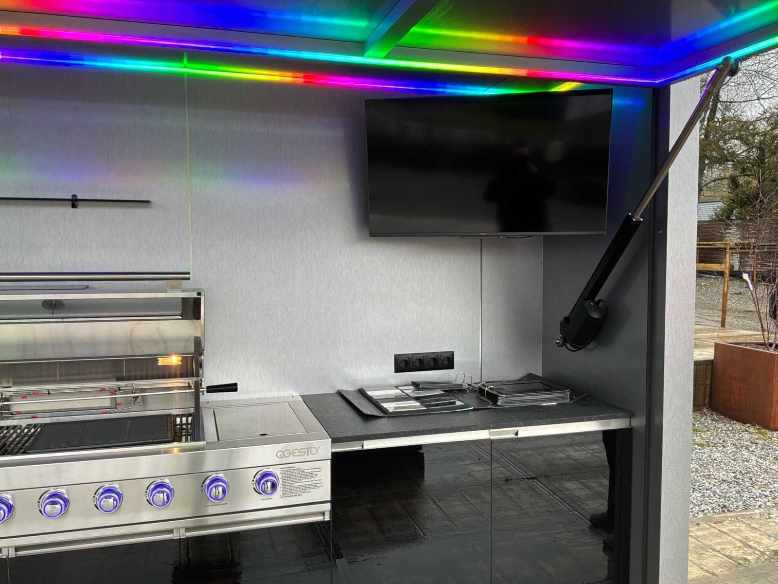 Complete buitenkeuken, displaymodel, volledig nieuw en nooit gebruikt. Uitgerust met een XXL gasbarbecue (147 cm), gootsteen met kraan, krik met afstandsbediening en openend systeem. LED-verlichting. Het omvat ook twee ingebouwde koelkasten en verschillende opslagunits. Vooruitrusting voor installatie van een geïntegreerd audiosysteem. TV inbegrepen in het perspectief. Binnenstopcontacten zijn aanwezig, waaronder de toevoeging van een bierpomp of ijsmaker. Let op: Verwijdering volledig op kosten van de koper. De constructie kan niet worden afgebroken. U moet een geschikte oplegger voor transport en een kraan voor het verplaatsen verzorgen. De verkoper kan echter helpen met de logistieke procedures als u dat wilt. (diensten niet inbegrepen bij de aankoop) No Merk: Qgesto Model: Port xxl Kleur: Grijs en zwart Gewicht: 670kg Lengte: 366cm Breedte: 98cm Hoogte: 234cm Materiaal: Roestvrij stalen stacbondglas en steen