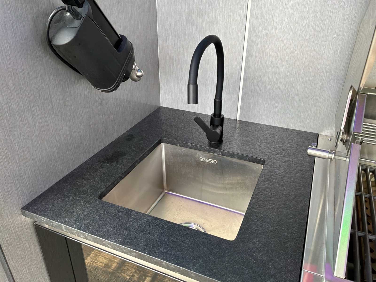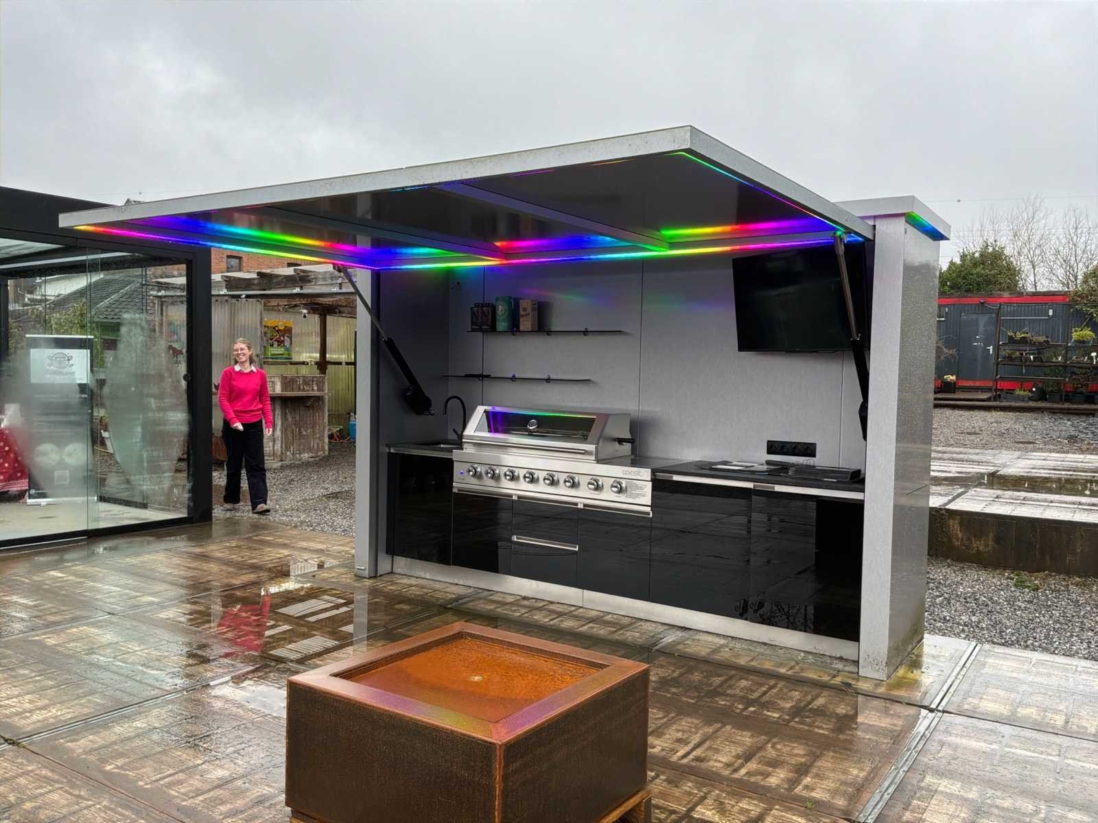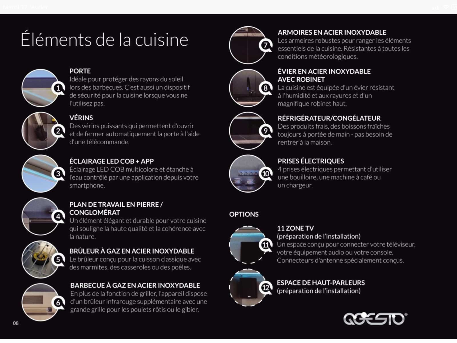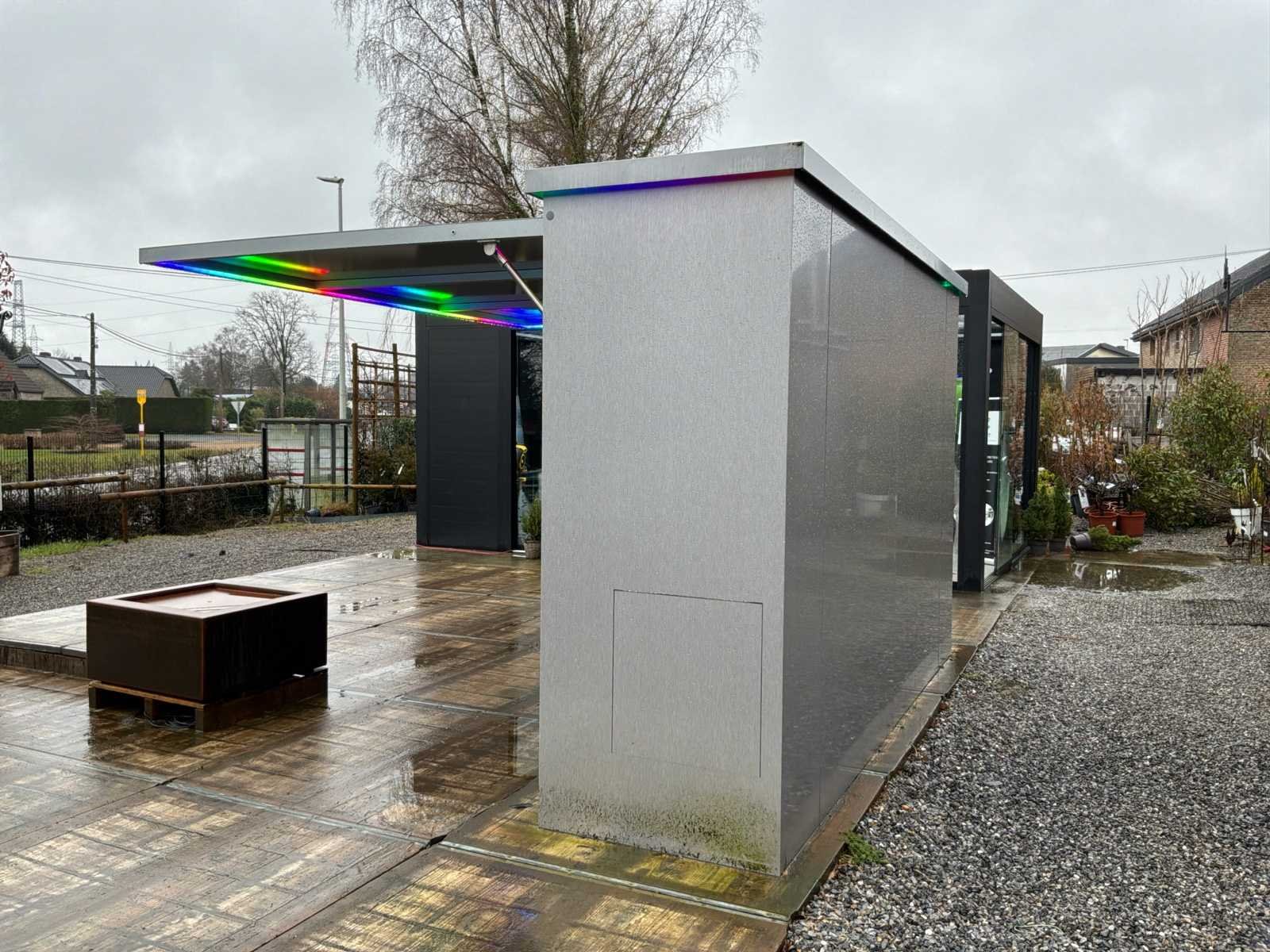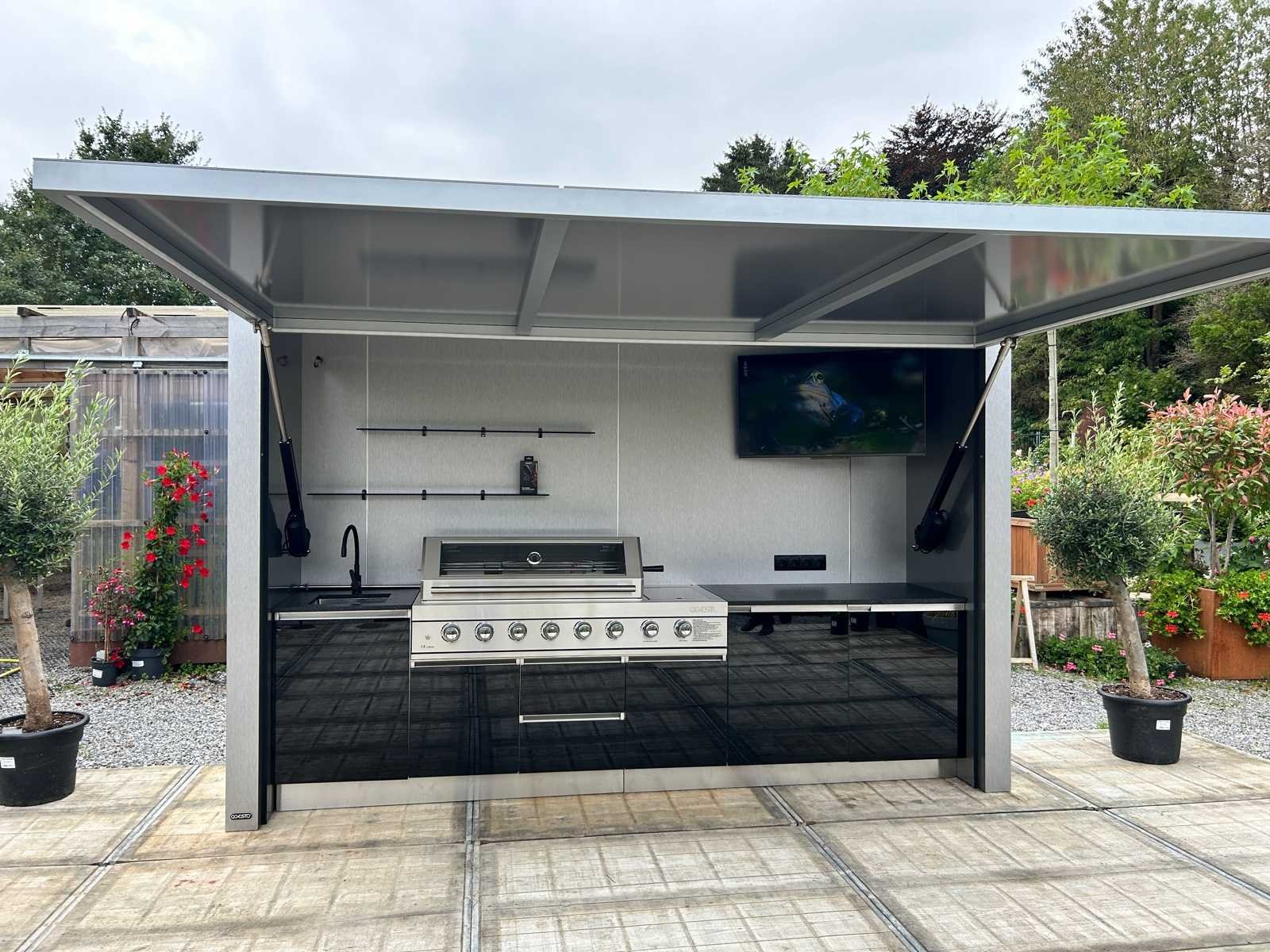 Complete buitenkeuken, displaymodel, volledig nieuw en nooit gebruikt. Uitgerust met een XXL gasbarbecue (147 cm), gootsteen met kraan, krik met afstandsbediening en openend systeem. LED-verlichting. Het omvat ook twee ingebouwde koelkasten en verschillende opslagunits. Vooruitrusting voor installatie van een geïntegreerd audiosysteem. TV inbegrepen in het perspectief. Binnenstopcontacten zijn aanwezig, waaronder de toevoeging van een bierpomp of ijsmaker. Let op: Verwijdering volledig op kosten van de koper. De constructie kan niet worden afgebroken. U moet een geschikte oplegger voor transport en een kraan voor het verplaatsen verzorgen. De verkoper kan echter helpen met de logistieke procedures als u dat wilt. (diensten niet inbegrepen bij de aankoop) No Merk: Qgesto Model: Port xxl Kleur: Grijs en zwart Gewicht: 670kg Lengte: 366cm Breedte: 98cm Hoogte: 234cm Materiaal: Roestvrij stalen stacbondglas en steen