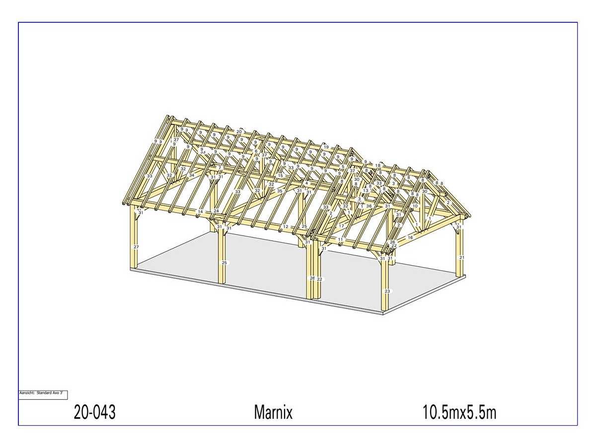 <li>Totaal afmeting pakket: circa 5600 x 1200 x 1800 mm </li><li>Inclusief: wand en dak bekleding </li><li>Kopmaat liggers: 230x180 mm, 130x130 mm, 180x 60 mm en 80x70 mm </li><li>Aantal draagsteunen: 10 stuks </li><li>Kopmaat staanders 180 x 180 mm </li><li>Beplanking: inbegrepen in dit kavel </li><li>Beplanking gevels: Type Rabat 62 m² (175 x 25 x 10 mm) </li><li>Beplanking onderdak : 91 m² </li><li>Referentie: Marnix </li><li>Handleiding opbouw: aanwezig met QR code </li><li>Staat: ongebruikt, bouwpakket</li> Nee Model: 20-043 Gewicht: 3500kg Lengte: 1050cm Breedte: 550cm Hoogte: 489cm Materiaal: Fijnspar
