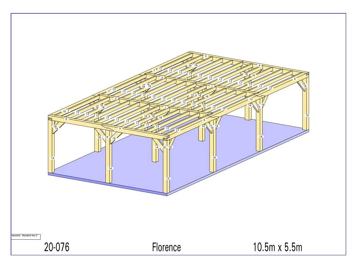 <li>Totaal afmeting pakket (transport): circa 5500x1200x1200 mm </li><li>Kopmaat liggers: 130x130 mm en 130x60 mm </li><li>Aantal draagsteunen: 12 stuks </li><li>Kopmaat staanders 130x130 mm </li><li>Referentie: Florence </li><li>Handleiding opbouw: aanwezig met QR code </li><li>Staat: ongebruikt, bouwpakket</li> Nee Model: 20-076 Gewicht: 1000kg Lengte: 1050cm Breedte: 550cm Hoogte: 233cm Materiaal: Fijnspar