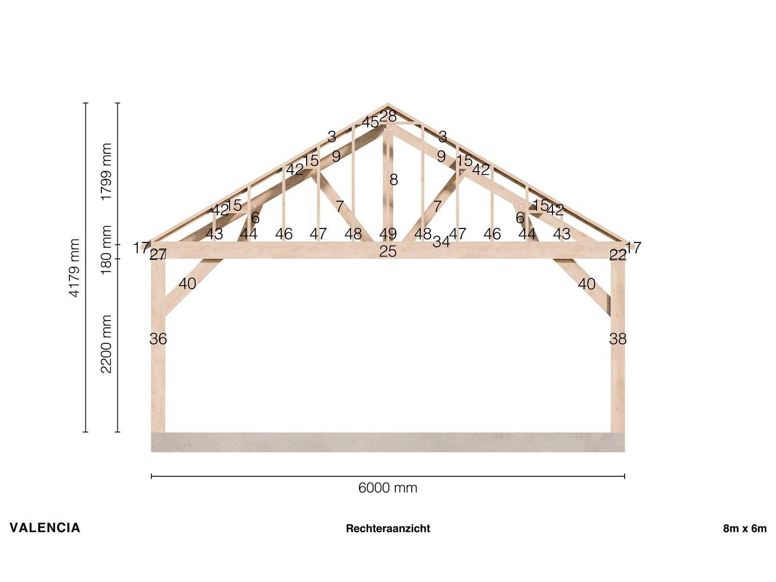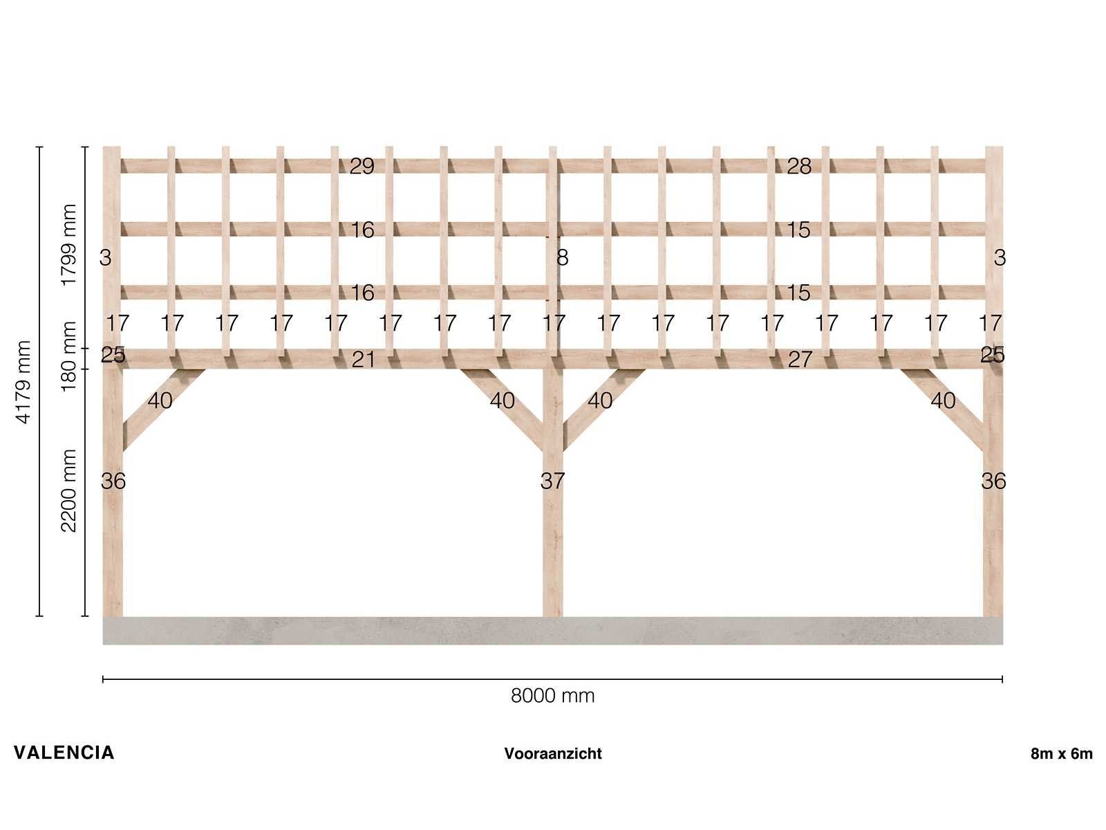 <li>Totaal afmeting pakket: circa 6000 x 1200 x 1400 mm </li><li>Aantal draagsteunen: 6 stuks </li><li>Kopmaat staanders 180 x 180 mm, 180x60 mm en 130 x 130 mm </li><li>Referentie: Valencia </li><li>Handleiding opbouw: aanwezig met QR code </li><li>Staat: ongebruikt, bouwpakket</li> Nee Model: 20-094 Gewicht: 1600kg Lengte: 8000cm Breedte: 6000cm Hoogte: 4180cm Materiaal: Fijnspar