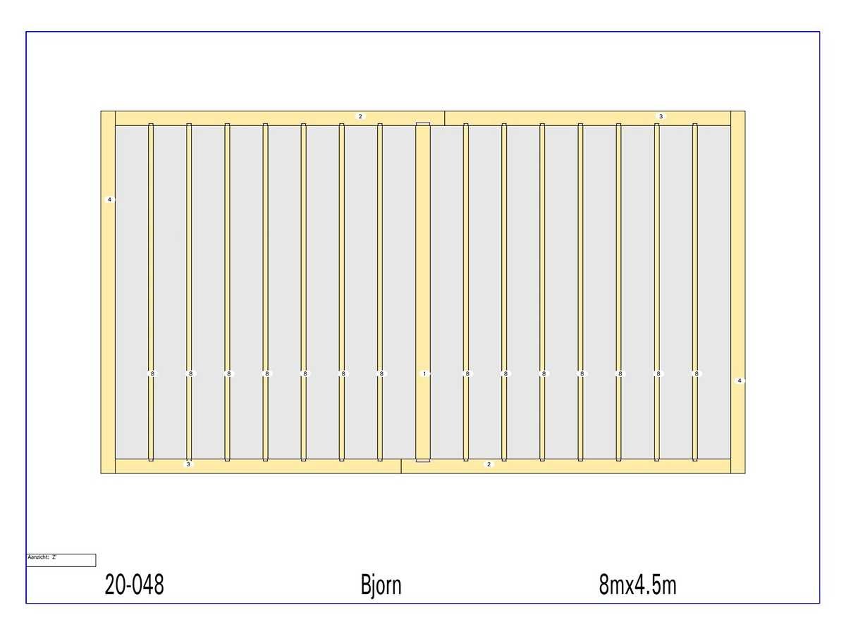 <li>Totaal afmeting pakket (transport): circa 4500x1000x800 mm </li><li>Kopmaat liggers: 130x60 mm </li><li>Aantal draagsteunen: 130x130 : 6 stuks </li><li>Kopmaat staanders: 130x130 mm </li><li>Referentie: Björn </li><li>Handleiding opbouw: aanwezig met QR code </li><li>Staat: ongebruikt, bouwpakket</li> Nee Model: 20-048 Gewicht: 500kg Lengte: 800cm Breedte: 450cm Hoogte: 233cm Materiaal: Fijnspar