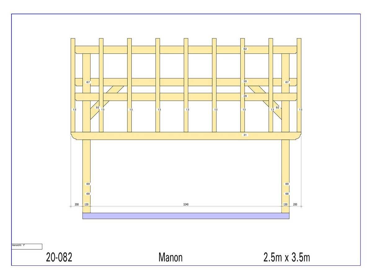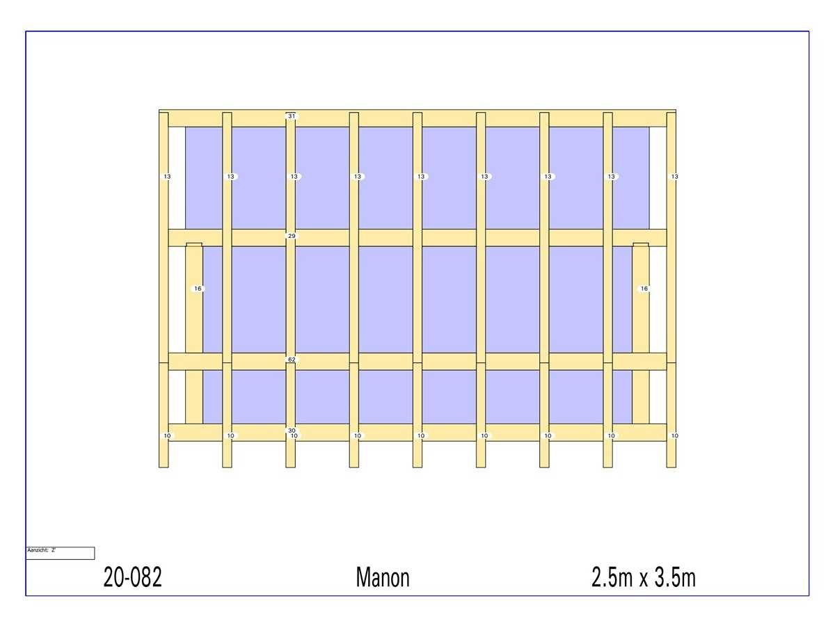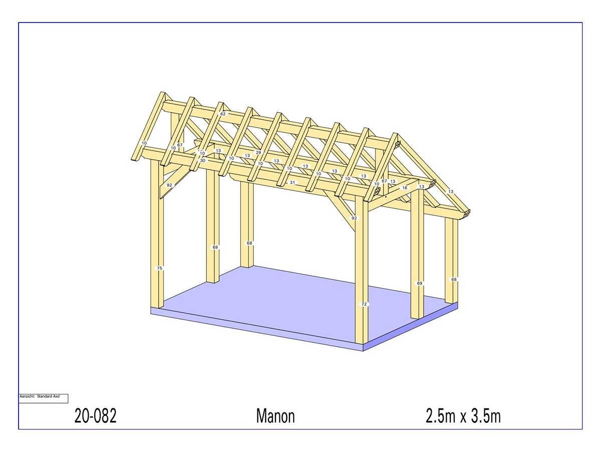 <li>Totaal afmeting pakket (transport): circa 4200x7500x750 mm </li><li>Kopmaat liggers: 130x60 mm en 80x70 mm </li><li>Aantal draagsteunen: 6 stuks </li><li>Kopmaat staanders: 130x130 mm </li><li>Referentie: Manon </li><li>Handleiding opbouw: aanwezig met QR code </li><li>Staat: ongebruikt, bouwpakket</li> Nee Model: 20-082 Gewicht: 700kg Lengte: 350cm Breedte: 250cm Hoogte: 295cm Materiaal: Amerikaanse eiken