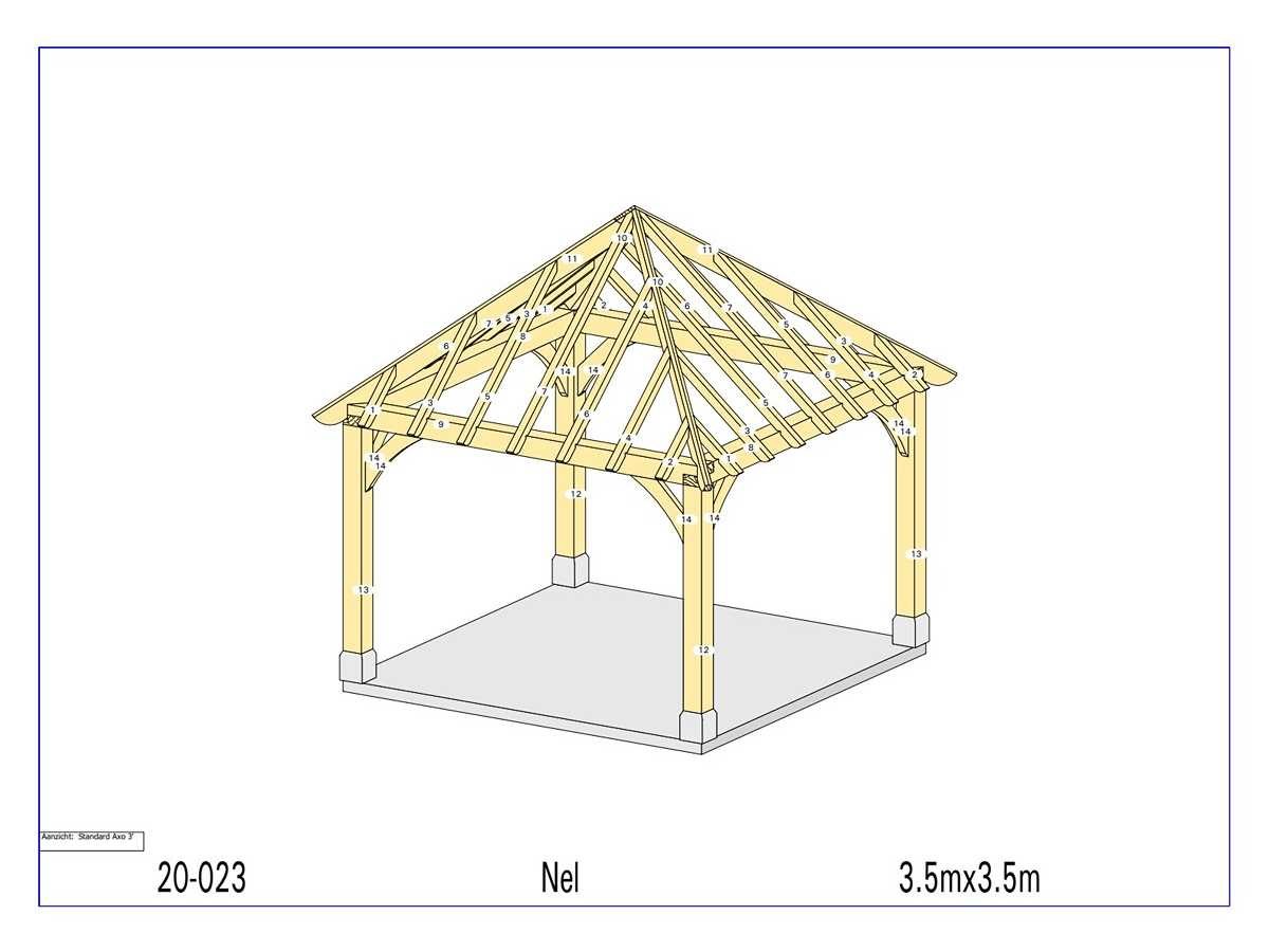 <li>Totaal afmeting pakket (transport): circa 3500x1000x500 mm </li><li>Kopmaat liggers: 180x60 mm en 80x70 mm </li><li>Aantal draagsteunen: 4 stuks </li><li>Kopmaat staanders: 180x180 mm </li><li>Referentie: Nel </li><li>Handleiding opbouw: aanwezig met QR code </li><li>Staat: ongebruikt, bouwpakket</li> Nee Model: 20-023 Gewicht: 600kg Lengte: 350cm Breedte: 350cm Hoogte: 367cm Materiaal: Fijnspar