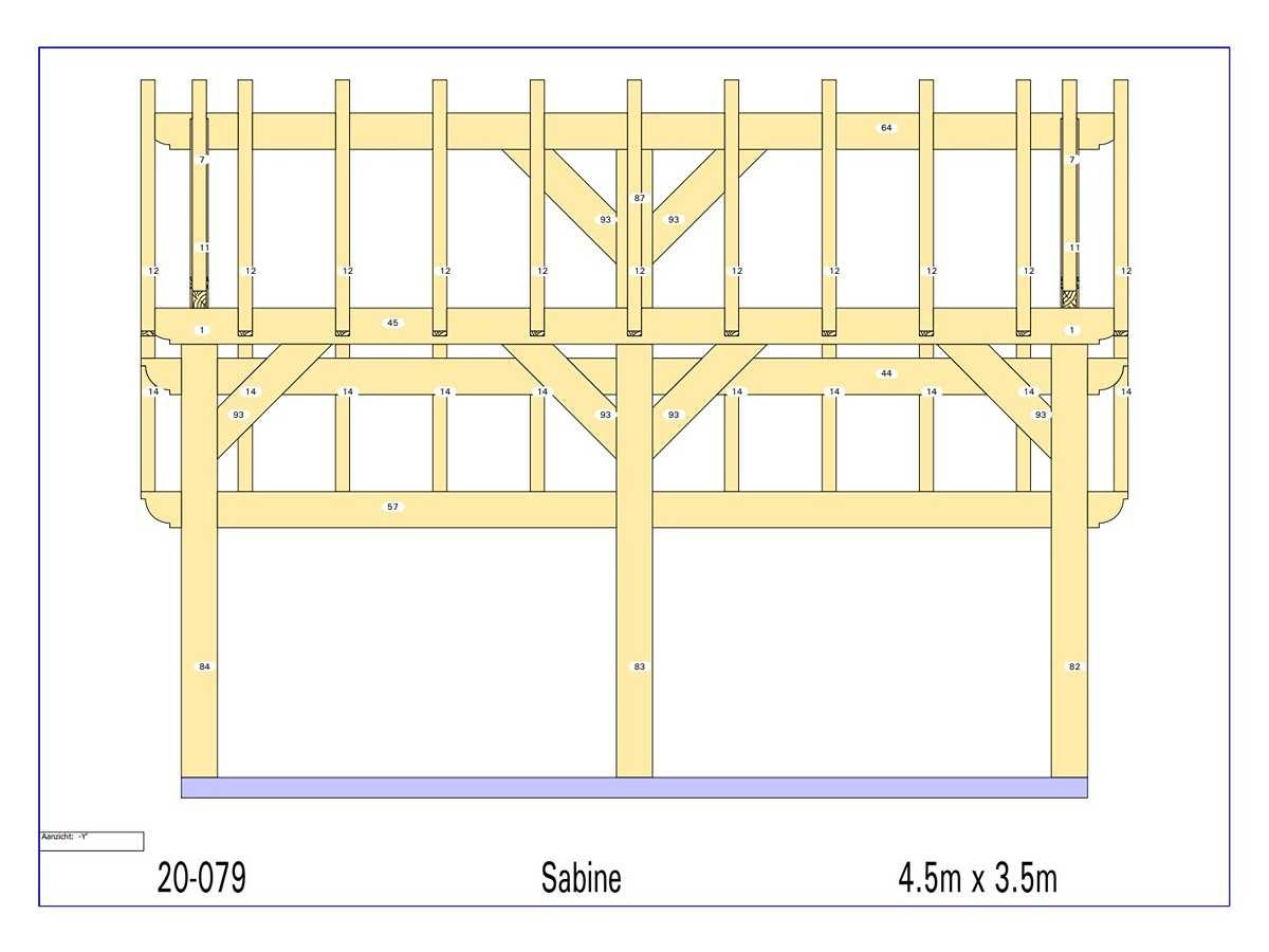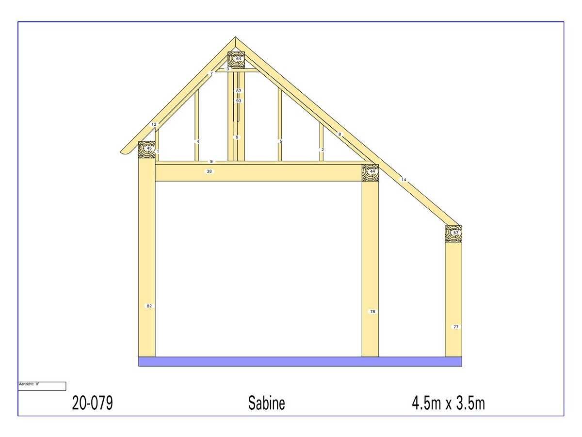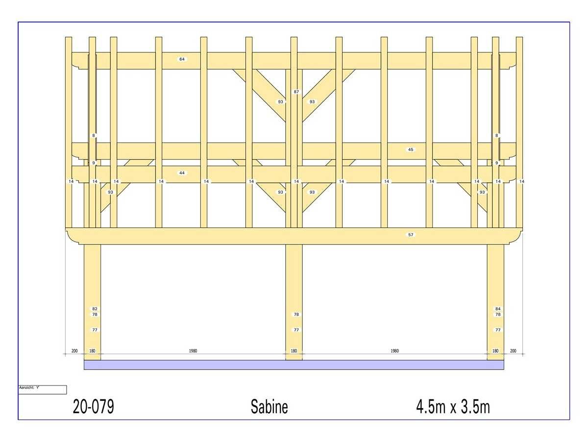 <li>Totaal afmeting pakket (transport): circa 4500x1000x750 mm </li><li>Kopmaat liggers: 180x60 mm en 80x70 mm </li><li>Aantal draagsteunen: 9 stuks </li><li>Kopmaat staanders: 180x180 mm </li><li>Referentie: Sabine </li><li>Handleiding opbouw: aanwezig met QR code </li><li>Staat: ongebruikt, bouwpakket</li> Nee Model: 20-079 Gewicht: 800kg Lengte: 450cm Breedte: 350cm Hoogte: 346cm Materiaal: Douglas