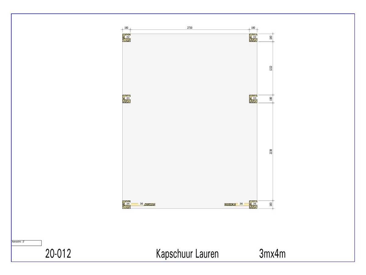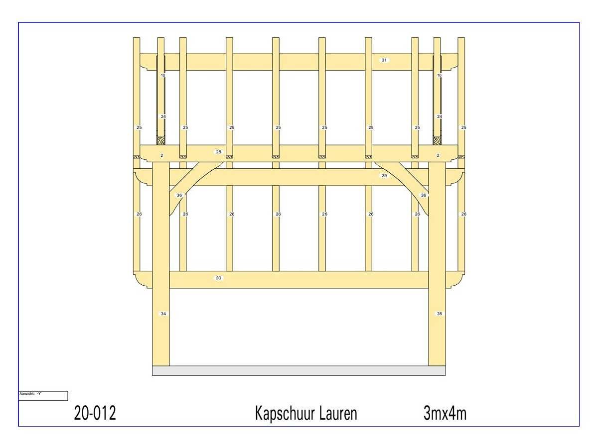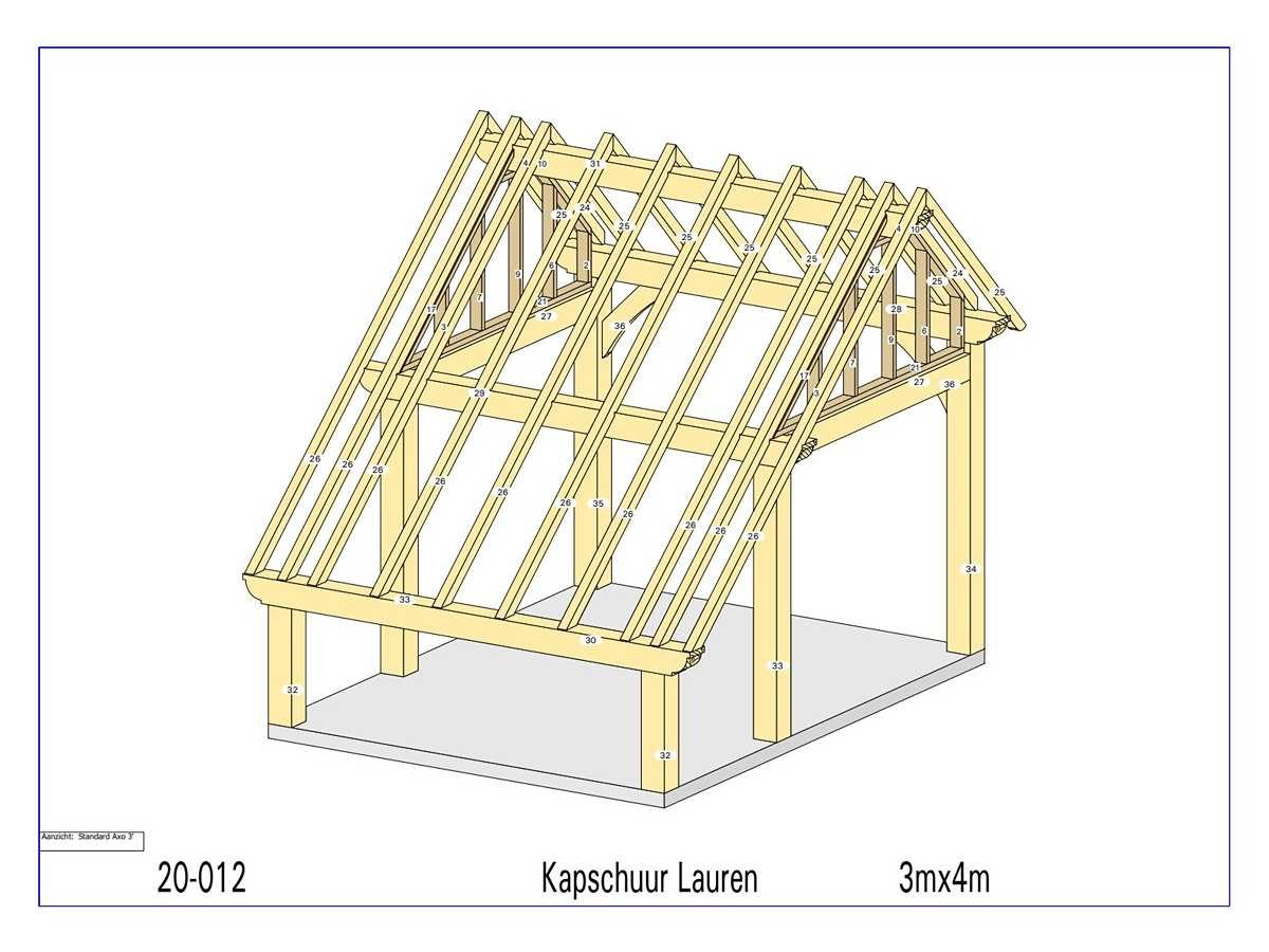 <li>Totaal afmeting pakket (transport): circa 3900x900x550 mm </li><li>Kopmaat liggers: 180x60 mm, 130x130 mm, 80x70 mm en 89x38 mm </li><li>Aantal draagsteunen: 6 stuks </li><li>Kopmaat staanders: 180x180 mm </li><li>Referentie: Lauren </li><li>Handleiding opbouw: aanwezig met QR code </li><li>Staat: ongebruikt, bouwpakket</li> Nee Model: 20-012 Gewicht: 750kg Lengte: 300cm Breedte: 400cm Hoogte: 346cm Materiaal: Fijnspar