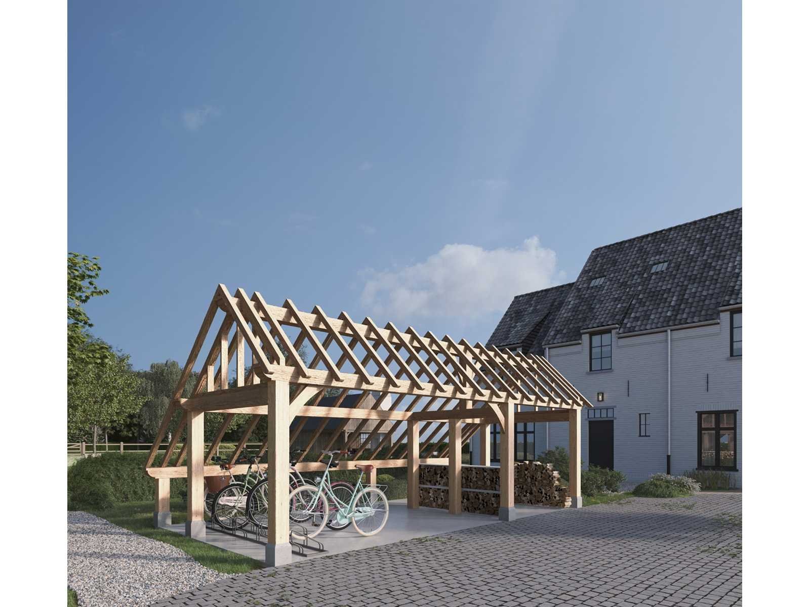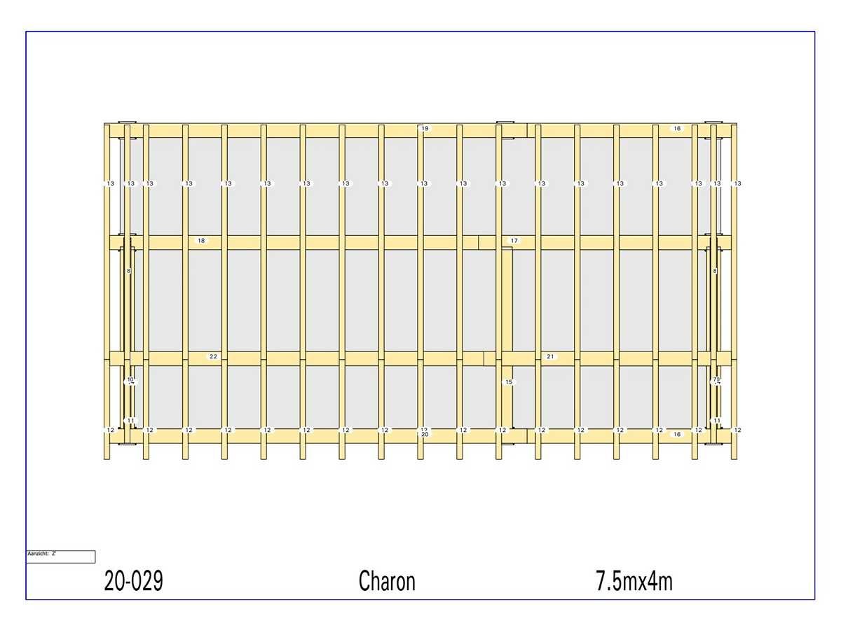 <li>Totaal afmeting pakket (transport): circa 5500x1200x800 mm </li><li>Kopmaat liggers: 180x60 mm, 130x130 mm, 80x70 mm en 89x38 mm </li><li>Aantal draagsteunen: 10 stuks </li><li>Kopmaat staanders: 180x180 mm </li><li>Referentie: Charon </li><li>Handleiding opbouw: aanwezig met QR code </li><li>Staat: ongebruikt, bouwpakket</li> Nee Model: 20-029 Gewicht: 1200kg Lengte: 750cm Breedte: 400cm Hoogte: 346cm Materiaal: Fijnspar