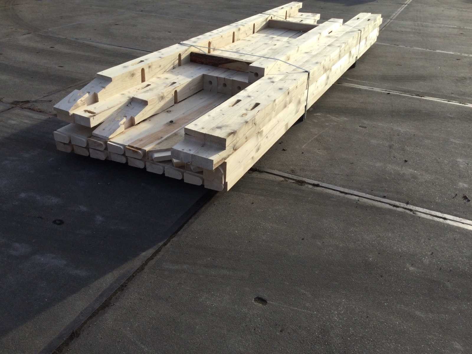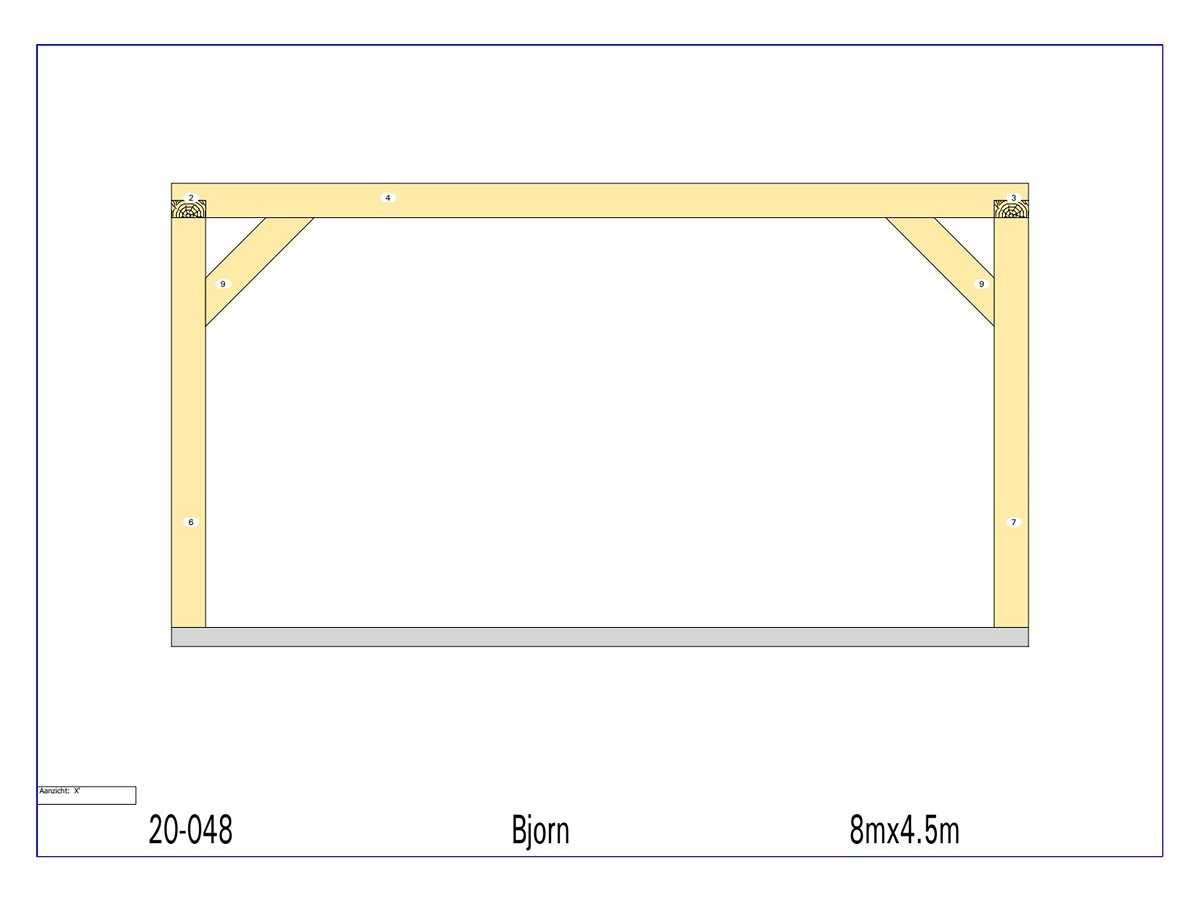 <li>Totaal afmeting pakket (transport): circa 4500x1000x800 mm </li><li>Kopmaat liggers: 130x60 mm </li><li>Aantal draagsteunen: 130x130 mm - 6 stuks </li><li>Kopmaat staanders: 130x130 mm </li><li>Referentie: Björn </li><li>Handleiding opbouw: aanwezig met QR code </li><li>Staat: ongebruikt, bouwpakket</li> Nee Model: 20-048 Gewicht: 900kg Lengte: 800cm Breedte: 450cm Hoogte: 233cm Materiaal: Fijnspar