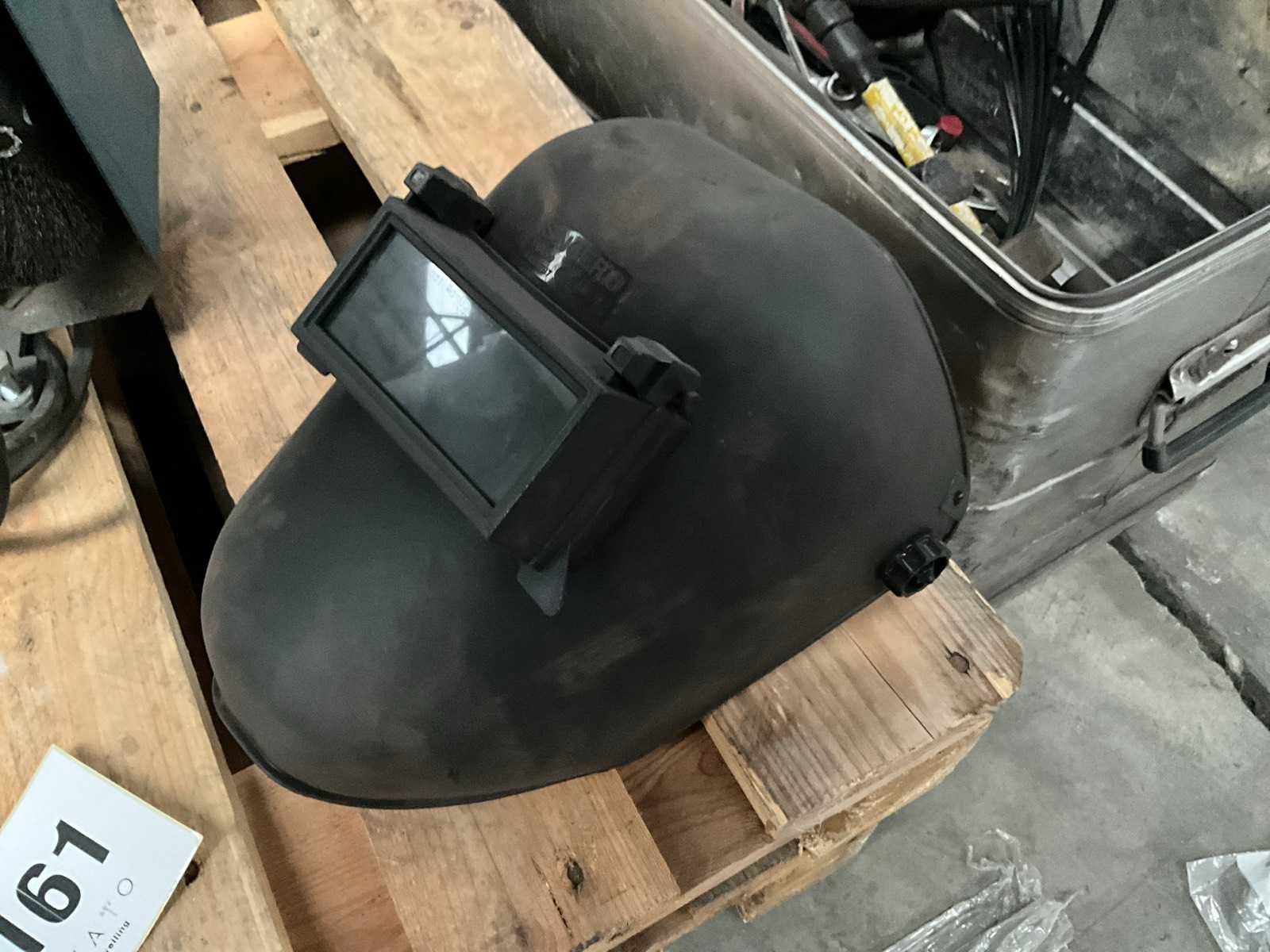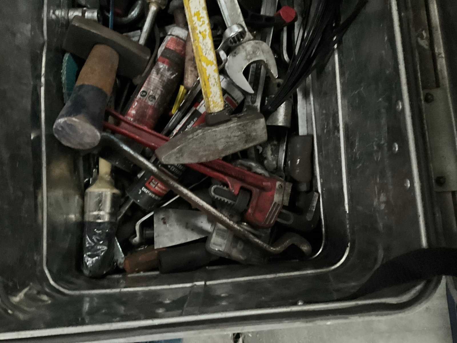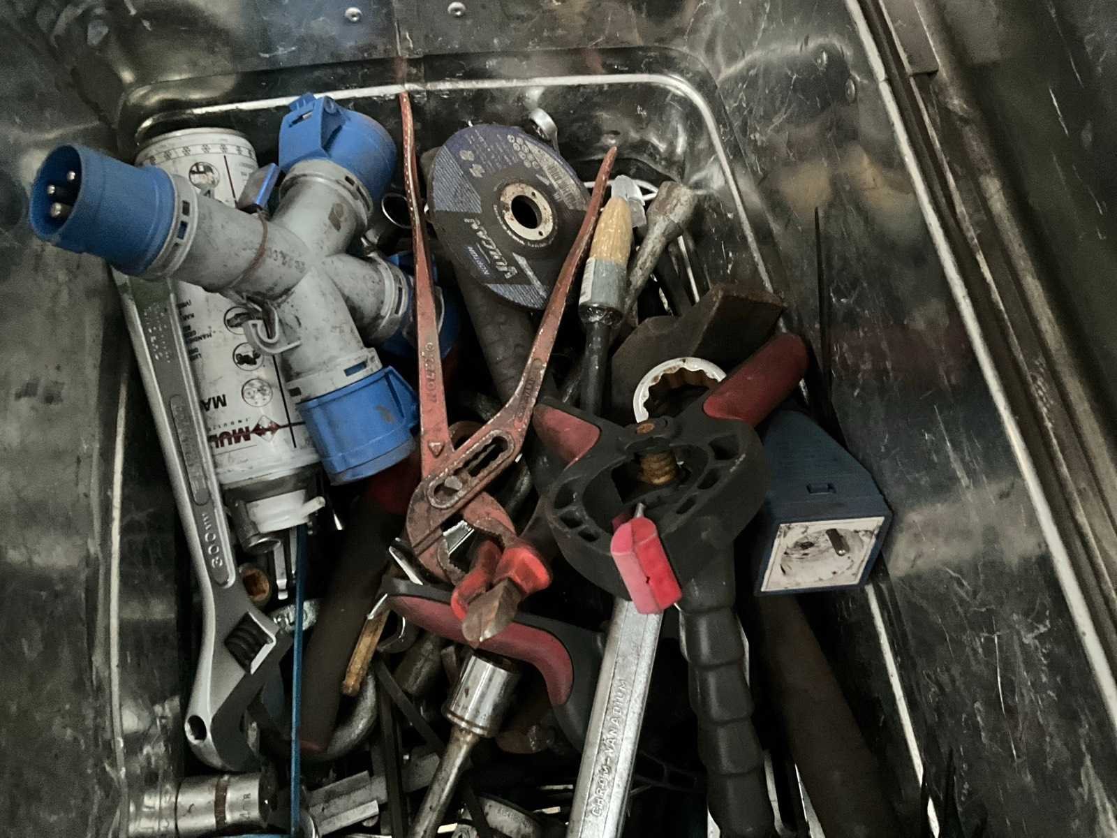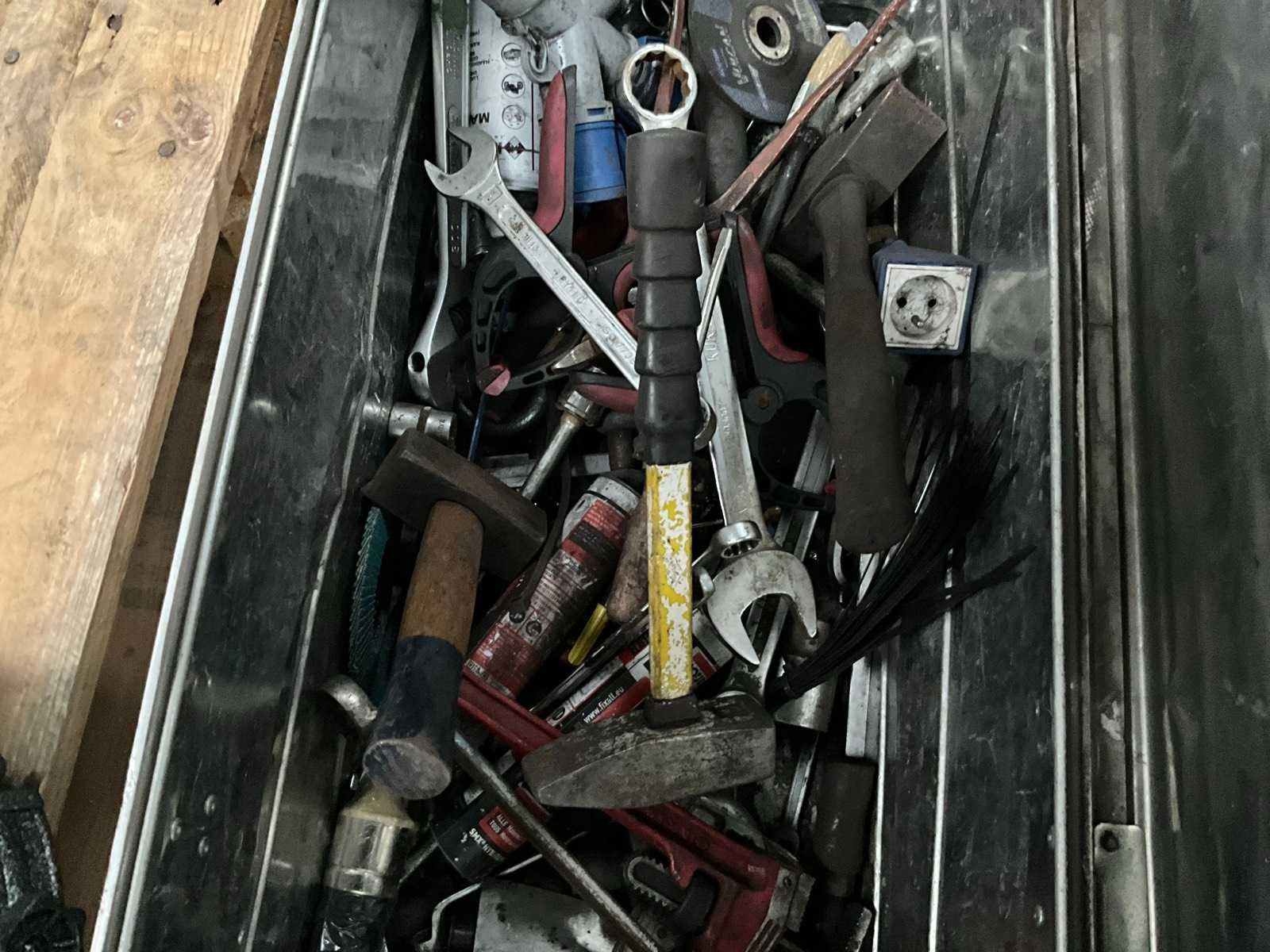 Inhoud waaronder 2 diverse lashelmen, stofmasker, diverse grote ring- en steeksleutels, hamers, schroevendraaiers, Engelse sleutel, Kniptangen, enz. in metalen opbergkoffer met afmeting circa 77 x 38 x 39 cm hoog. Nee