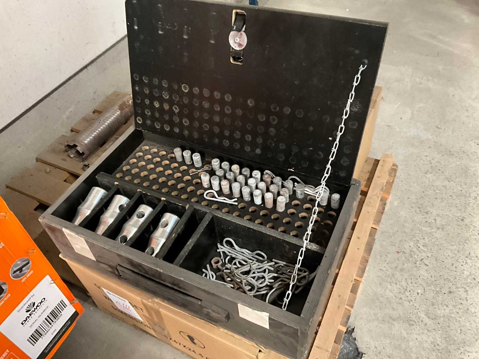 Houten koffer inhoudende enige pinnen en toebehoren. Nee Totale afmeting L: 520mm Totale afmeting Breedte: 320mm Totale afmeting Hoogte: 130mm