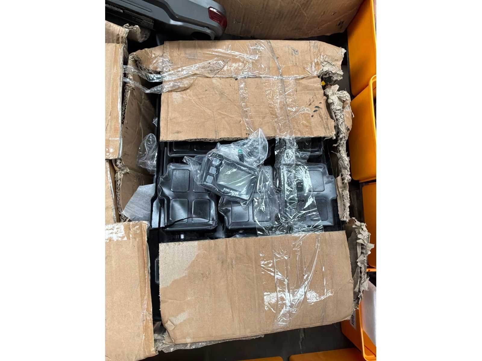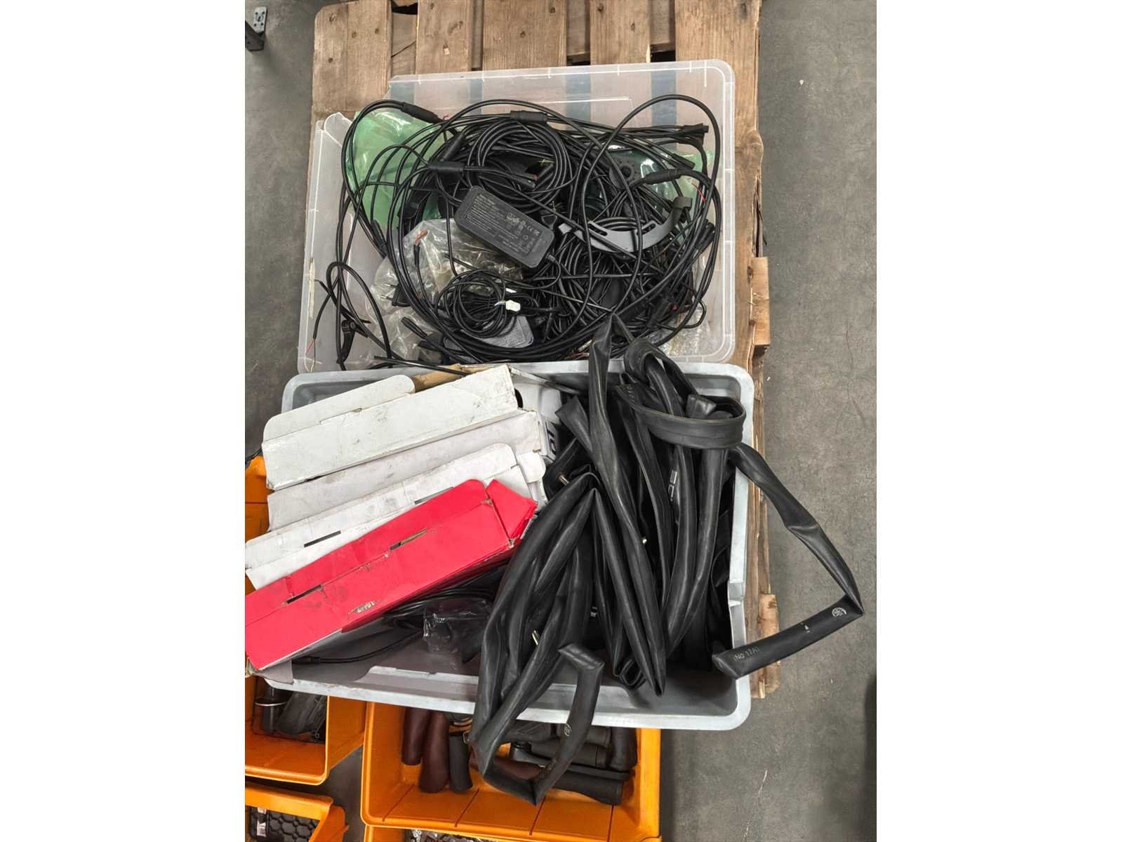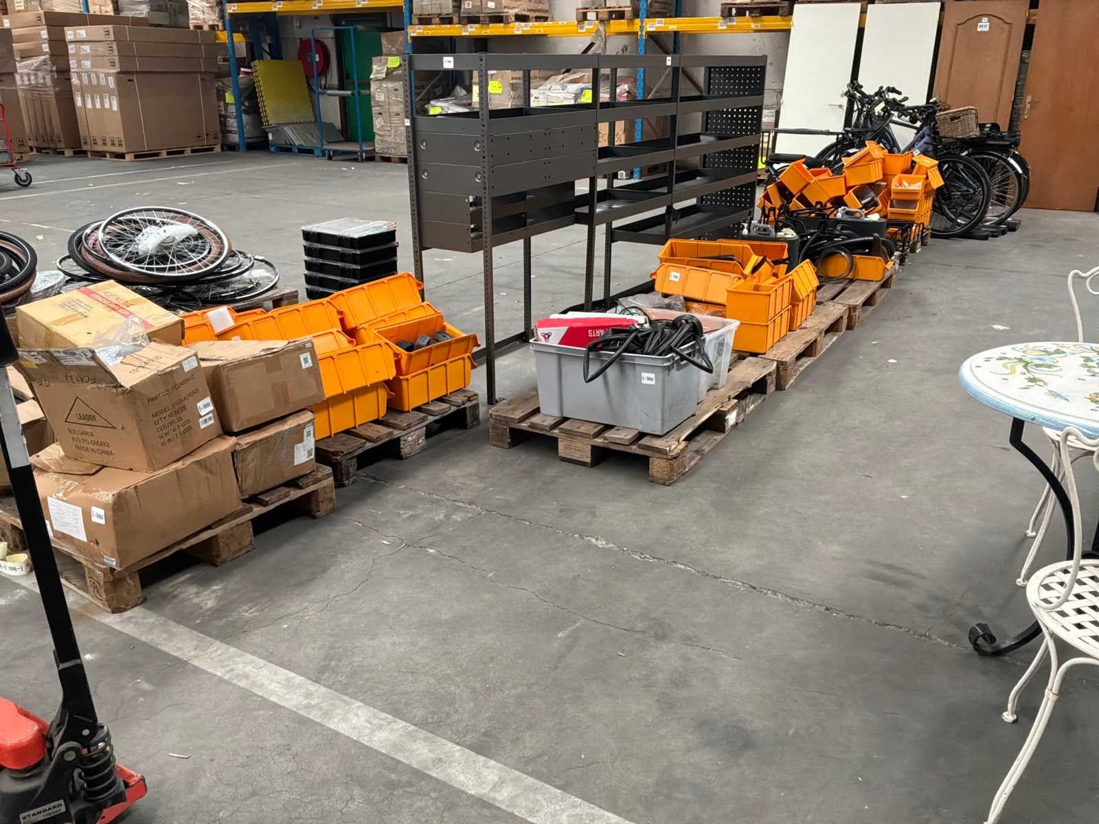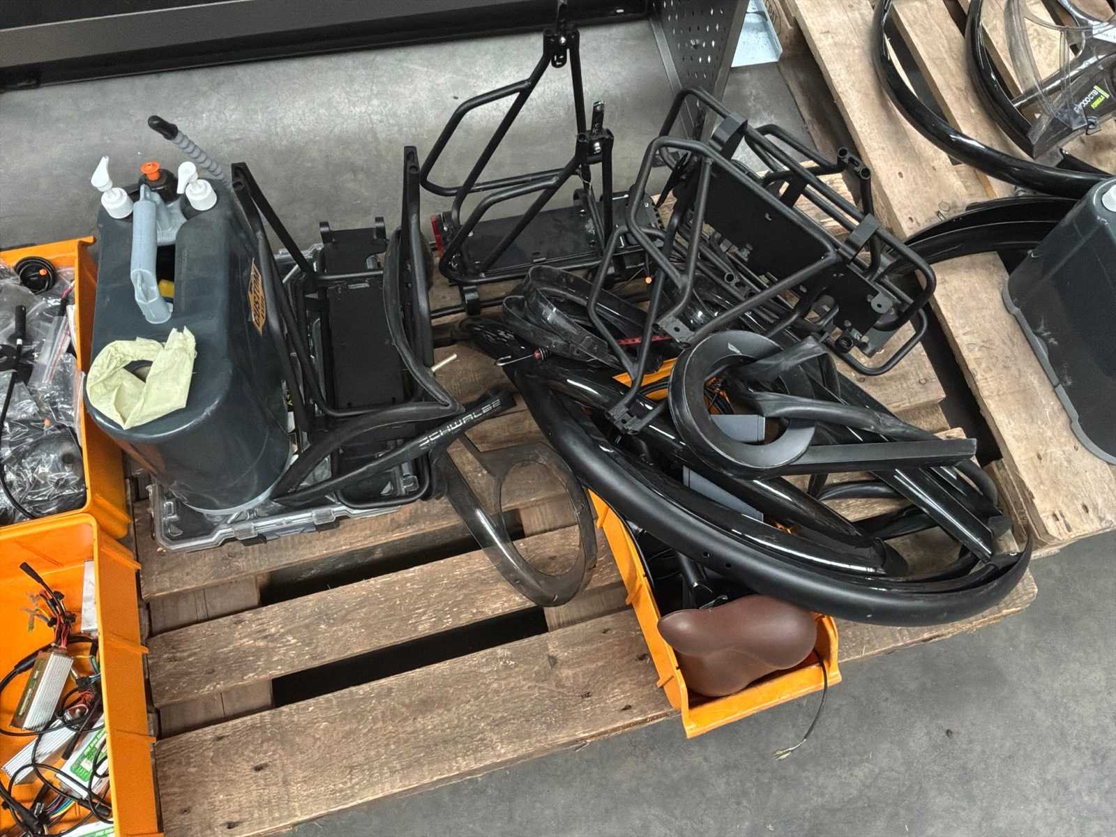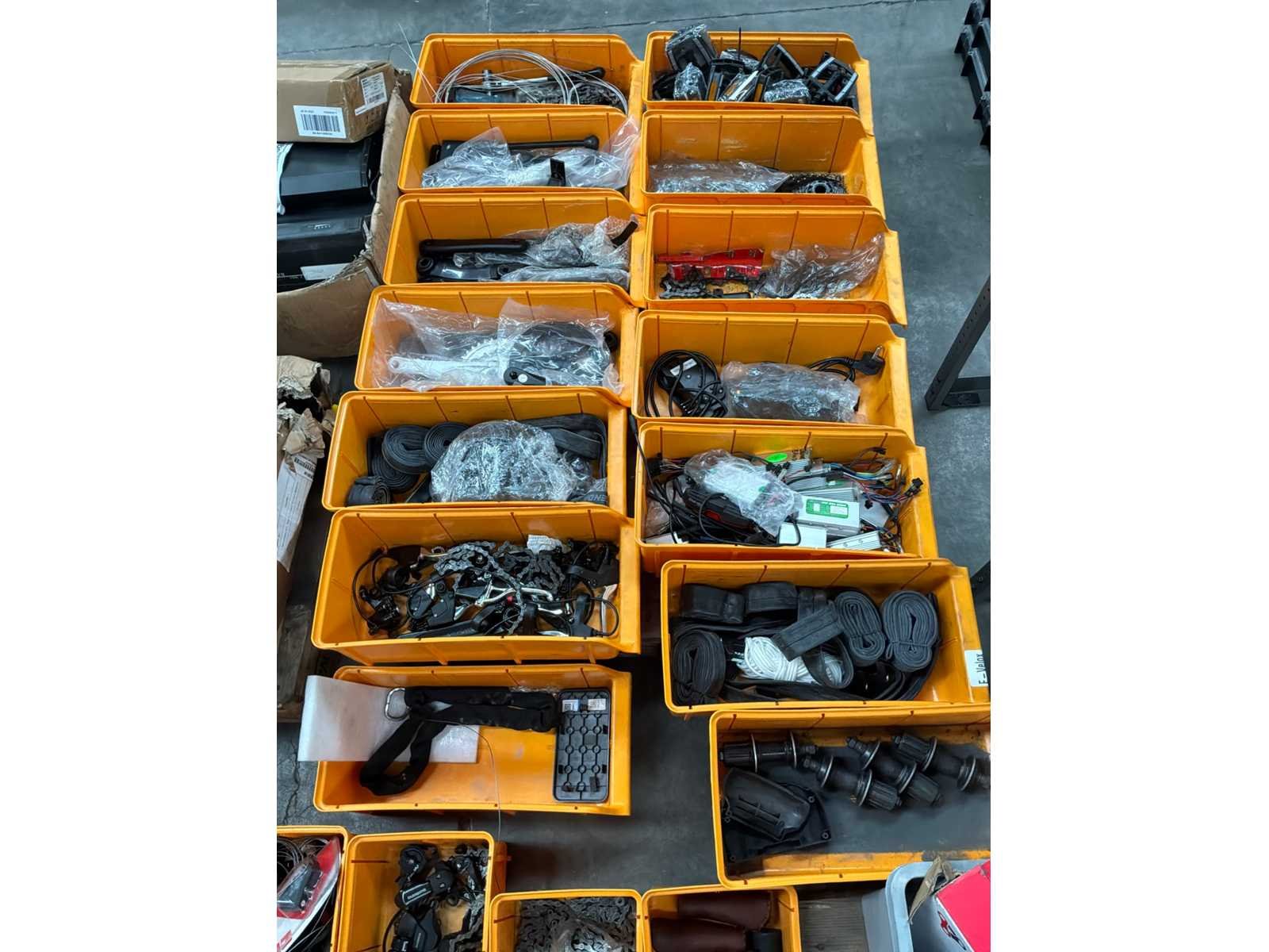 Tandwielen, kettingen, bagagehouders, trappers, batterijen, laders, … Lot verdeeld over +/- 70 oranje bakjes, 2 plastieken bakken en los materiaal Nee