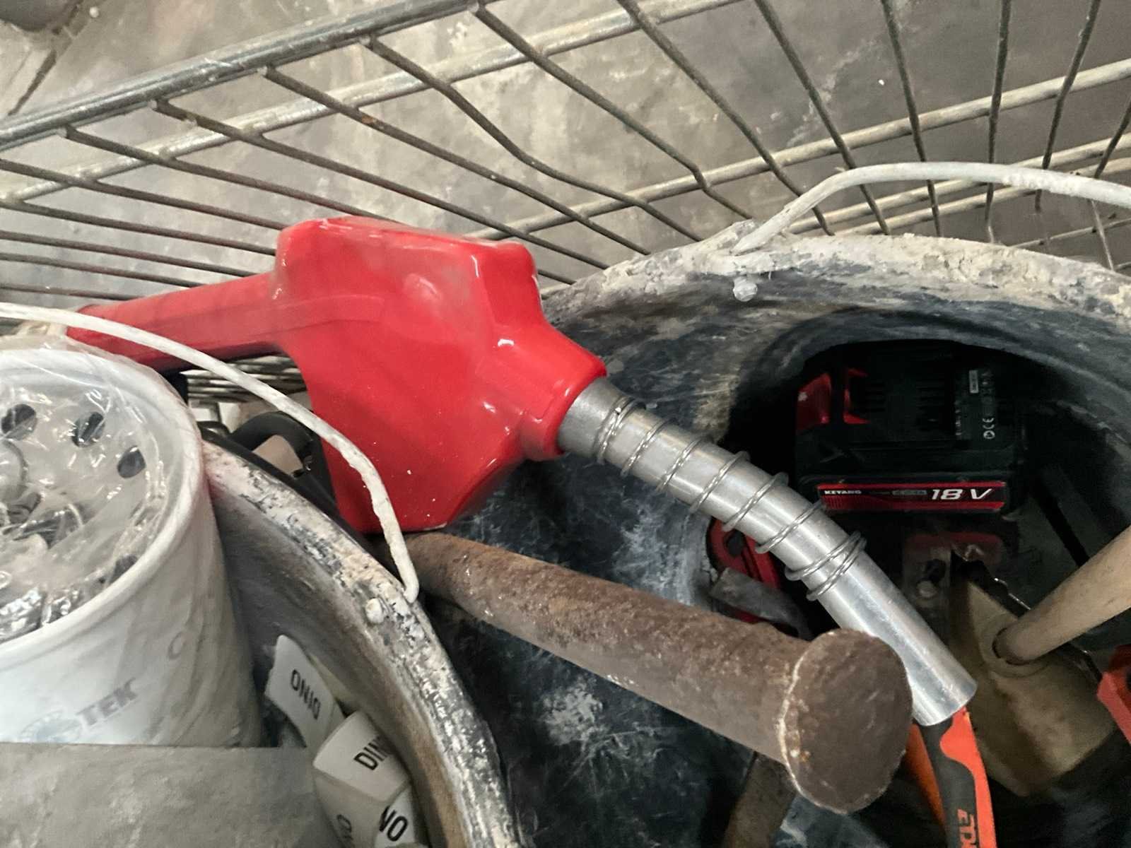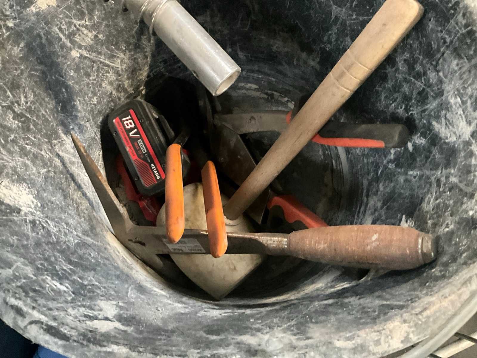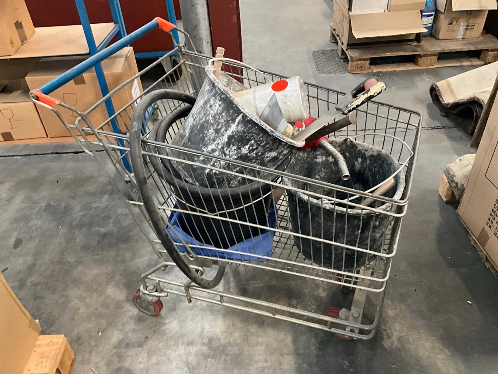 Bestaande uit 3 emmers inhoudende diverse tangen, handzaag, oliefilter, benzinepomp, truwelen, liggende in winkelkar Nee