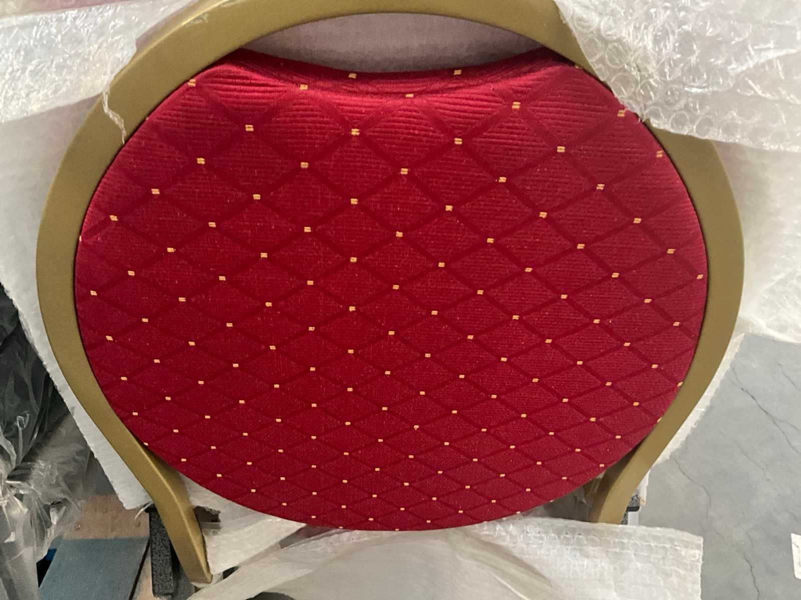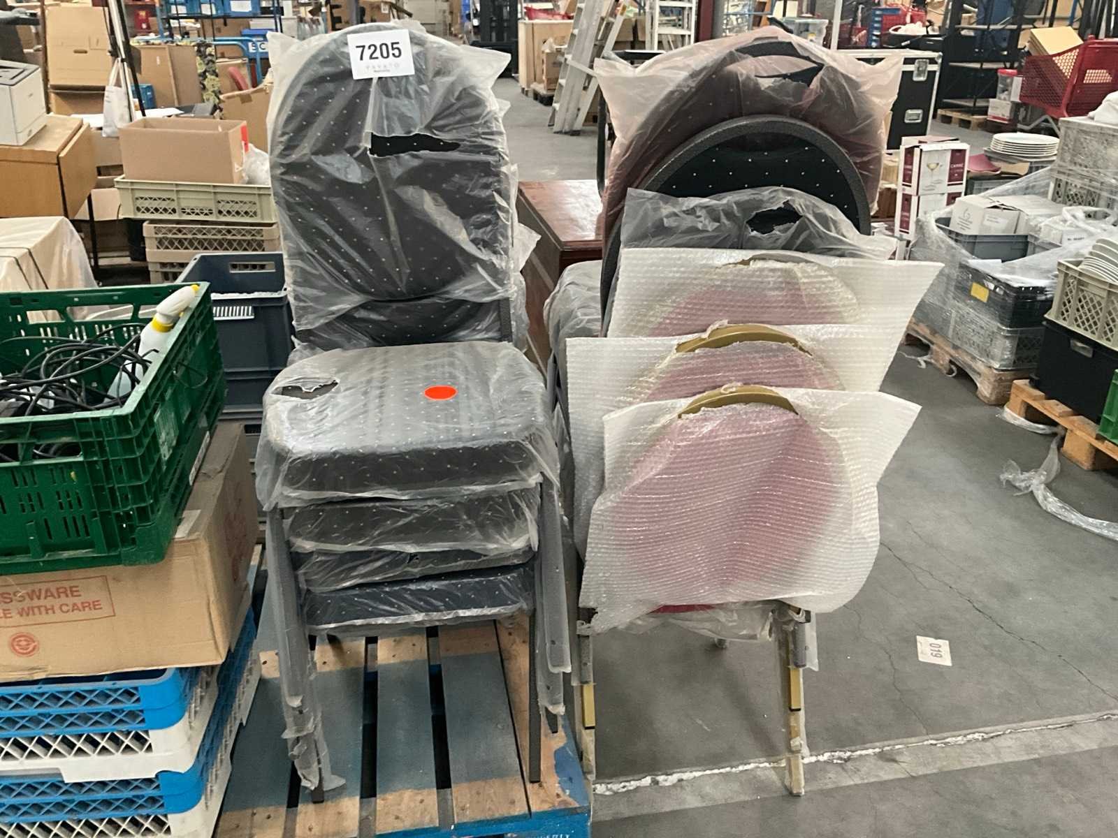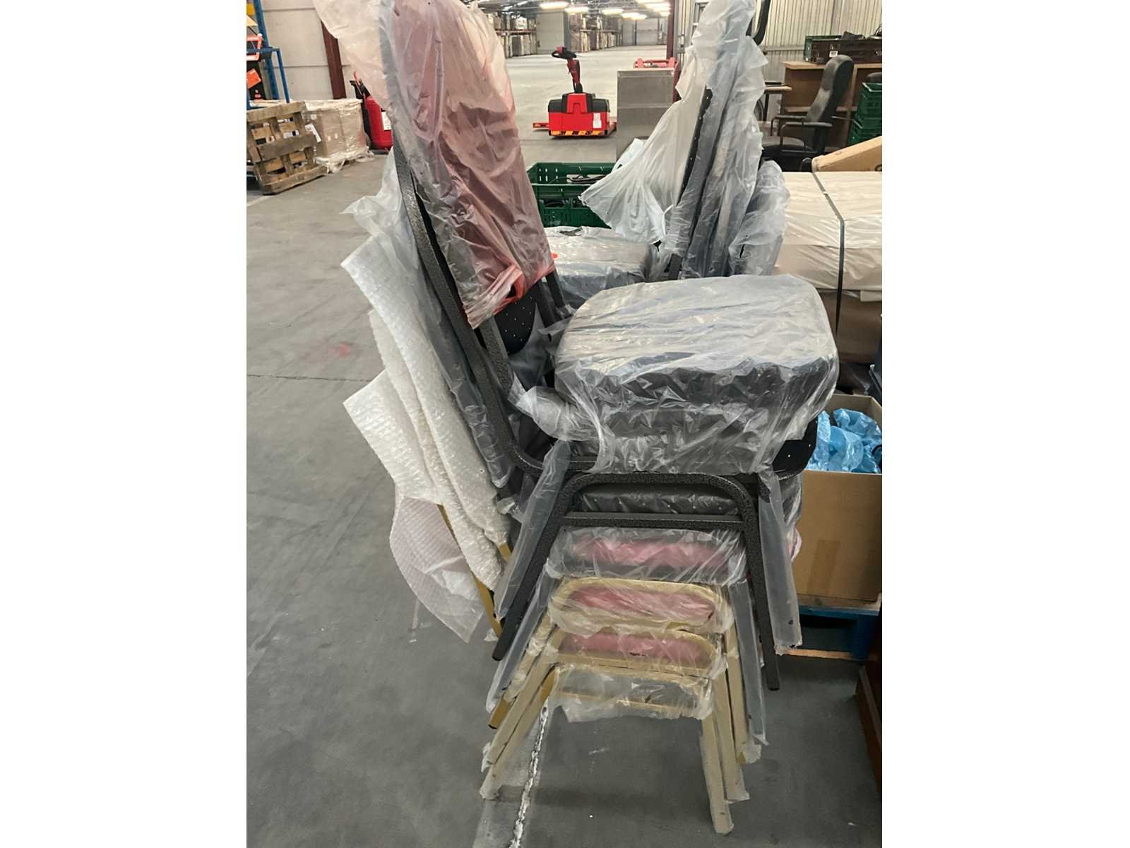 Stapelbaar. Voorzien van metalen onderstel en stoffen bekleding, in diverse kleuren. Nee
