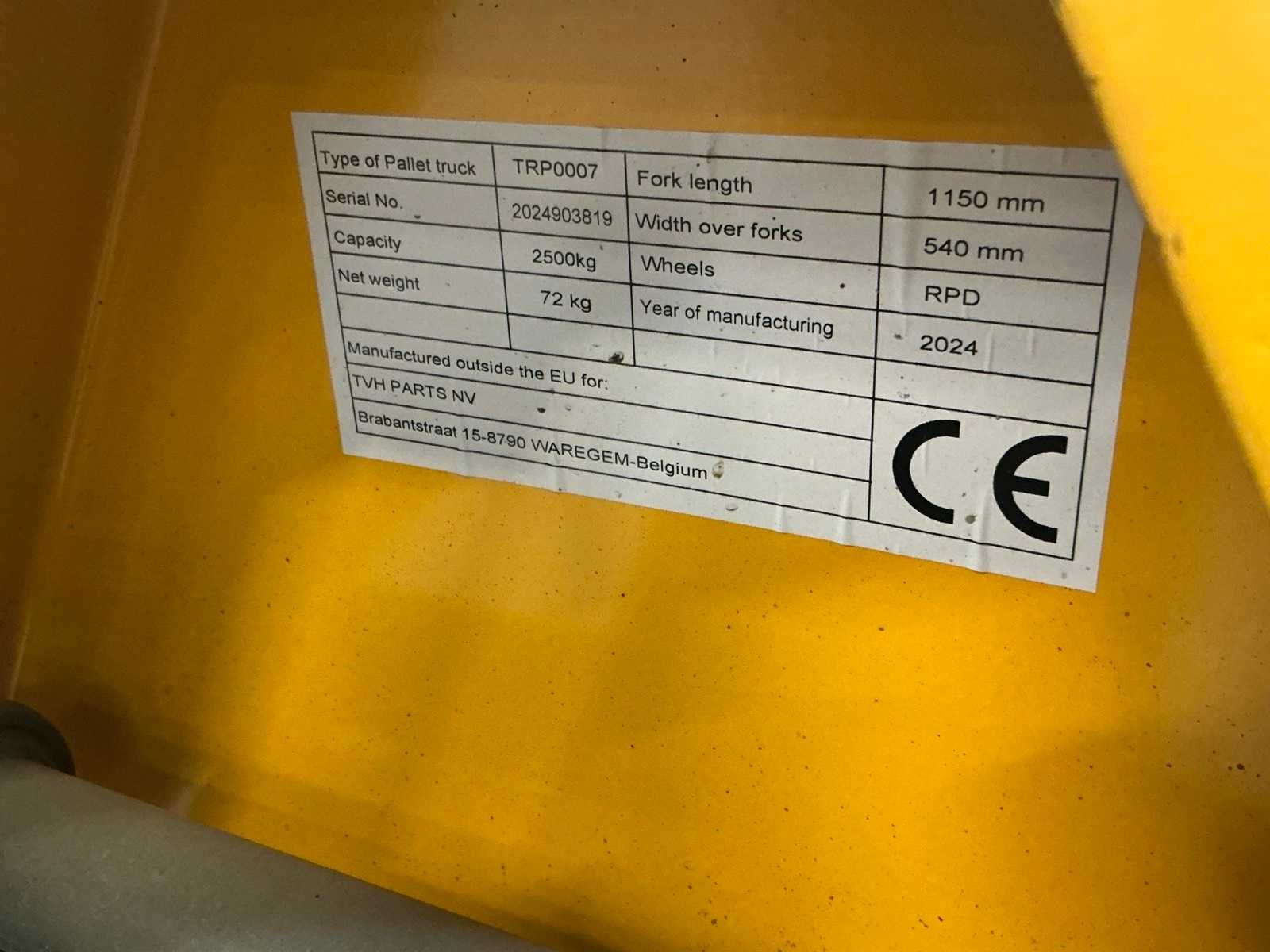 Hefhendelsysteem dient herstelt te worden. Nee Merk: Total Source Type: TRP0007 Bouwjaar: 2024 Hefvermogen: 2500kg Lepellengte: 1150mm Eigen gewicht: 72kg