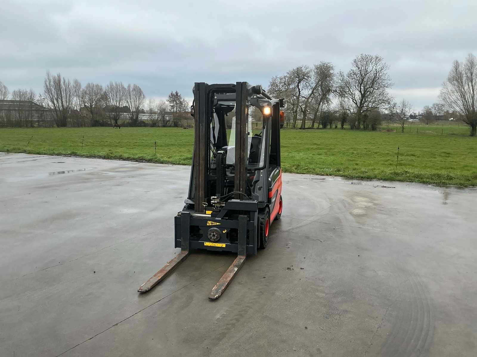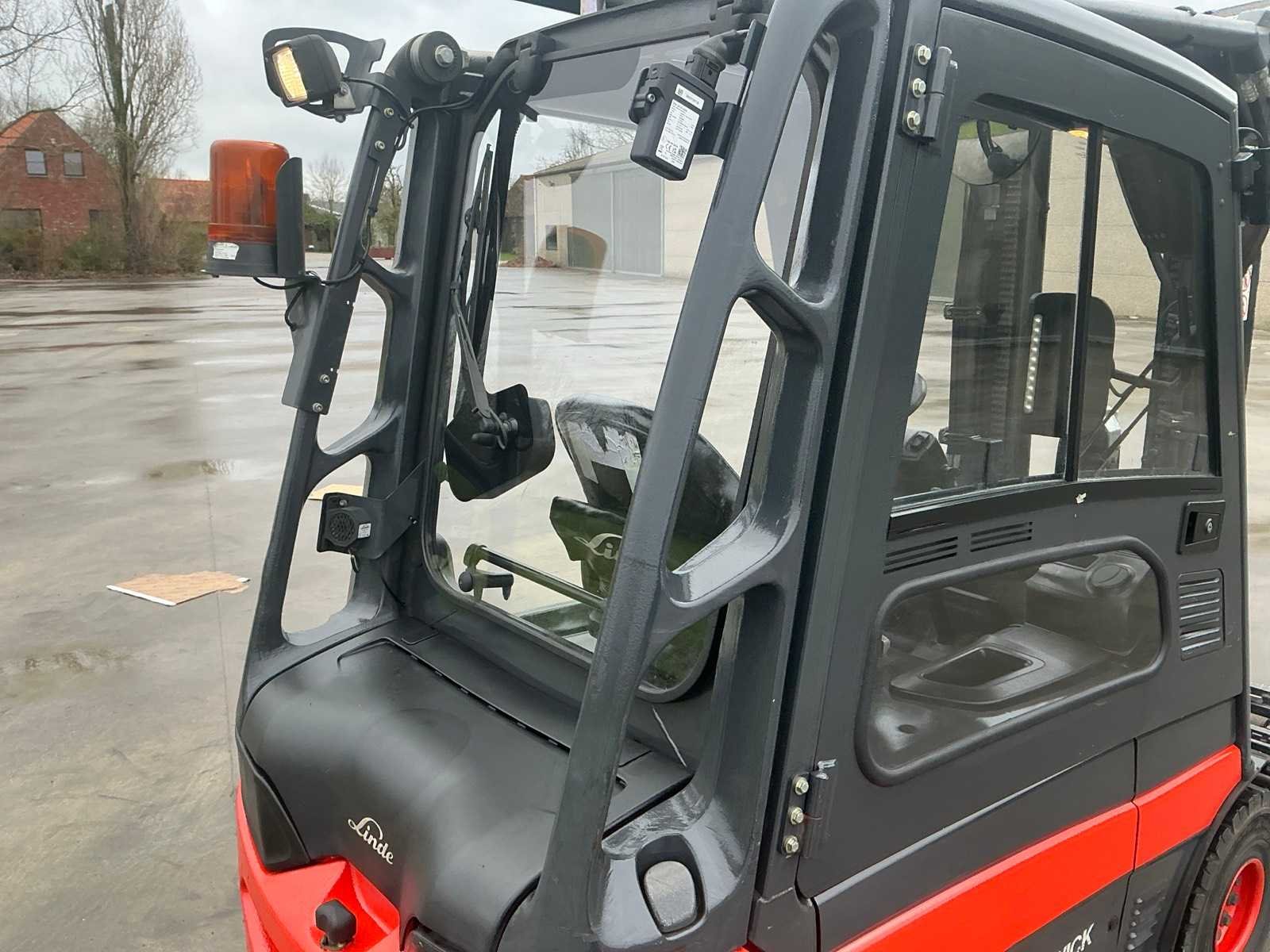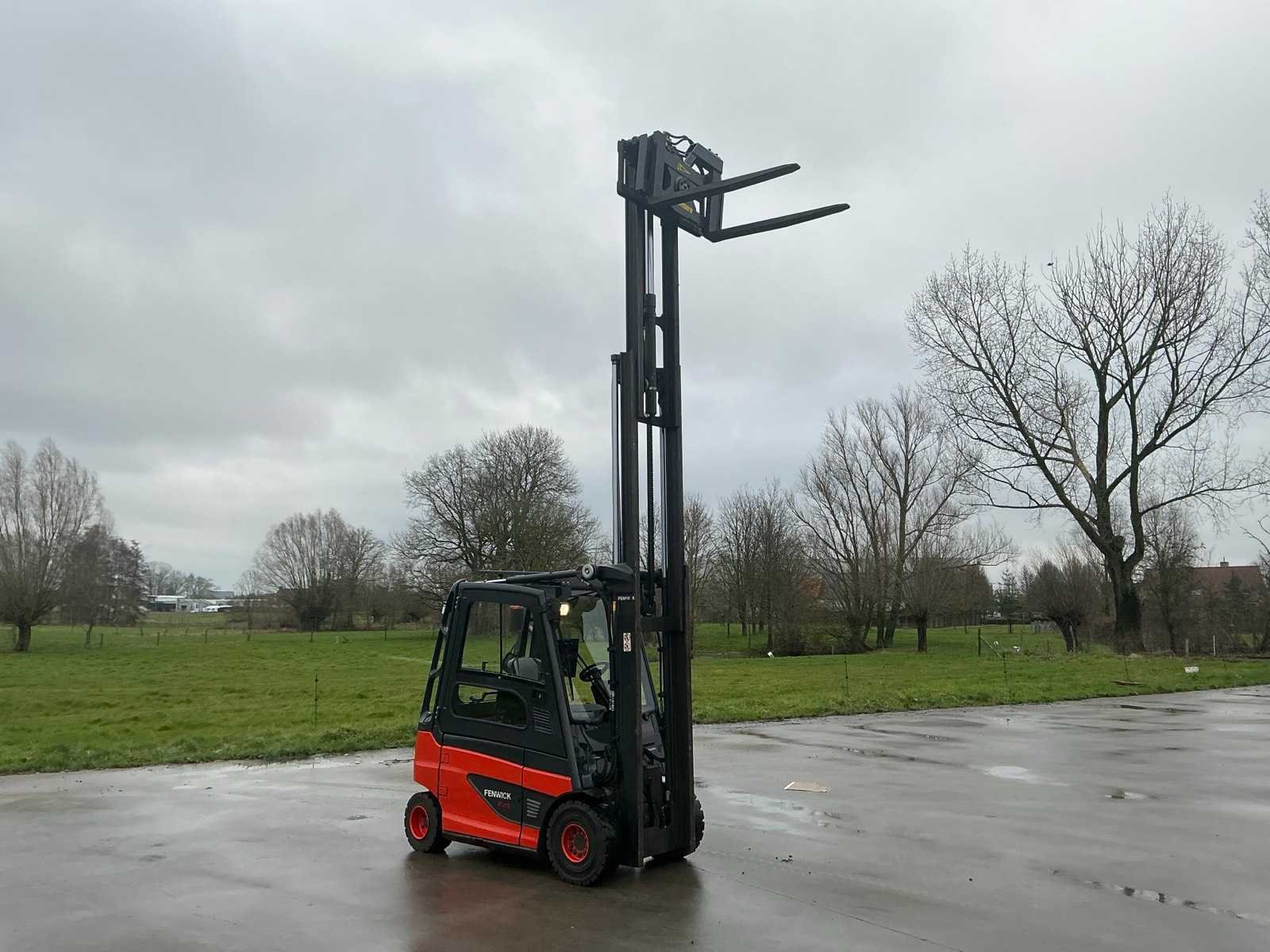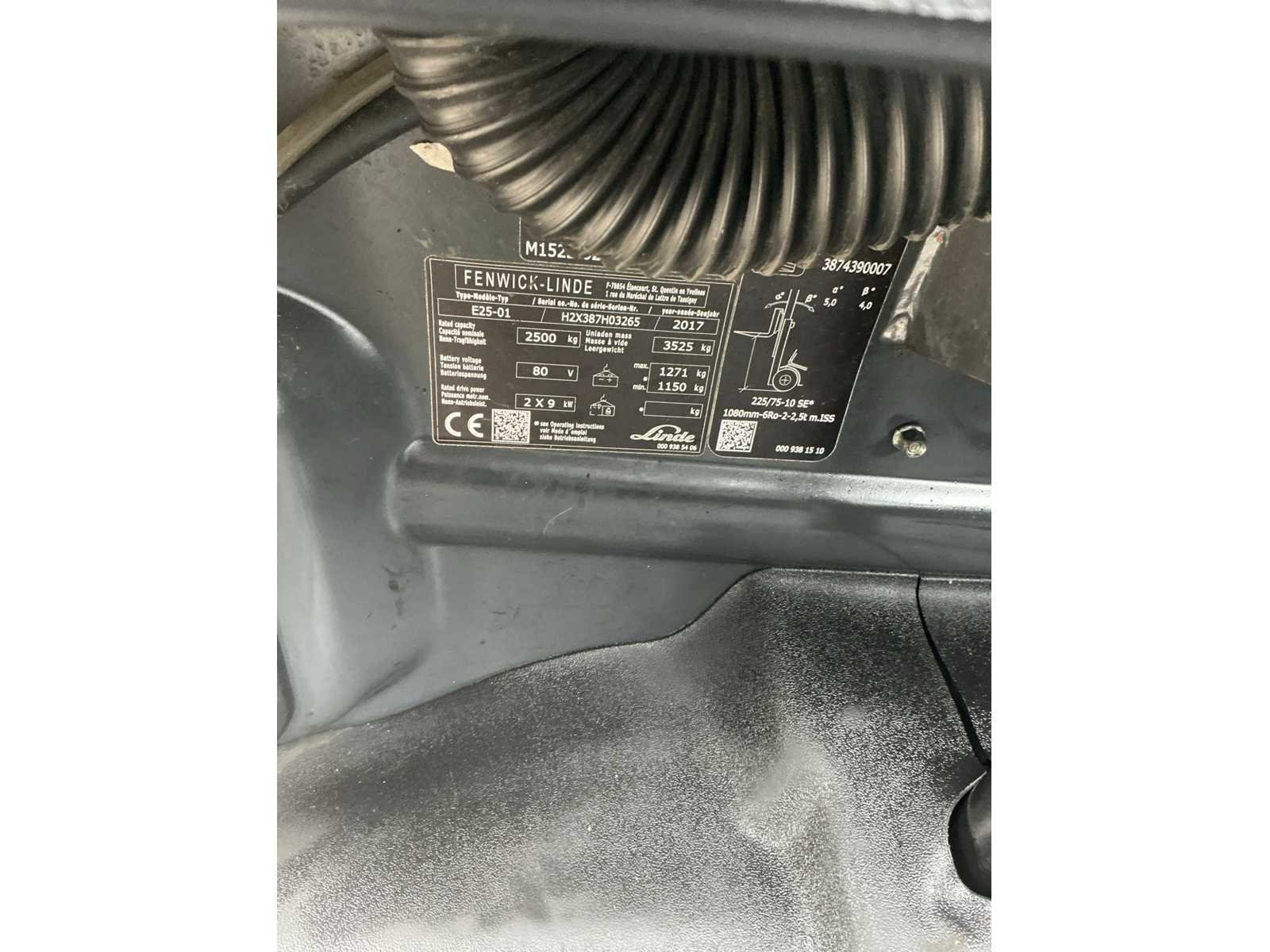 Accu met automatische vulling , zwaailicht , werklichten voor en achter , WIFO rotator , Recent nieuwe banden , 3de en 4de valve tot op vorkenbord , half gesloten verwarmde cabine Nee Merk: Linde Type: E25-01 Bouwjaar: 2017 Serienummer: H2X387H03265 Brandstof: Elektrisch Mast: Triple Soort band: Volrubber banden Aantal wielen: 4 Afgelezen urenstand: 4120 Side-shift: true Roterend vorkenbord: true Triple mast: true Eigen gewicht: 4650kg Hefvermogen: 2500kg Lepellengte: 1200mm Min. hefhoogte: 0mm Hefhoogte: 4760mm Vol rubber banden: true Totale afmeting L: 2500mm Totale afmeting Breedte: 1150mm Totale afmeting Hoogte: 2150mm Leveringsvoorwaarden: Gratis op vrachtwagen