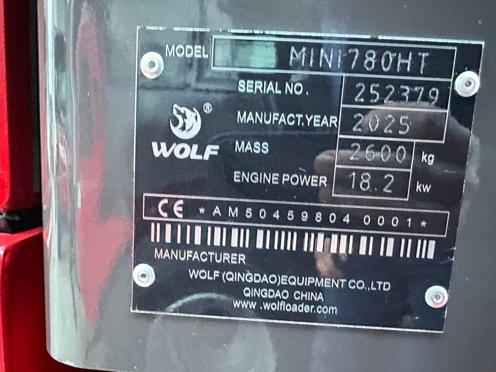 Hydraulische snelwissel Vorkenbord + bak Lepels 900mm Extra hydraulische functie Achteruitrij camera Gereedschapsbox Nieuw Nee Merk: Wolf Type: MINI 780HT Bouwjaar: 2025 Serienummer: 252379 Merk motor: Kubota Motorvermogen (kW): 18.2kW Aantal cilinders: 4 Brandstof: Diesel Graafbak afm. b: 1600mm Bandenmaat: 31x15.5-15 Afgelezen urenstand: 0 Eigen gewicht: 2600kg Totale afmeting L: 4530mm Totale afmeting Breedte: 1500mm Totale afmeting Hoogte: 2300mm