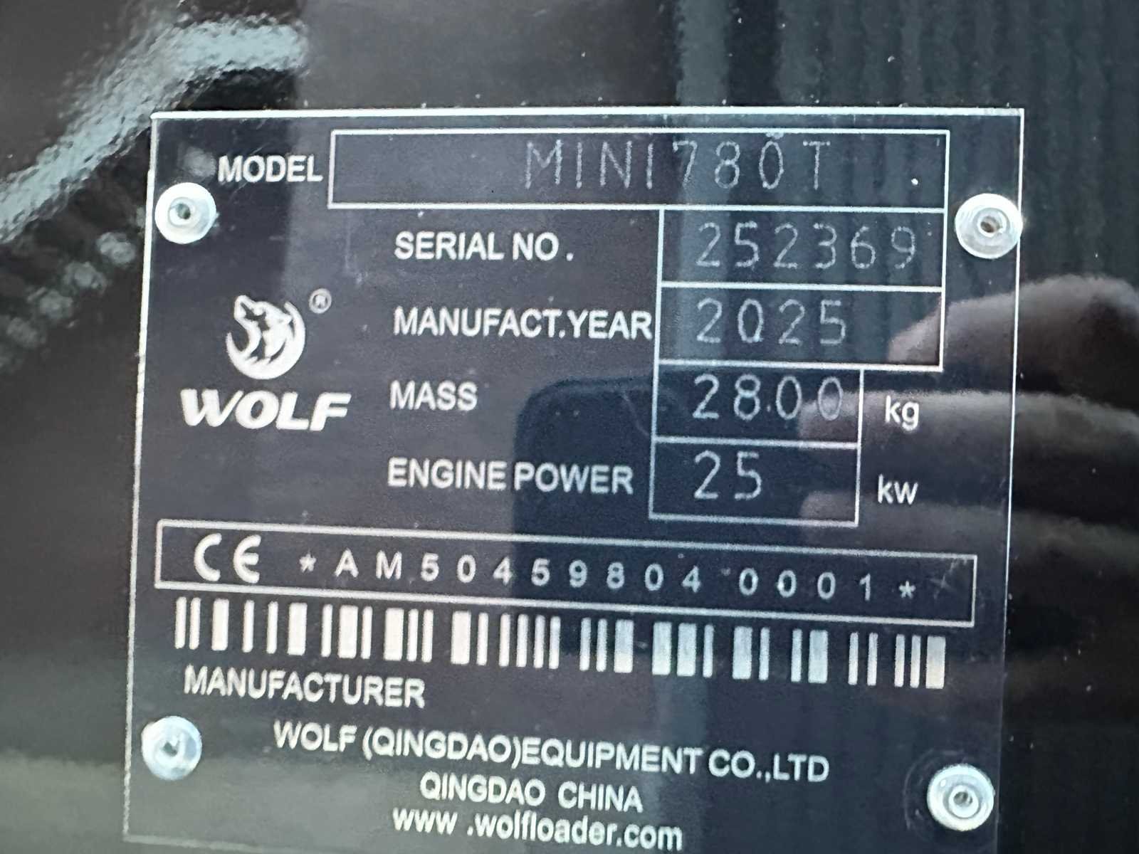 -Hydraulische snelwissel -Vorkenbord + bak -Lepels 900mm -Extra hydraulische functie -Achteruitrij camera -Gereedschapsbox -Nieuw Nee Merk: Wolf Type: MINI 780T Bouwjaar: 2025 Serienummer: 252369 Merk motor: Changchai ZN390 Motorvermogen (kW): 25kW Aantal cilinders: 3 Brandstof: Diesel Graafbak afm. b: 1600mm Bandenmaat: 31x15,5-15 Afgelezen urenstand: 0 Eigen gewicht: 2800kg Totale afmeting L: 4500mm Totale afmeting Breedte: 1550mm Totale afmeting Hoogte: 2500mm