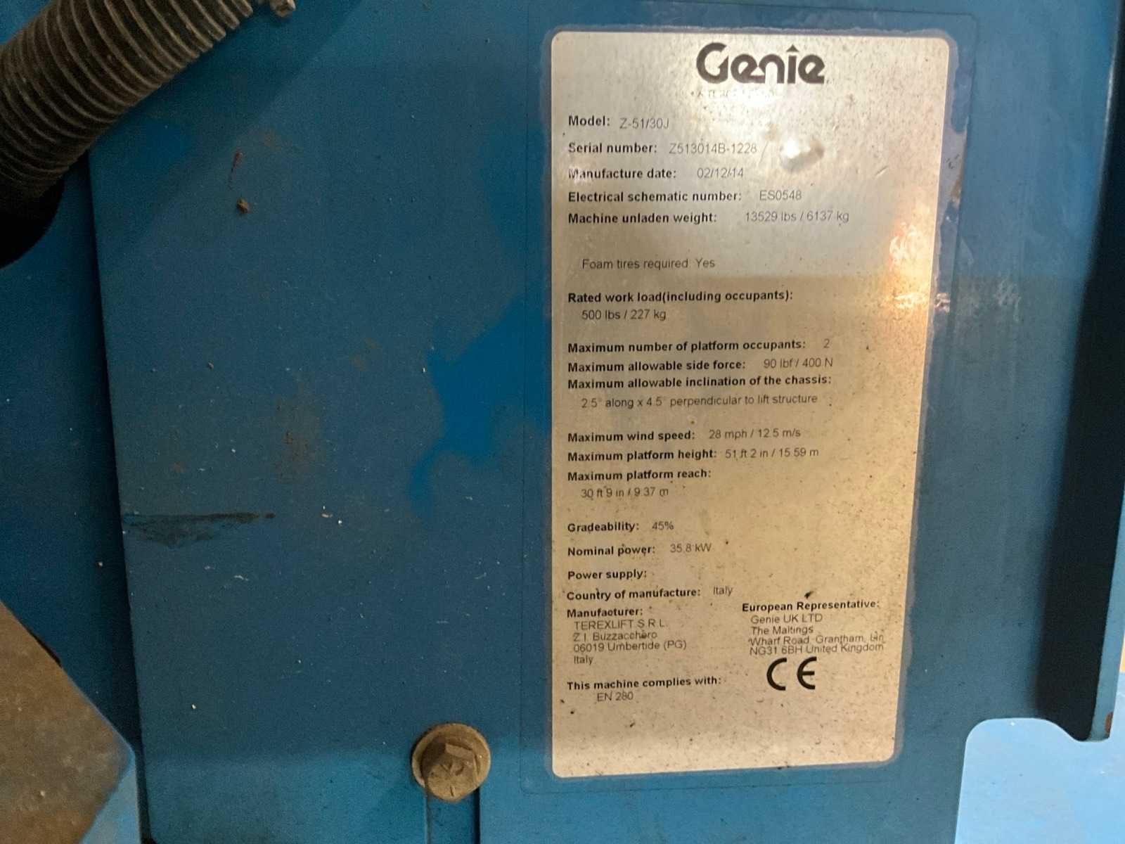 • sleutel aanwezig • gebruikssporen No Merk: Genie Type: Z-51/30J Bouwjaar: 2014 Serienummer: Z513014B-1228 Diesel: true Motorvermogen (kW): 35.8kW Knikarm hoogwerker: true Werkhoogte: 15590mm Horizontale rijkwijdte: 9370mm Plateau afm. l: 1750mm Plateau afm. b: 700mm Platform capaciteit: 227kg Afgelezen urenstand: 2611 Eigen gewicht: 6137kg Totale afmeting Breedte: 2350mm