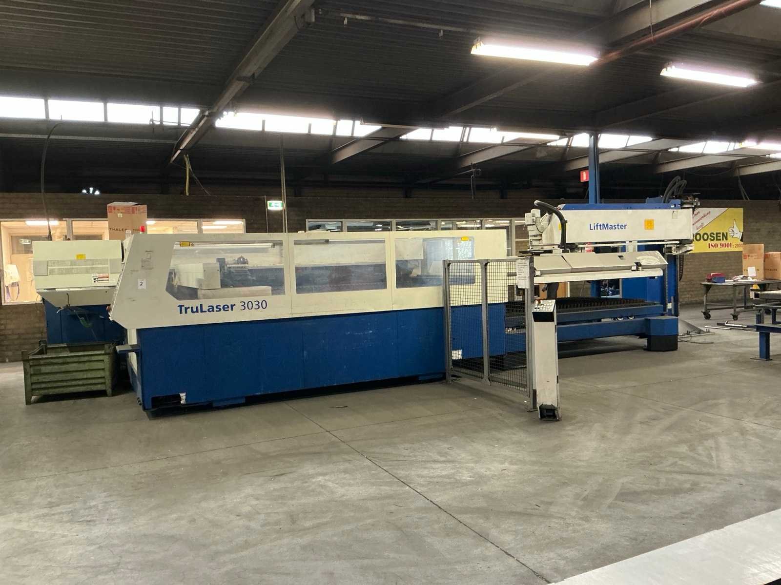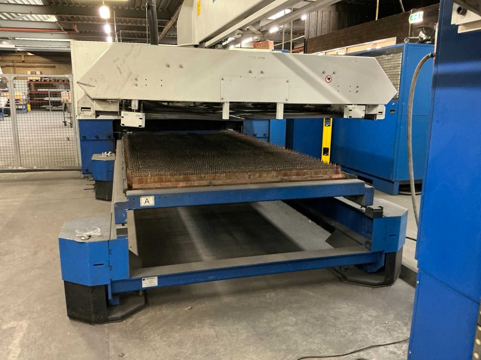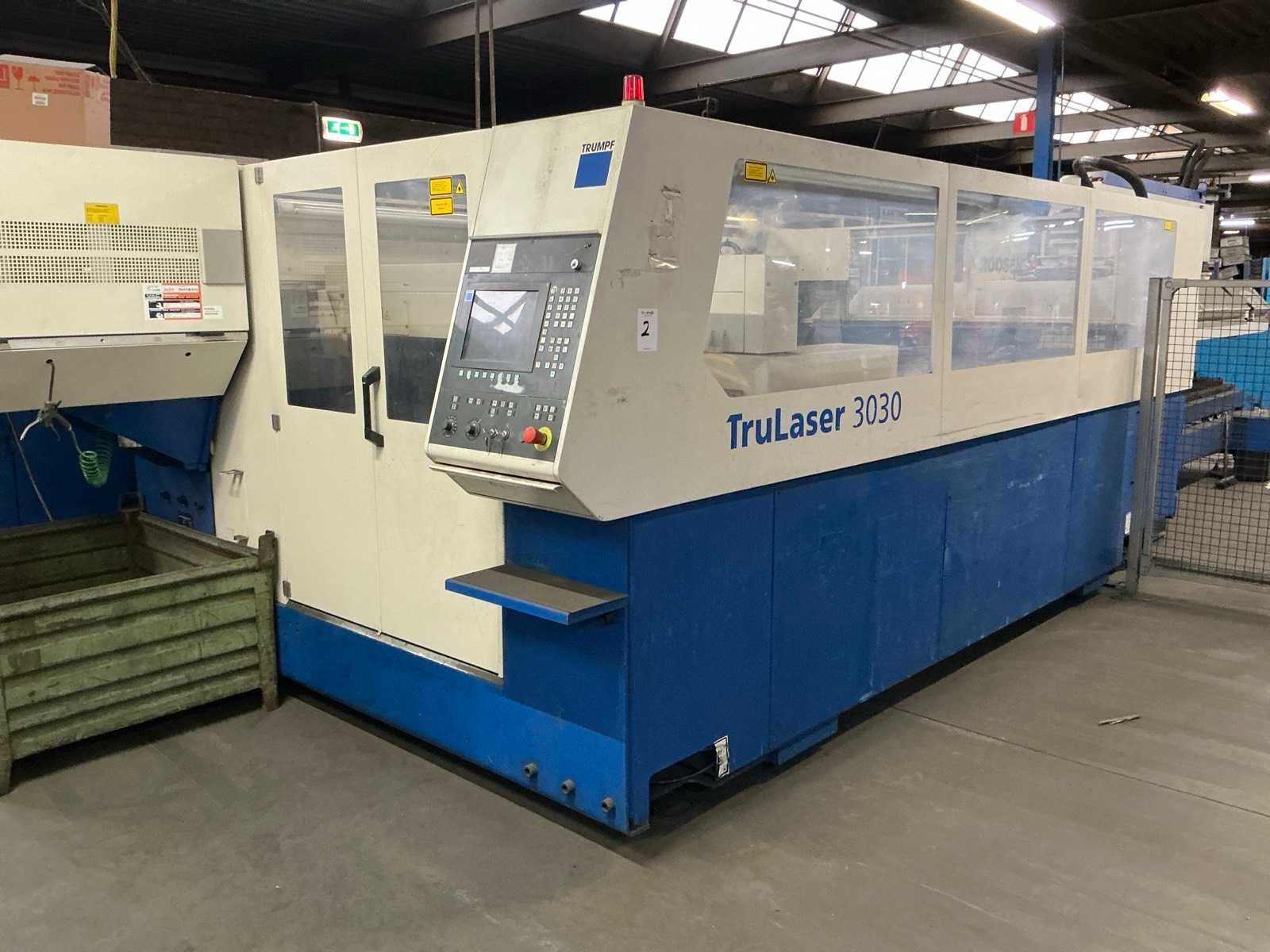 Lasermodule Truflow 4000; aansluitvermogen 88 kVA; maximale dikte staal 20 mm, maximale dikte roestvrij staal 15 mm, maximale dikte aluminium 20 mm, positionering 0,1 mm; Riedel koelunit; Trumpf Liftmaster platenhandler; voorraadtafel voor plaatmateriaal 3100x1650x500 mm; urenstand onbekend. Defect aan scherm, module en koelventilator. Nee Merk: Trumpf Type: Trulaser 3030 Bouwjaar: 2008 Serienummer: A0220A2444 Laservermogen: 4kW Werkbereik x: 3000mm Werkbereik y: 1500mm Werkbereik z: 110mm Snijsnelheid: 140m/min Tafel afmeting l: 3000mm Aansluitwaarde: 160A Aansluiting: 400V Machinegewicht: 12000kg Afmeting l: 3000mm Afmeting b: 8700mm Afmeting h: 2200mm