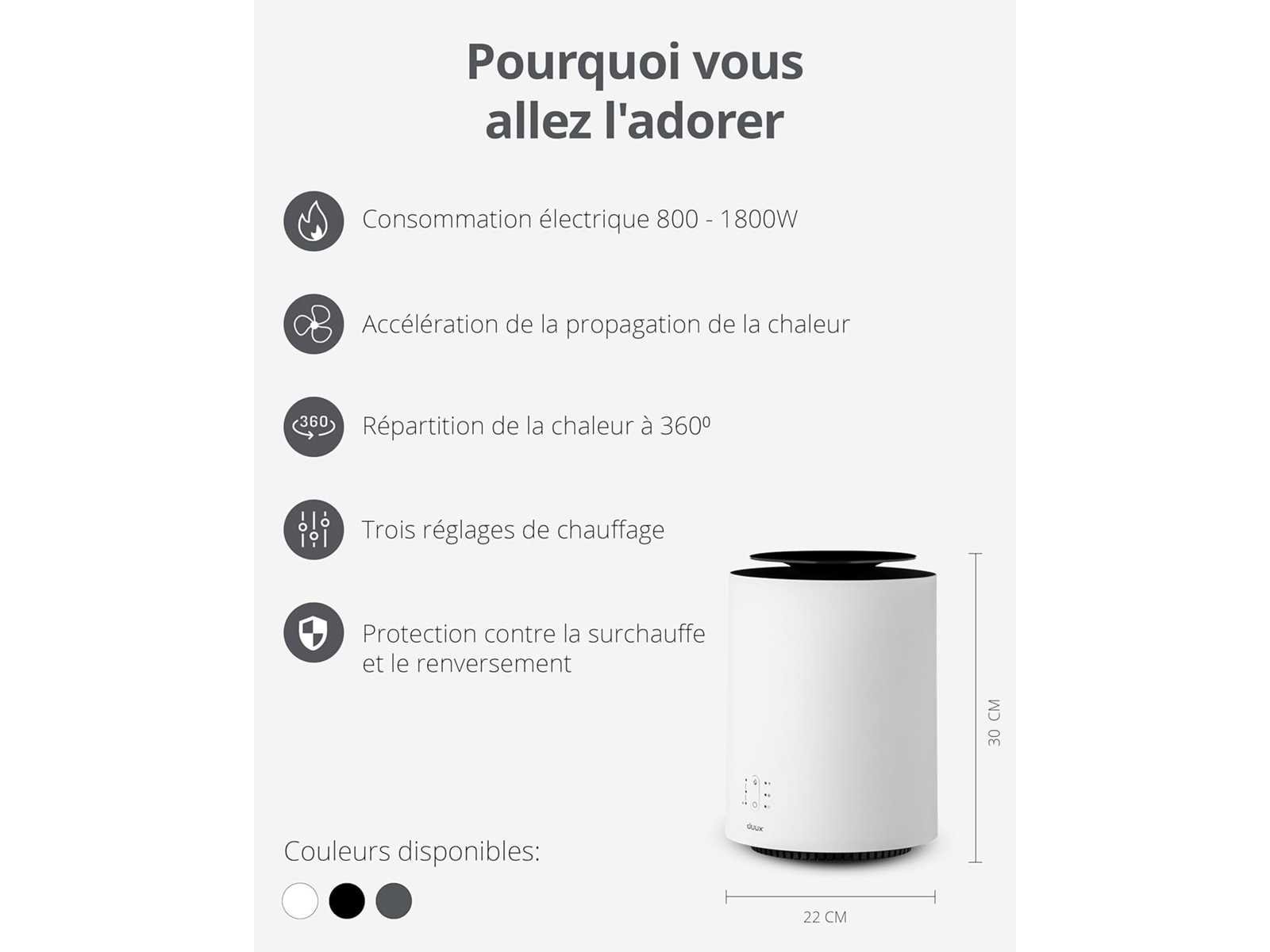 Merk Duux Speciale Feature Quiet Kleur Wit Torenvormfactor Binnen/Buiten Gebruik Binnen Stroombron Stroomkabel Stralingsverwarmingsmethode Productafmetingen: 21,5D x 21,5W x 29,5H centimeter Aanbevolen toepassingen voor herlaadbare Montagetype Vloerbevestiging Bekijk meer Over dit artikel COMFORT GEGARANDEERD - Onze eenvoudige elektrische verwarming is de perfecte metgezel voor koude en donkere dagen. Dankzij de uitstekende prestaties biedt het u en uw dierbaren betrouwbare beveiliging en een sfeer waarin iedereen zich op zijn gemak voelt. SNELLE VERWARMING - Met 1800W vermogen warmt onze keramische verwarming je in recordtijd op. In boostmodus kan hij een kamer van 30 m² twee keer zo snel verwarmen als een gewone elektrische kachel dankzij het efficiënte PTC-verwarmingselement. INNOVATIEVE 360° TECHNOLOGIE - Met 3 verwarmingsinstellingen en 2 ventilatiestanden (ECO & BOOST) biedt de Threesixty keramische verwarming veel opties voor perfecte temperatuurregeling. De luchtuitlaat zorgt voor een gelijkmatige warmteverdeling van 360°. BEDIENING MET SMARTPHONE-APPARAAT - Gebruik bijvoorbeeld de knoppen van deze keramische verwarming of gebruik de app om de temperatuur te regelen. Modern ontwerp en indrukwekkende prestaties - Daarnaast is de keramische ventilatorkachel energiezuinig. Non