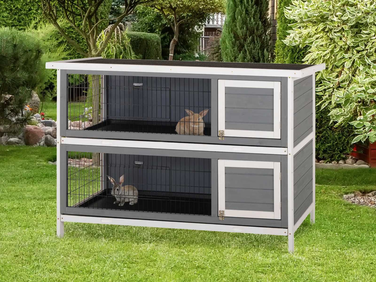 Een kast van twee verdiepingen, groot model, houten kooi voor konijnen, kippen en eenden