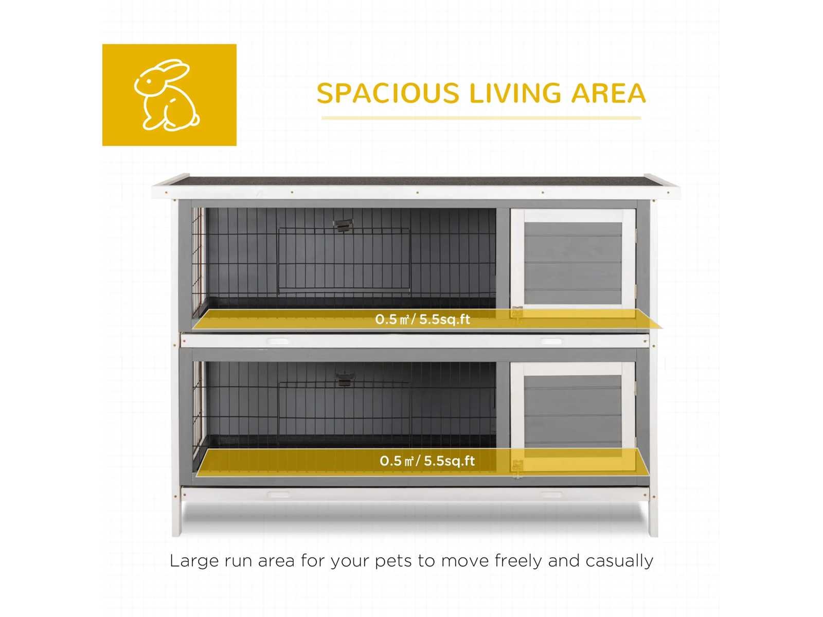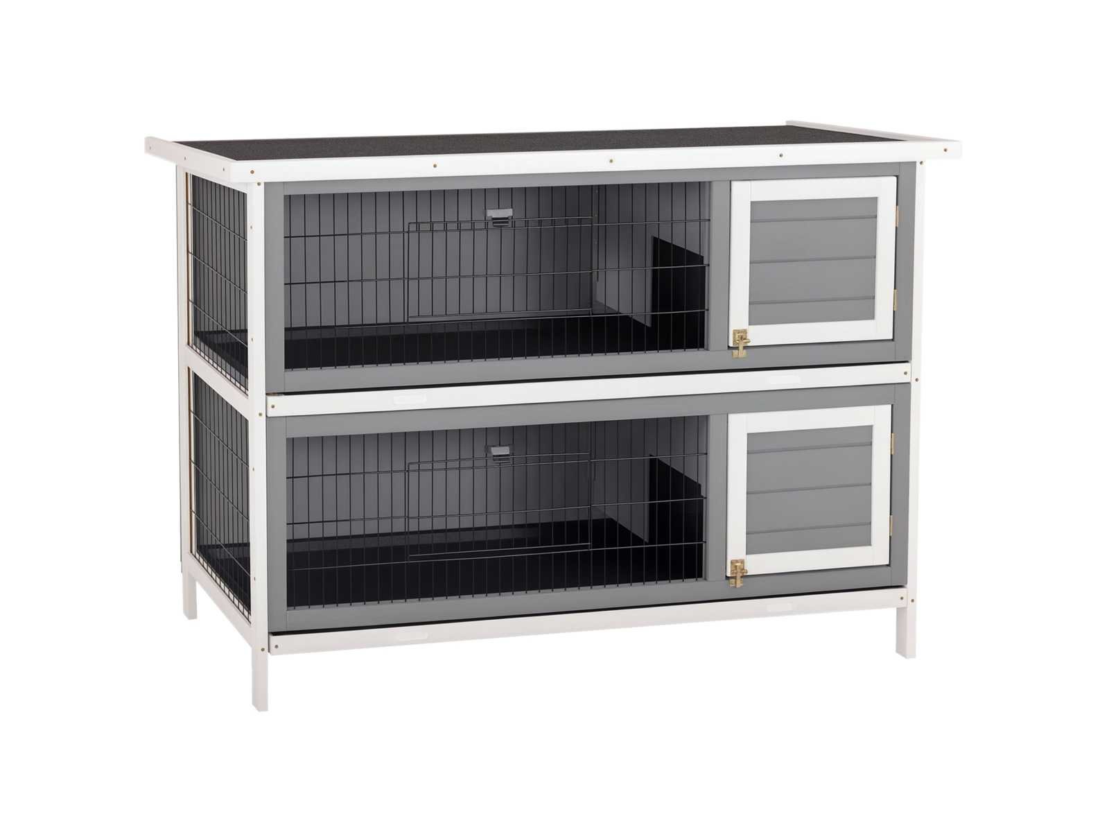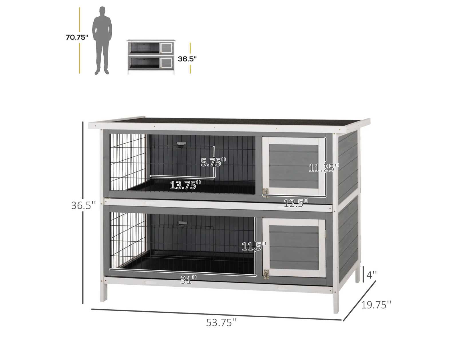 Specificatie: - Kleur: Donkergrijs - Materialen: Sparrenhout, draad Totale afmetingen: 53,75"L x 19,75"B&B x 36,5"H - Afmetingen van de binnenkooien: 122 cm (L) x 42 cm (B) x 36 cm (H) - Gaasdeuren: 34,9 cm (B) x 14,6 cm (H) - Houten deuren: 31,75 cm (B) x 28,6 cm (H) - Beenhoogte: 10 cm - Onderste bak: 121,3 cm (B) x 41,9 cm (H) - Montage vereist Non