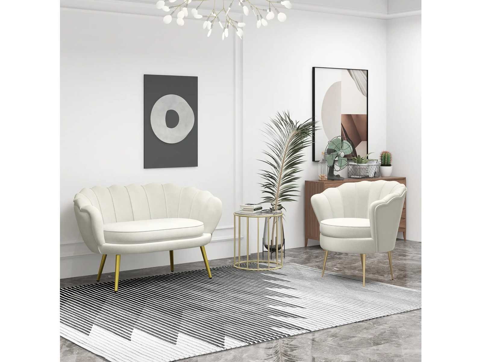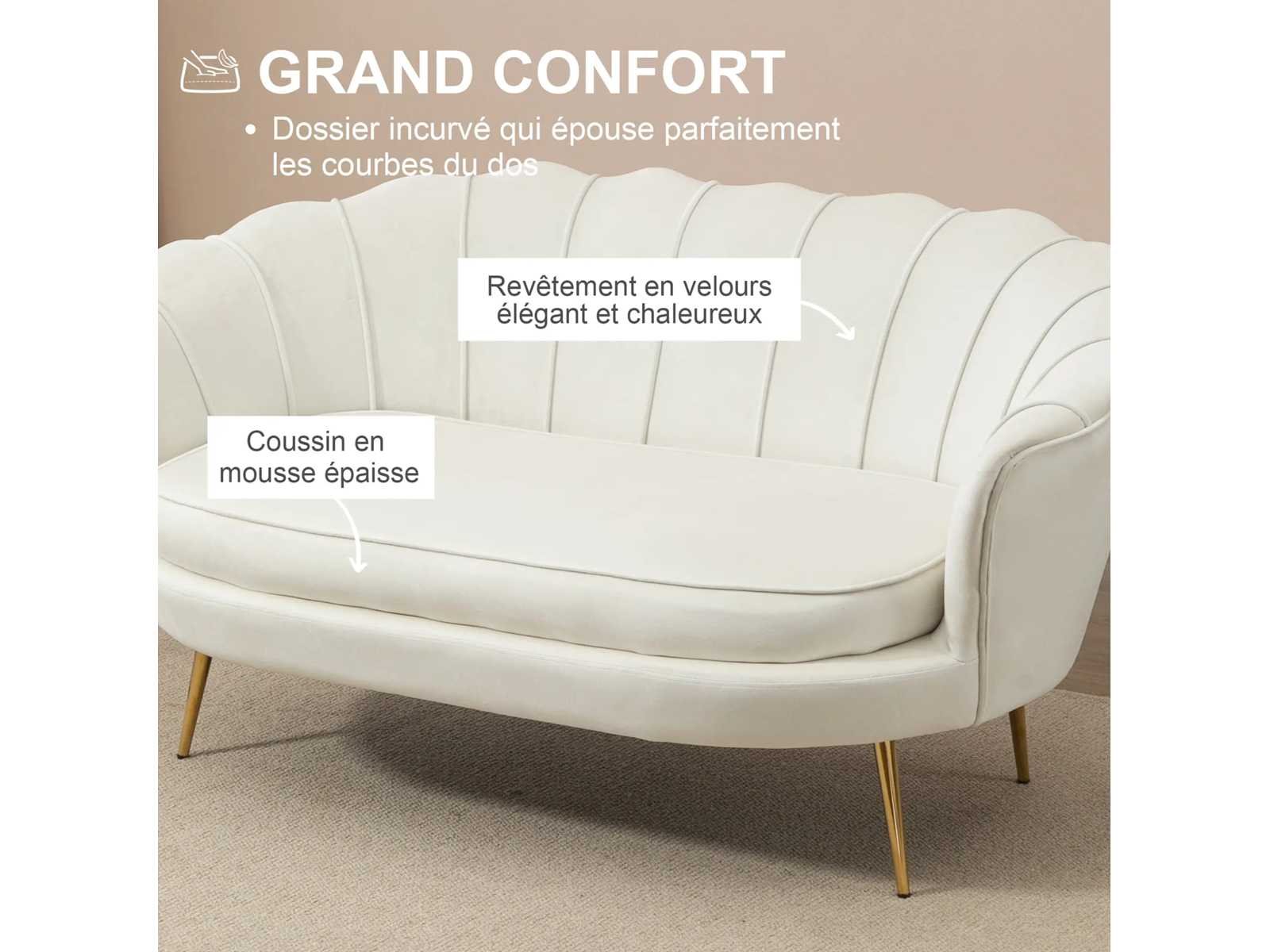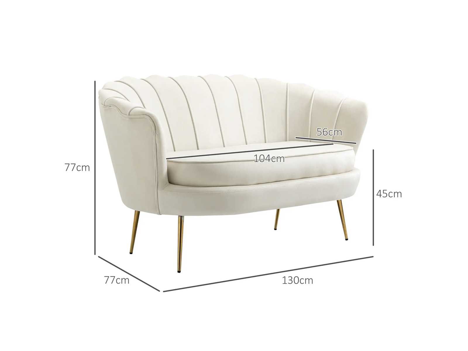 Specificaties: - Kleur: crème - Materialen: fluweel (100% polyester), schuimvulling, metaal - Sun. totaal: 130B x 77D x 77H cm - Sun. Zitplaats: 104B x 56D x 45H cm (dikte: 10 cm) - Sun. Rugleuning: 96B x 32H cm (tot aan de zitting) - Armleuninghoogte: 63 cm (tot de vloer) - Armleuningdikte: 10 cm - Beenhoogte: 23 cm - Aanbevolen maximale belasting: 150 kg Non