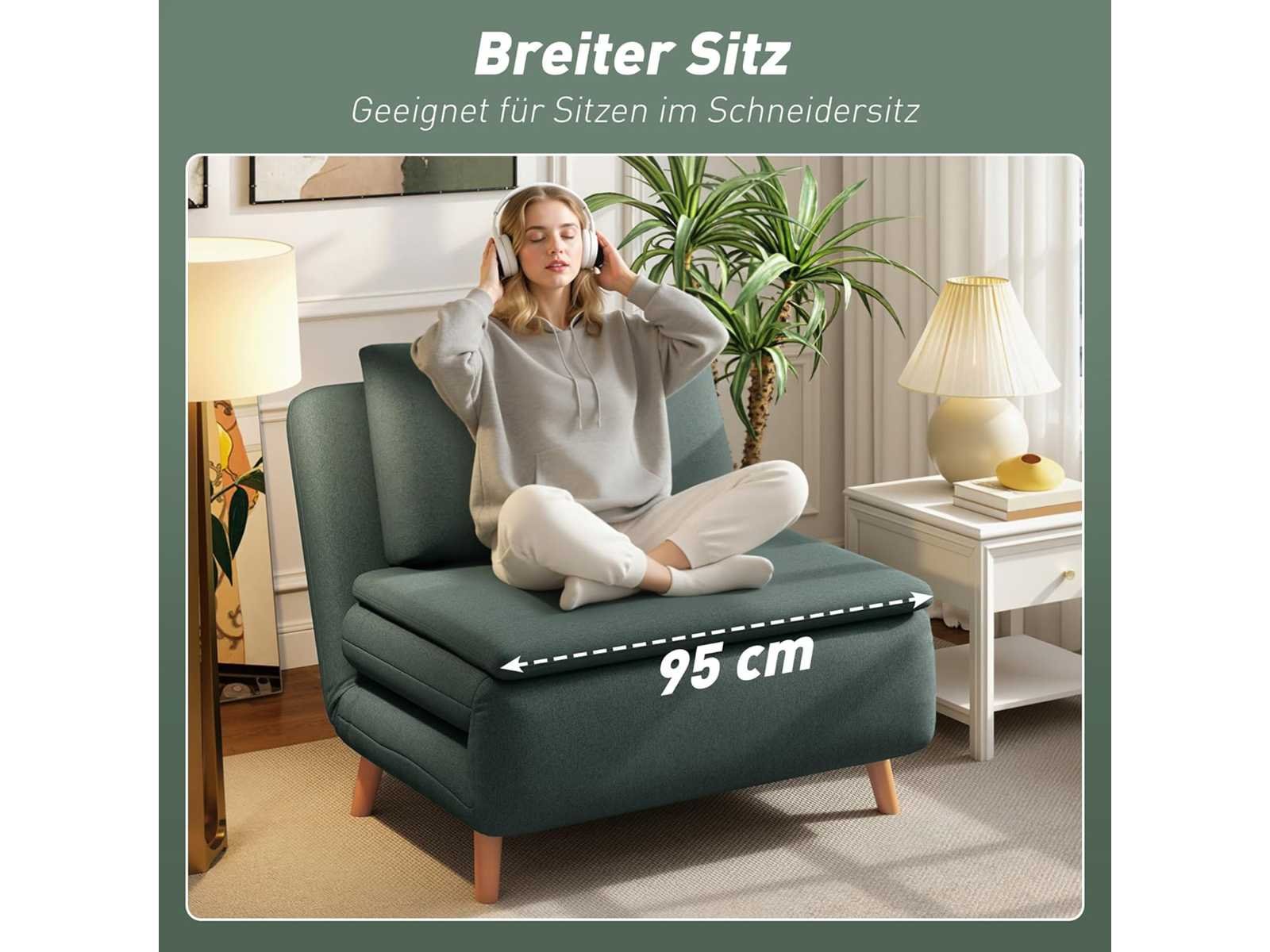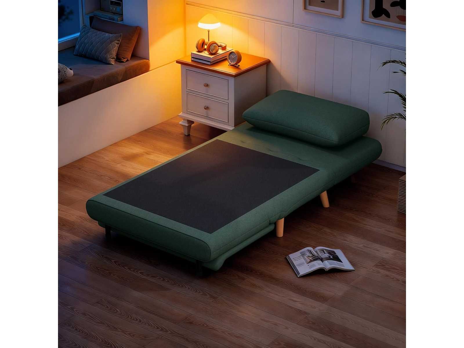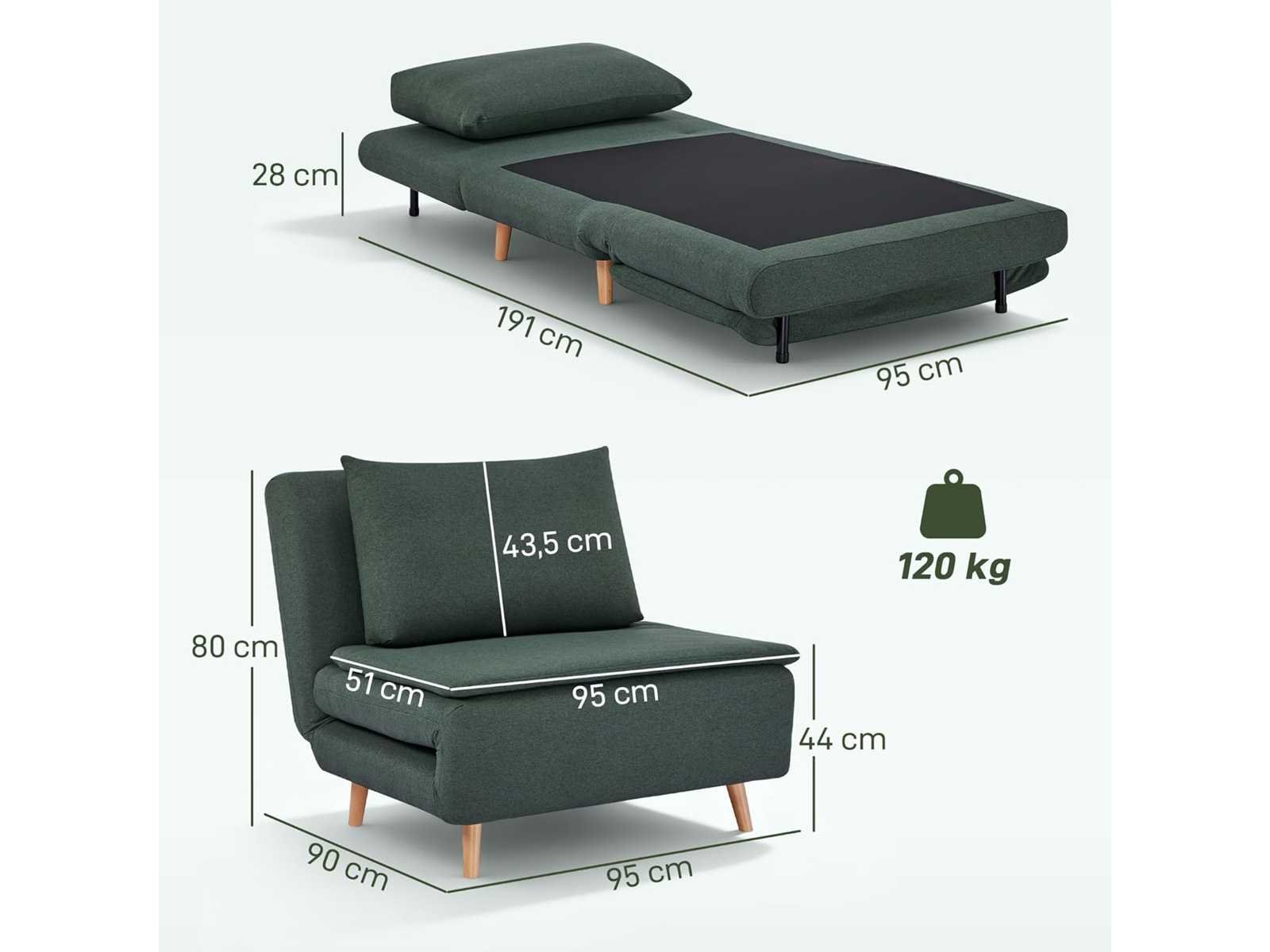 3-IN-1 ONTWERP Deze ombrendebare stoel kan moeiteloos worden omgezet in een comfortabele stoel, chaise longue of uitklapbaar bed met het eenvoudige slaapbanksysteem, ideaal voor kleine appartementen, logeerkamers of werkruimtes. RUIME RUIMTE Gebruikt als een 95 cm brede armloze fauteuil of als ruim bed van 191 x 95 cm, biedt dit fauteuilsbed een comfortabele plek om met opgevouwen benen te zitten of kan omgebouwd worden tot een queensize bed om voorbijgangers te huisvesten. VERSTELBARE RUGLEUNING Kies je voorkeurshouding uit drie standen: volledig plat voor een dutje, licht achterover om te ontspannen, of zittend, ideaal om te werken. ONTSPANNING EN COMFORT Dompel jezelf onder in het comfort van het dubbellaagse kussen van de klapstoel, gevuld met hoogdicht, veerkrachtig schuim en 30 cm dikke vulling bij de zitting en 14 cm bij de rugleuning, bekleed met een ademend jute-achtige stof en afgemaakt met een kussen. ROBUUSTE CONSTRUCTIE Gemaakt met massieve beukenpoten, garandeert dit duurzame fauteuilsbed stabiliteit en veiligheid in het dagelijks leven met een laadcapaciteit tot 120 kg. Non