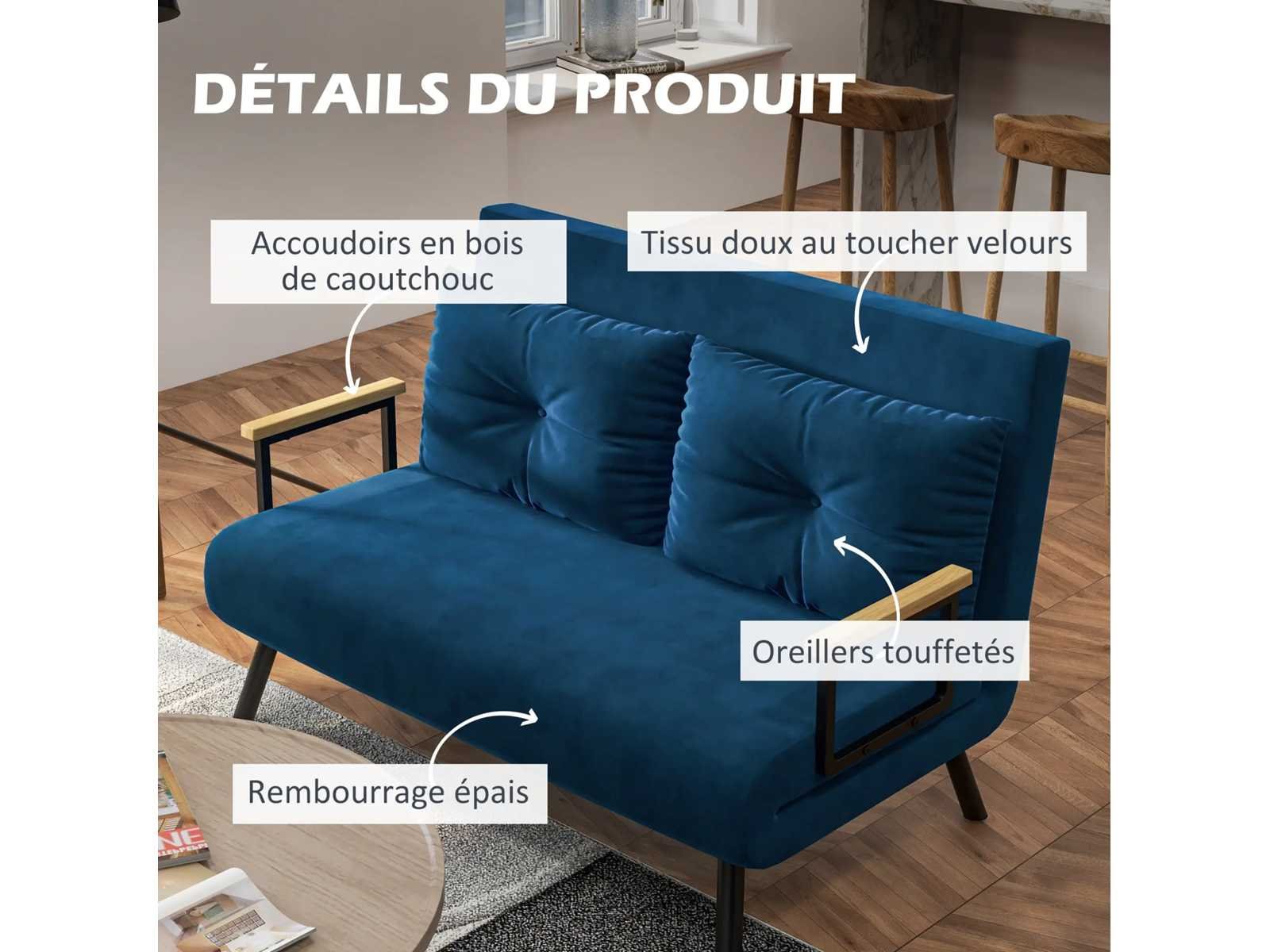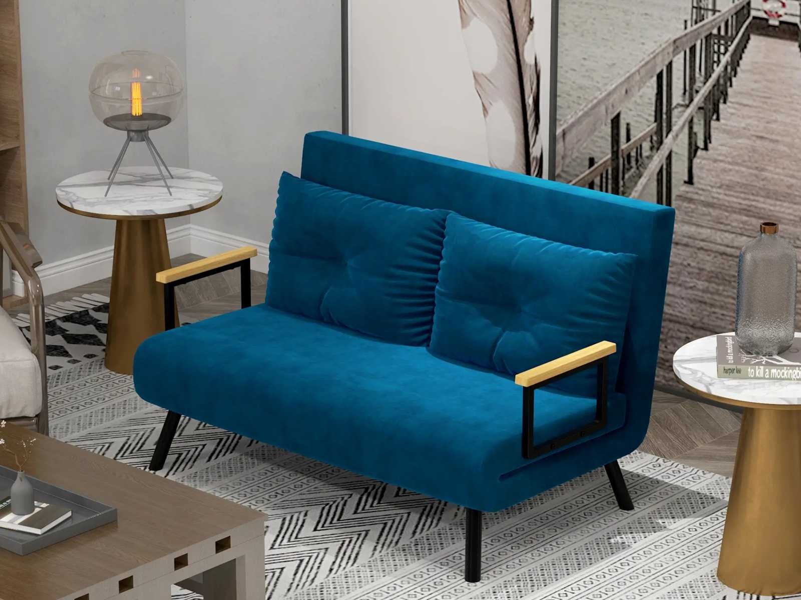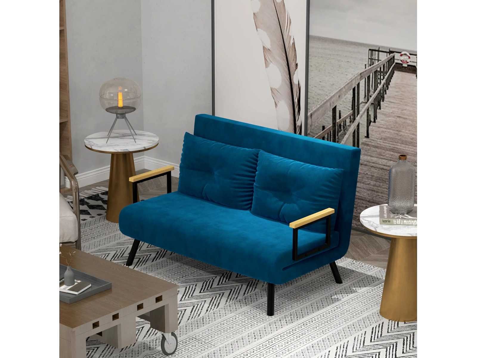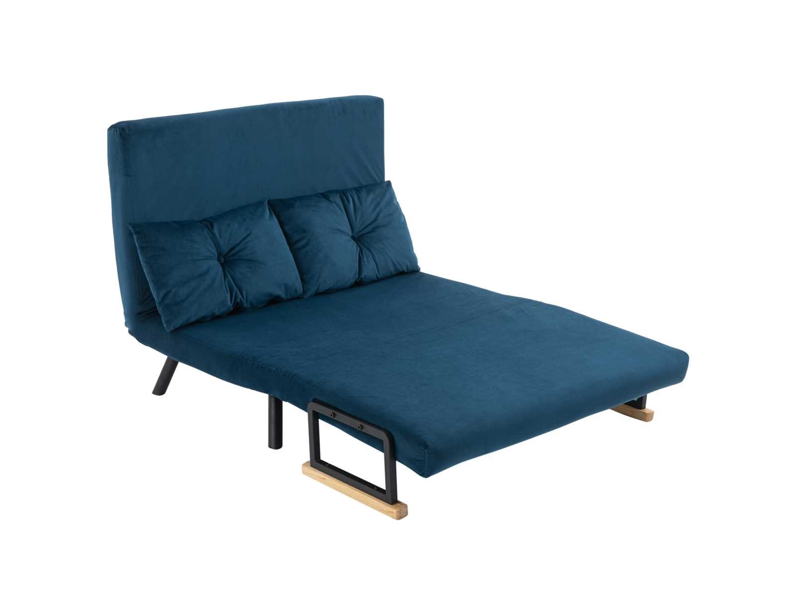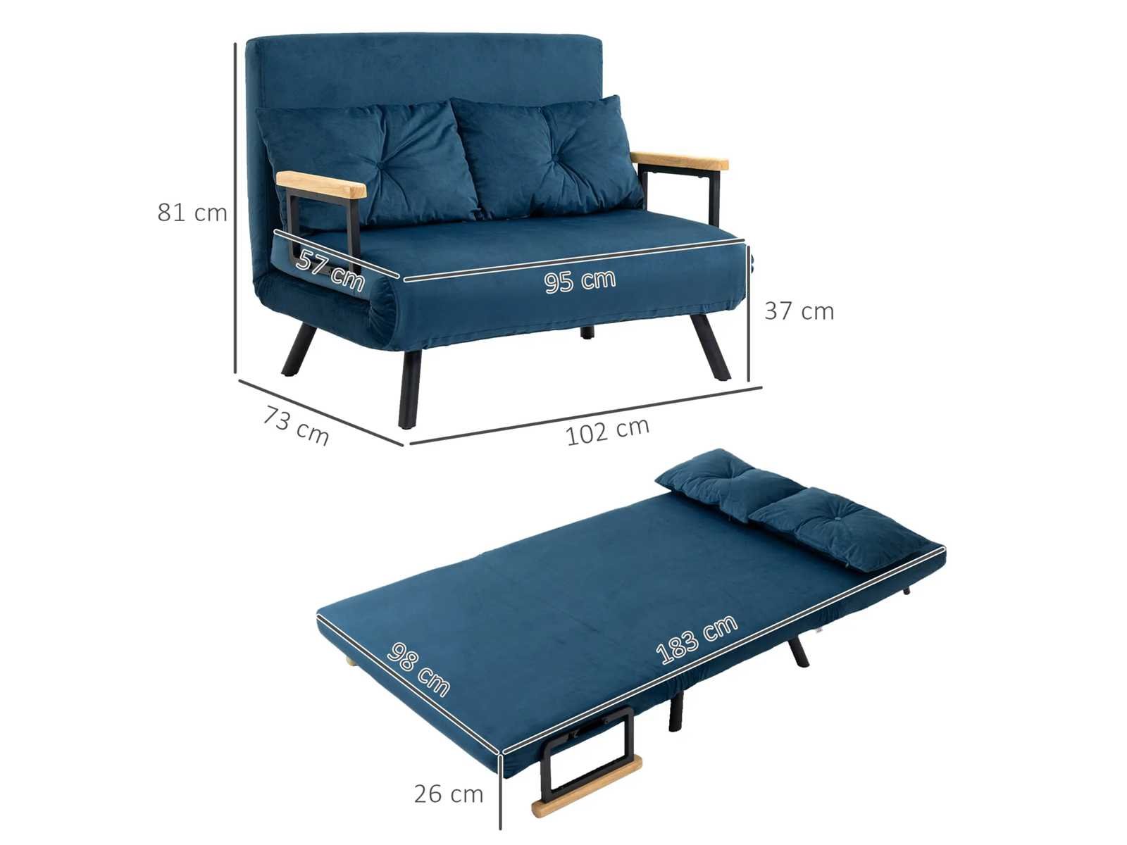 Specificaties: - Kleur: Blauw - Materiaal: staal, schuimvulling, fluweelachtige stof (100% polyester), rubberhout - Bankafmetingen: 102B x 73D x 81H cm - Bedafmetingen: 183B x 98,5D x 26H cm - Zitafmetingen: 95B x 57D x 37H cm - Zitdikte: 20 cm - Laadbakoppervlak: 183L x 98B x 9H cm - Rugsteunafmetingen: 48L x 98B x 9H cm - Dempingsafmetingen: 50L x 33B x 11H cm - Armleuningsafmetingen: 36L x 3,5 cm - Armleuninghoogte: 15 cm (ten opzichte van de zitting) - Aanbevolen maximale belasting: 120 kg Non