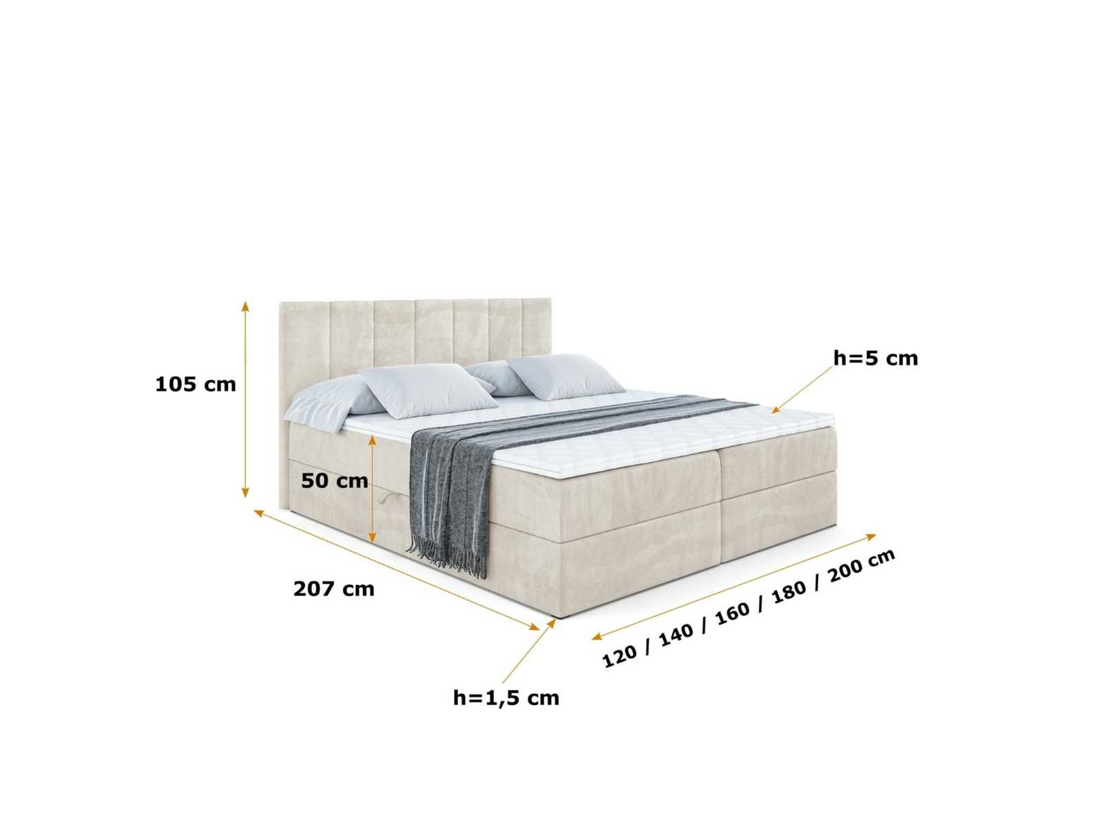 Materiaal Hout Fluwelen relatie Kleur Casablanca Beige Slaapkamer Moderne stijl Lengte 207 cm Breedte 160 cm Hoogte 105 cm Afmetingen 160 x 200 cm Lengte van het slaapgebied 200 cm Breedte van het slaapgebied 160 cm Liggende hoogte 55 cm stevigheid van het H3-matras Matrashoogte 20 cm matras Bonell veervering Topkleur: Wit Hoedhoogte 5 cm Schuimmatras toppermateriaal Bed Box Ja Aantal bedbakken 2 Hoogte van de bodem 30 cm Hoofdeinde hoogte 105 cm Materiaal van de plastic voeten Beenhoogte 2 cm Hoofdbord dikte 8 cm Dikte van de voetsectie 7 cm Opgevulde rug Nee H3-matras: Bonnell veerkern en PUR-schuim – ideaal voor wie een iets zachter en elastischer slaapgevoel prefereert (vooral geschikt voor lichte of zijslapers). Non