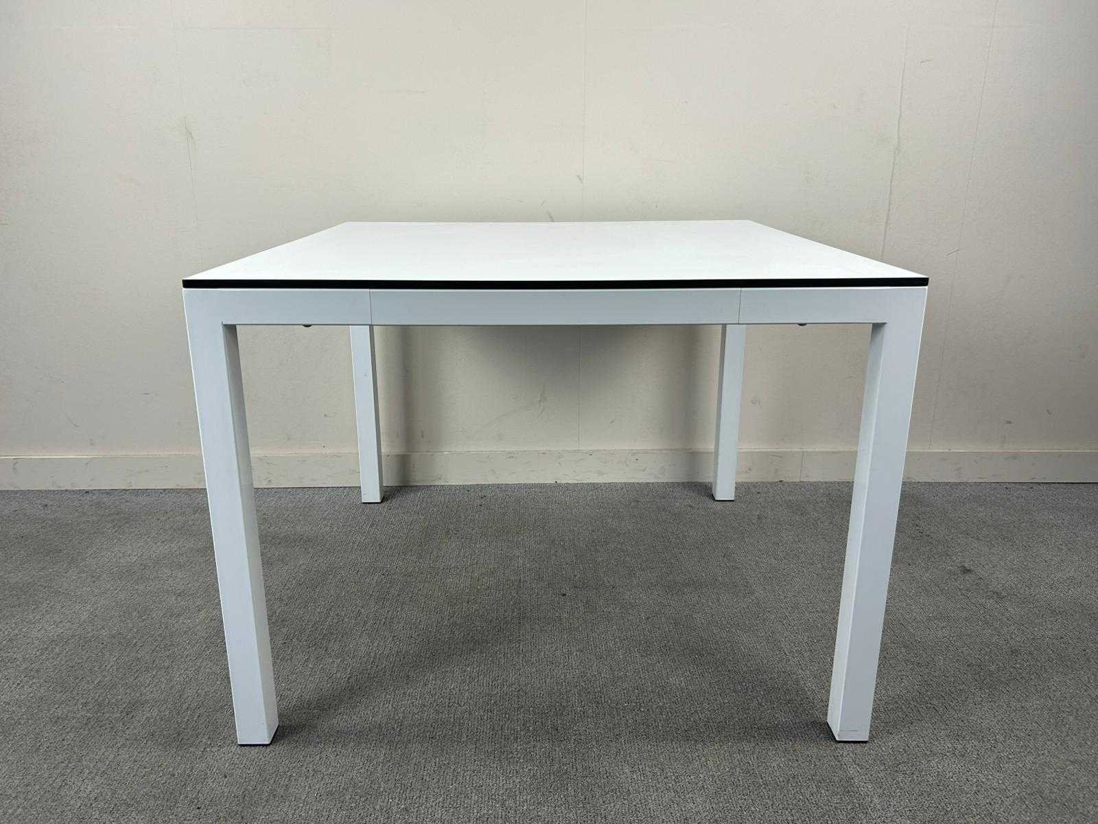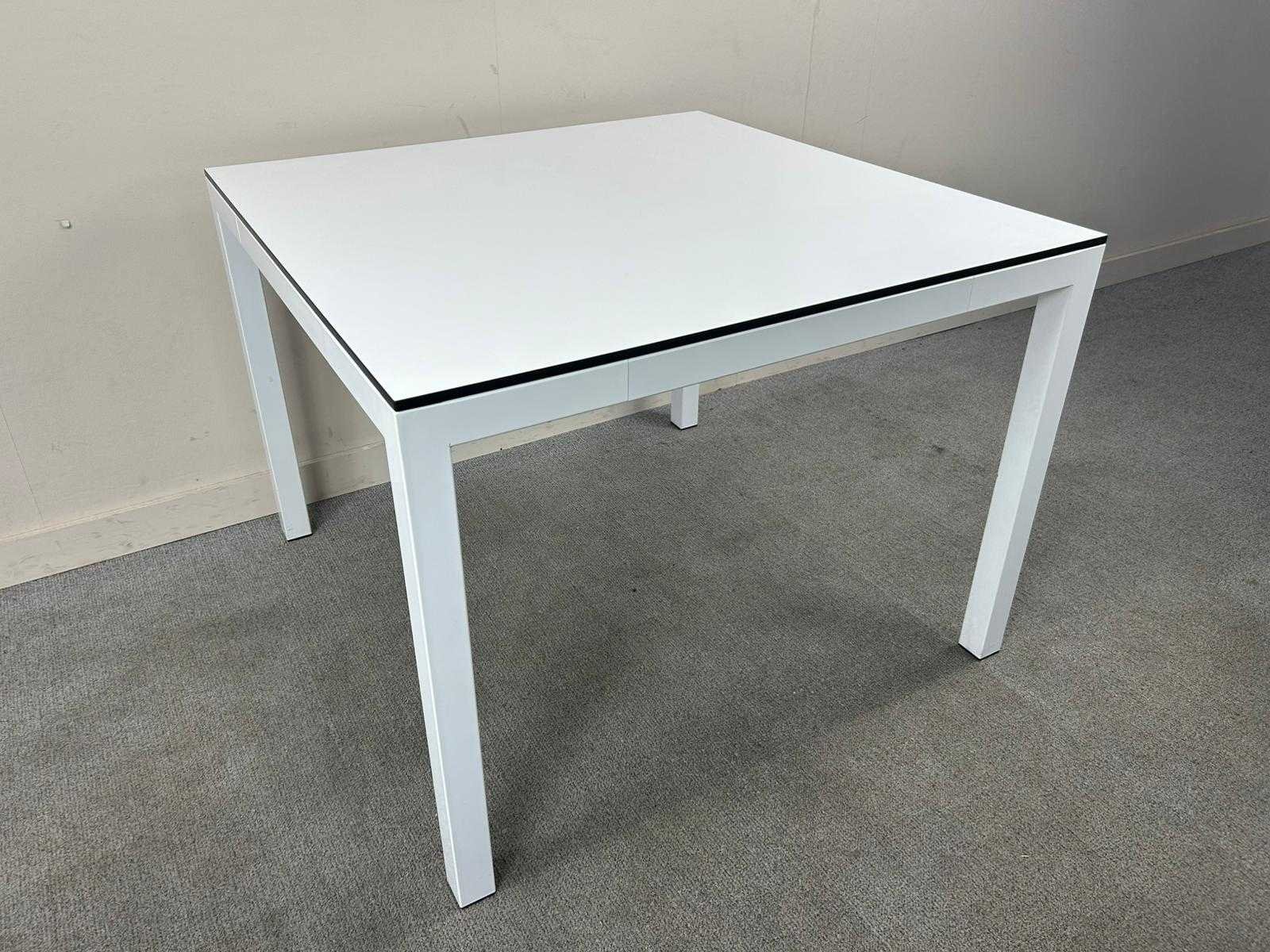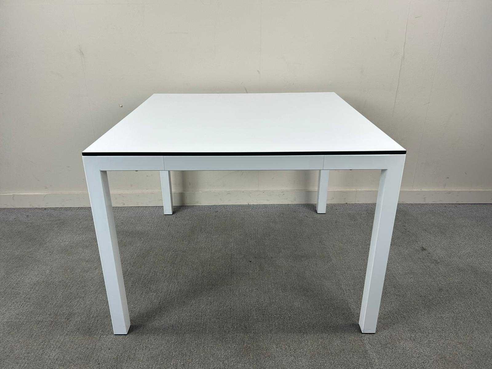 Compacte witte vierkante tafel. Met gebruikssporen. Nee Kleur: Wit Gewicht: 35kg Lengte: 100cm Breedte: 100cm Hoogte: 75cm Materiaal: Melamine