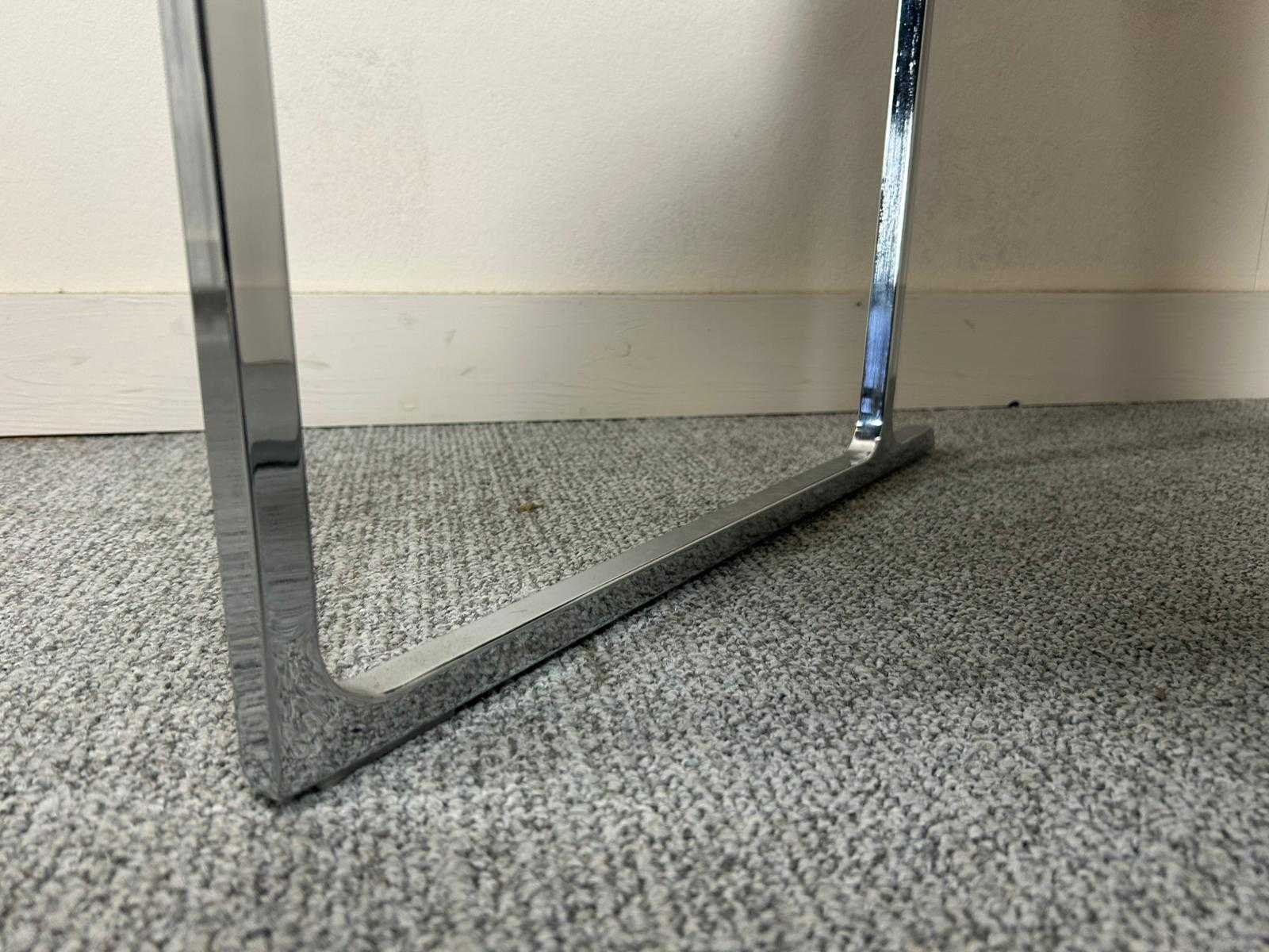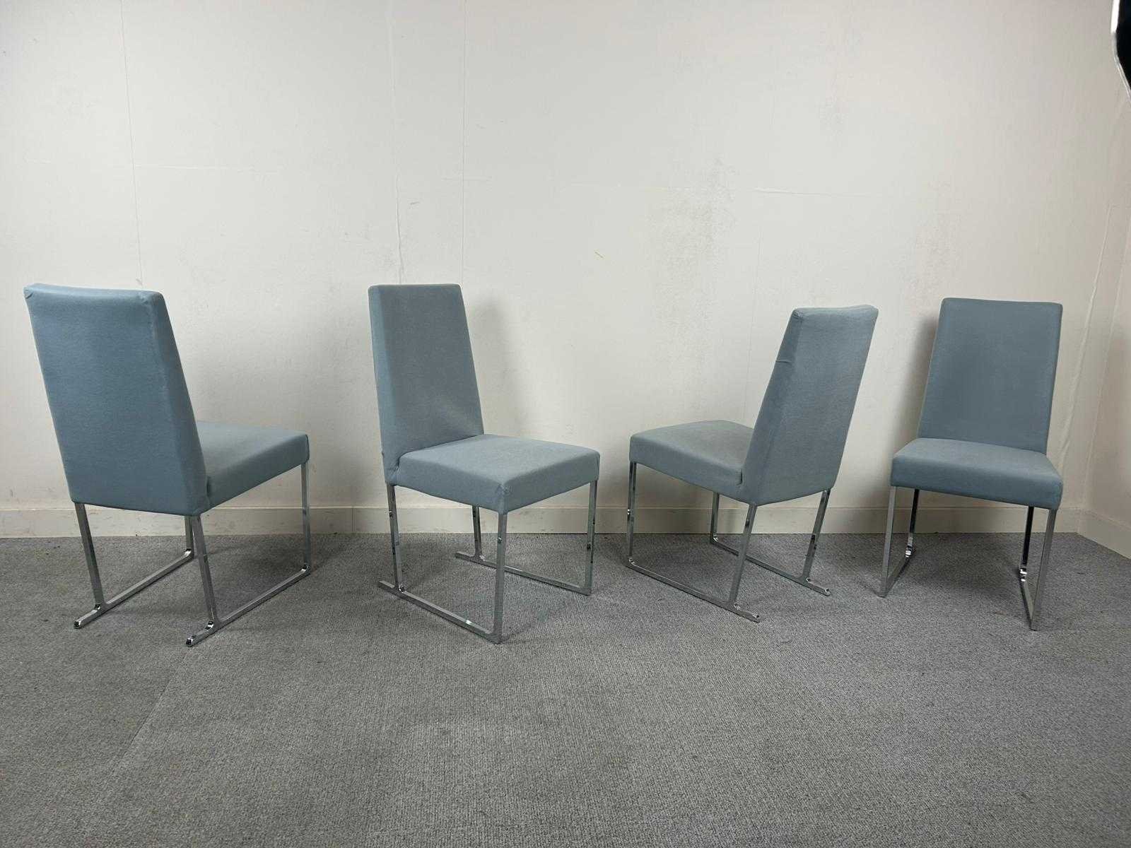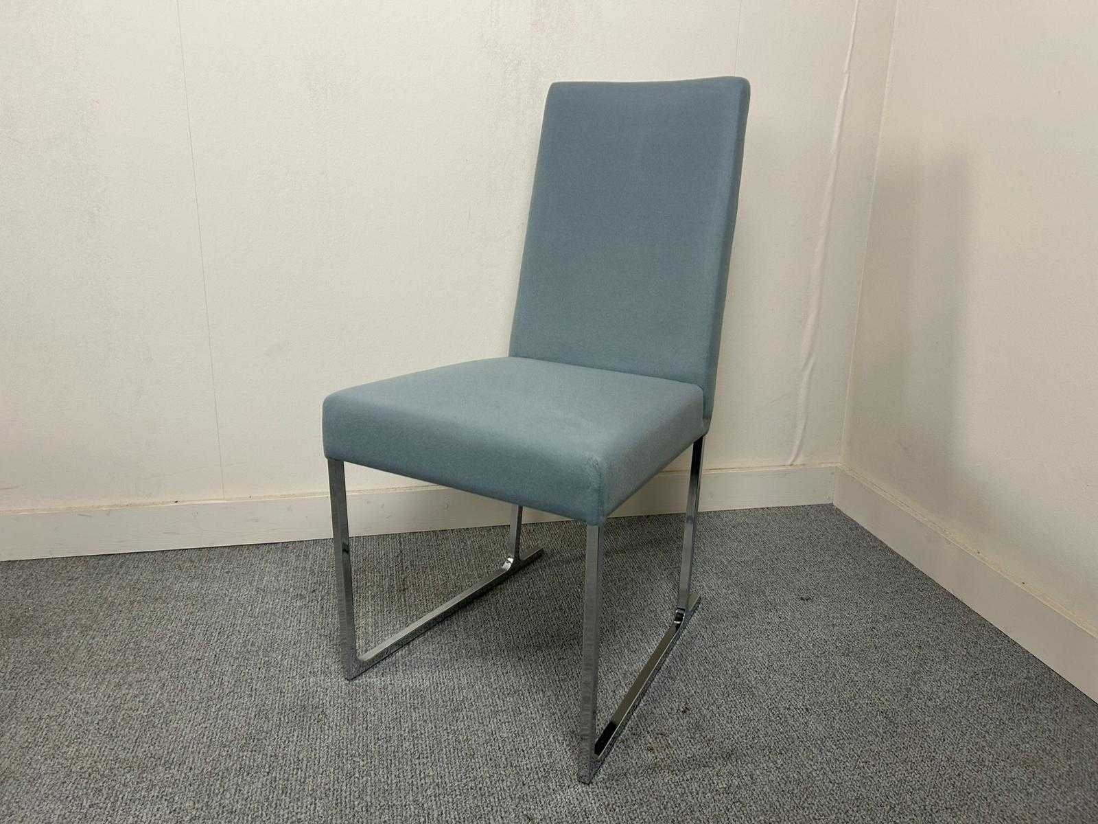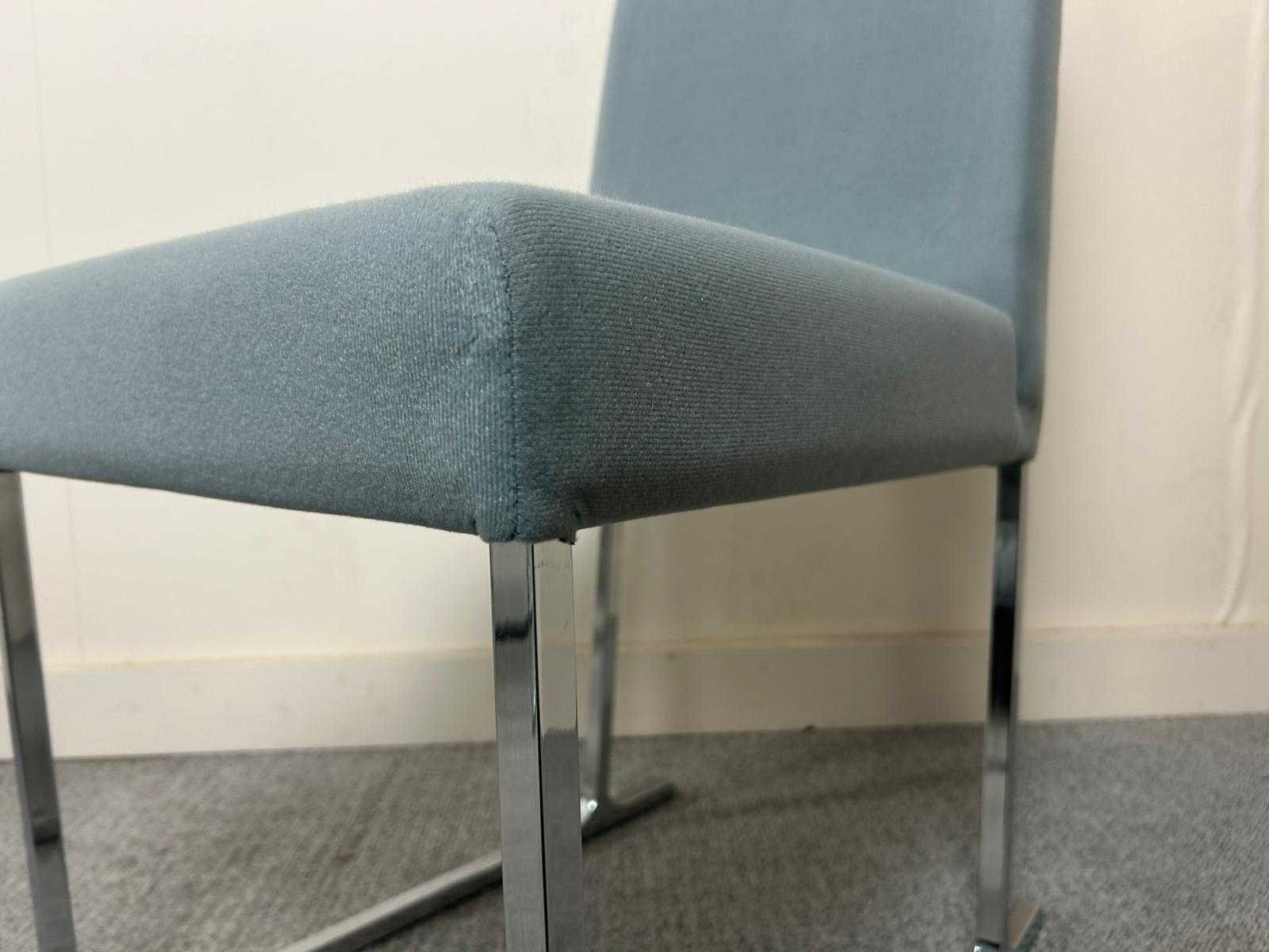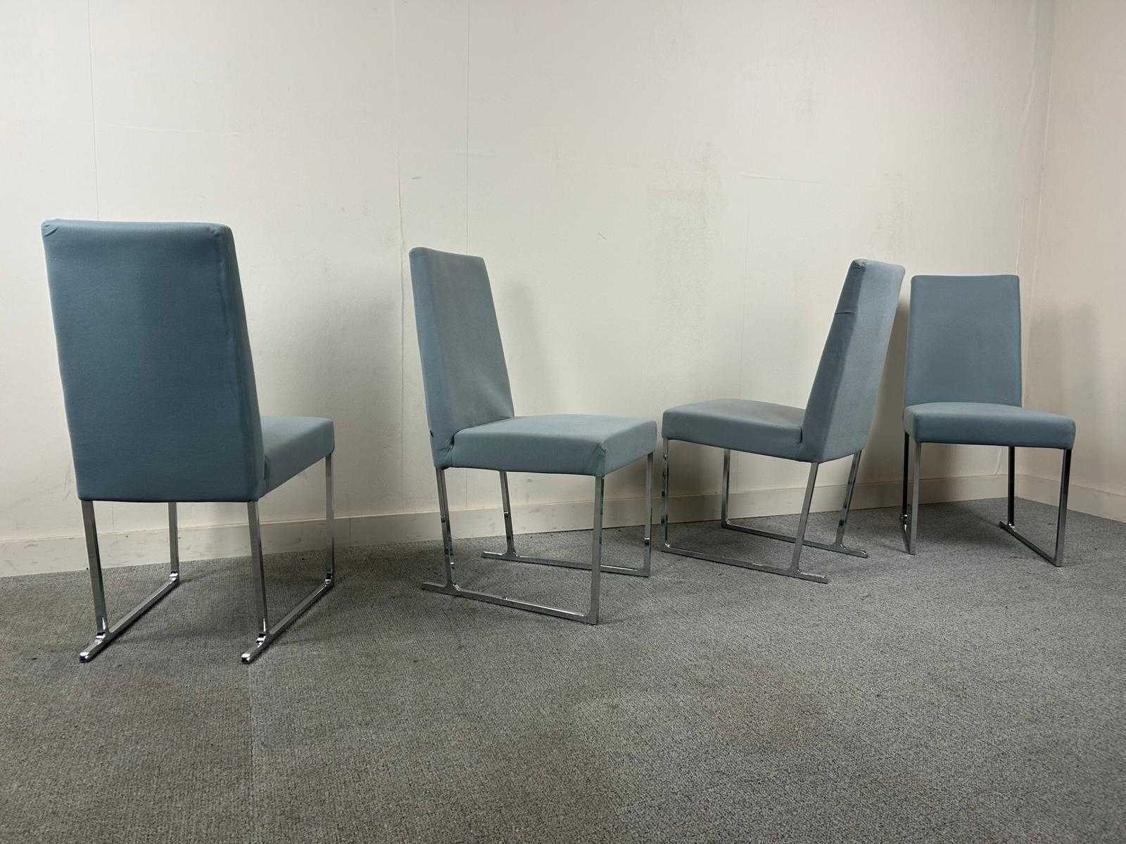 Set van 4 grijsblauw gestoffeerde ontvangststoelen op verchroomde sledepoot. Met gebruikssporen, staat kan variëren per item in de set. Nee Type: Ontvangststoel Kleur: Grijsblauw Gewicht: 60kg Materiaal: Stof