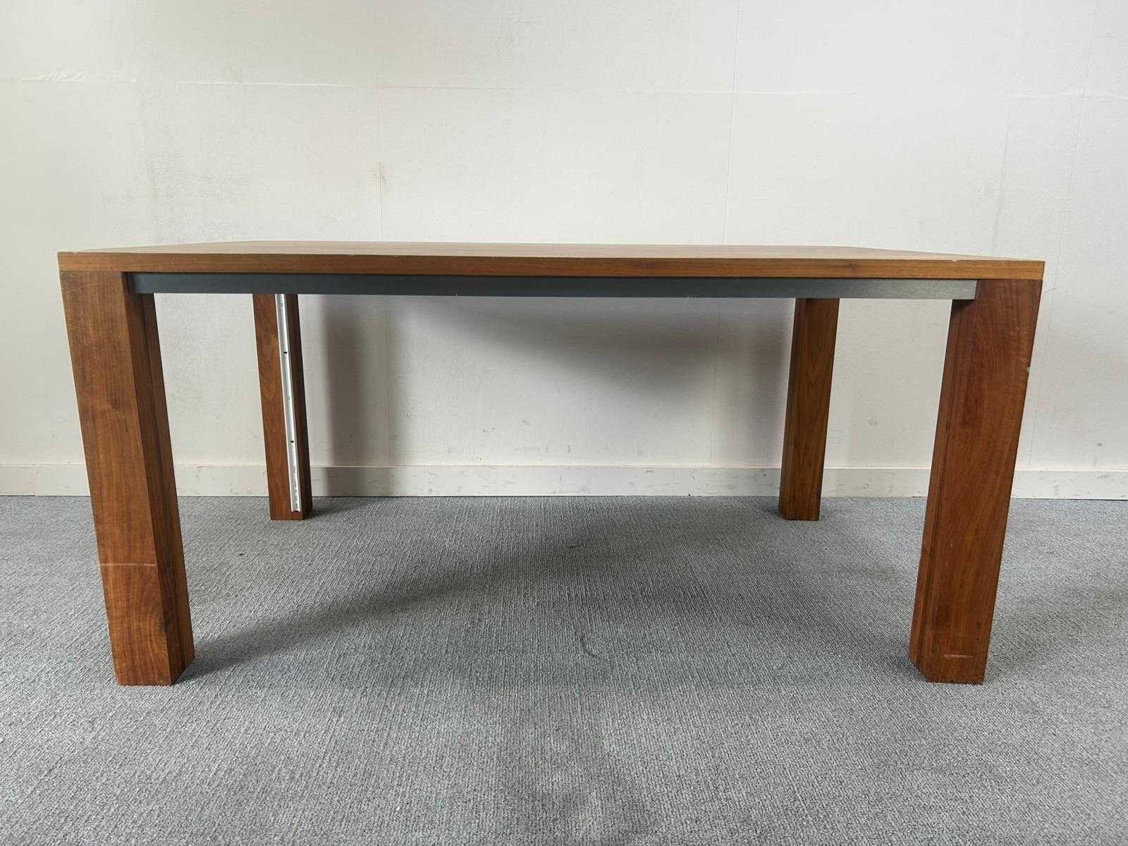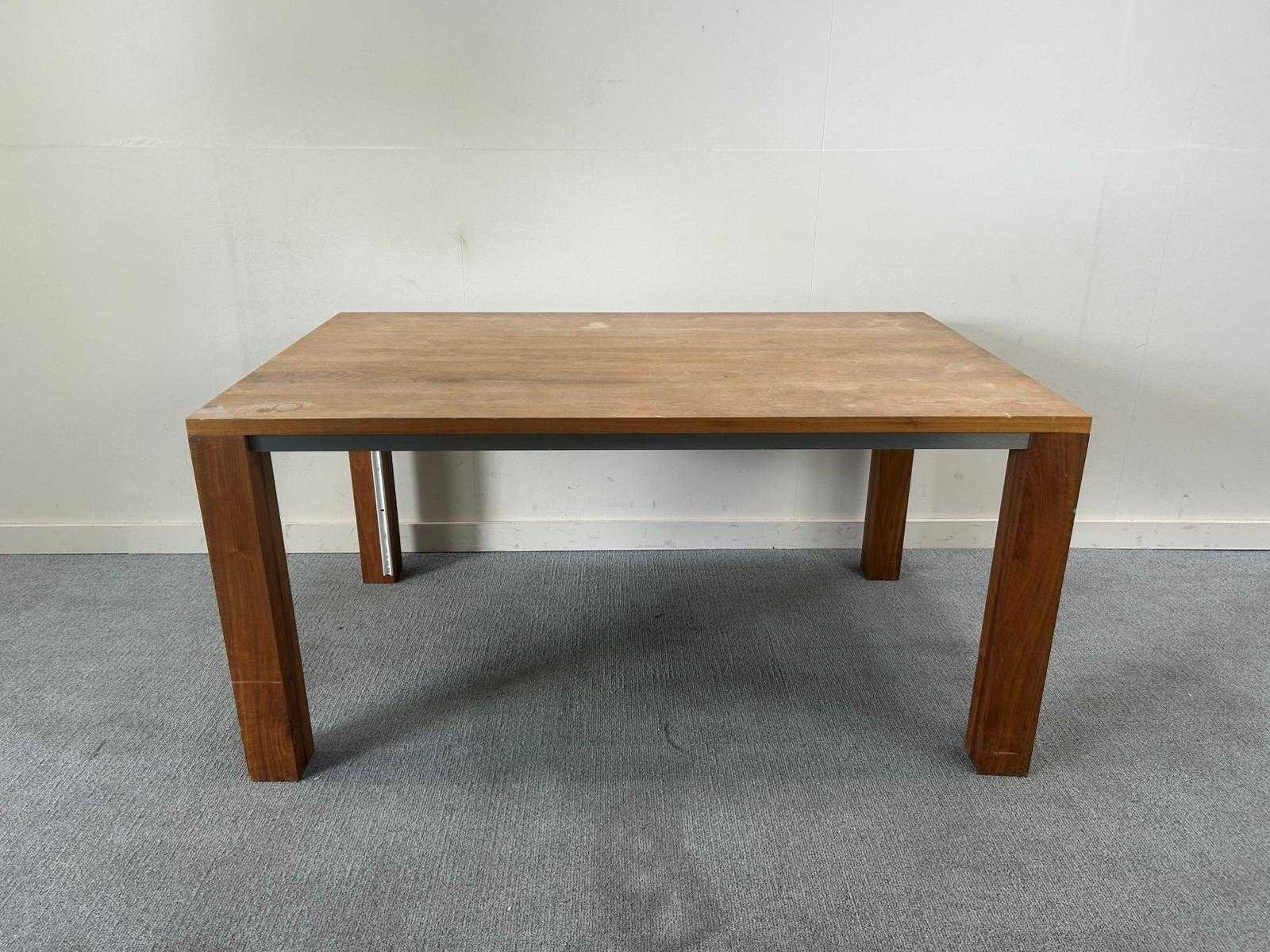 Massieve rechthoekige tafel met warm houtkleurig blad en bijpassende houten poten. Robuuste en tijdloze uitvoering, geschikt als eet-, werk- of vergadertafel. Gebruikssporen zichtbaar op het blad. Nee Kleur: hout Gewicht: 100kg Lengte: 160cm Breedte: 100cm Hoogte: 77cm Materiaal: Hout