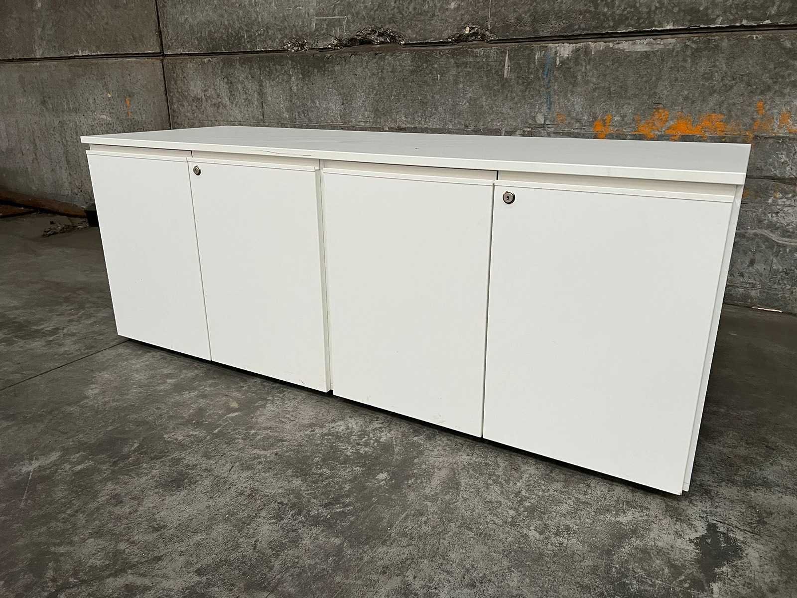 Lage draaideurkast met 4 deuren, met 1 plank per zijde, incl sleutels Nee Kleur: wit Lengte: 160cm Breedte: 55cm Hoogte: 60cm Materiaal: melamine