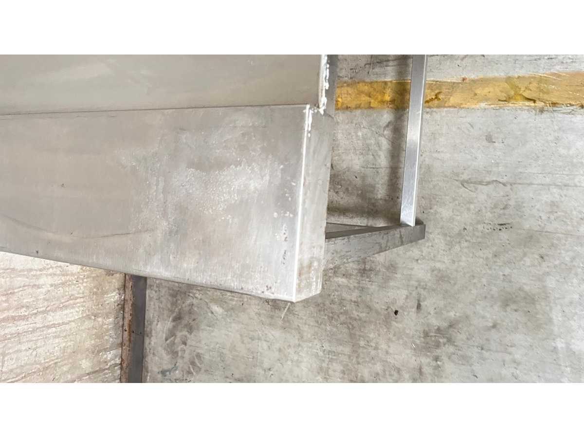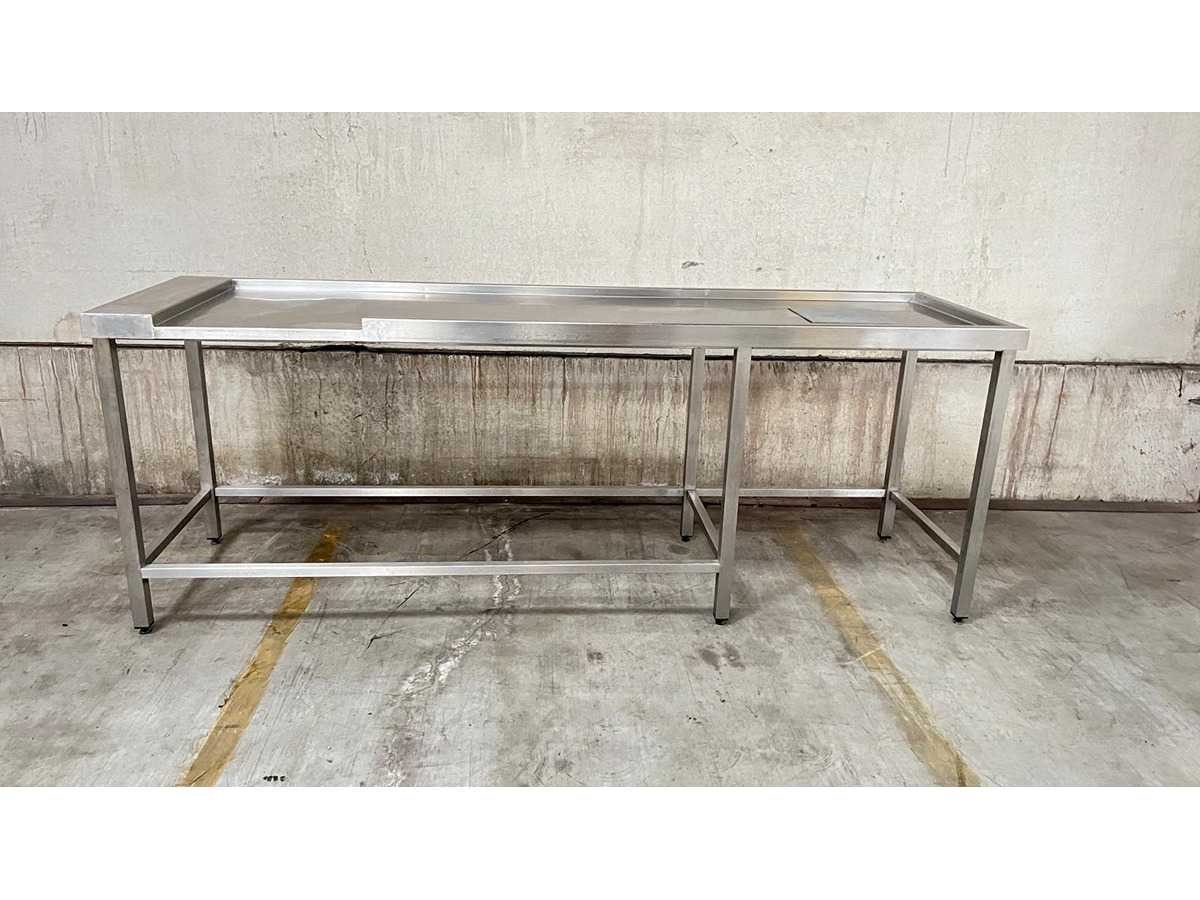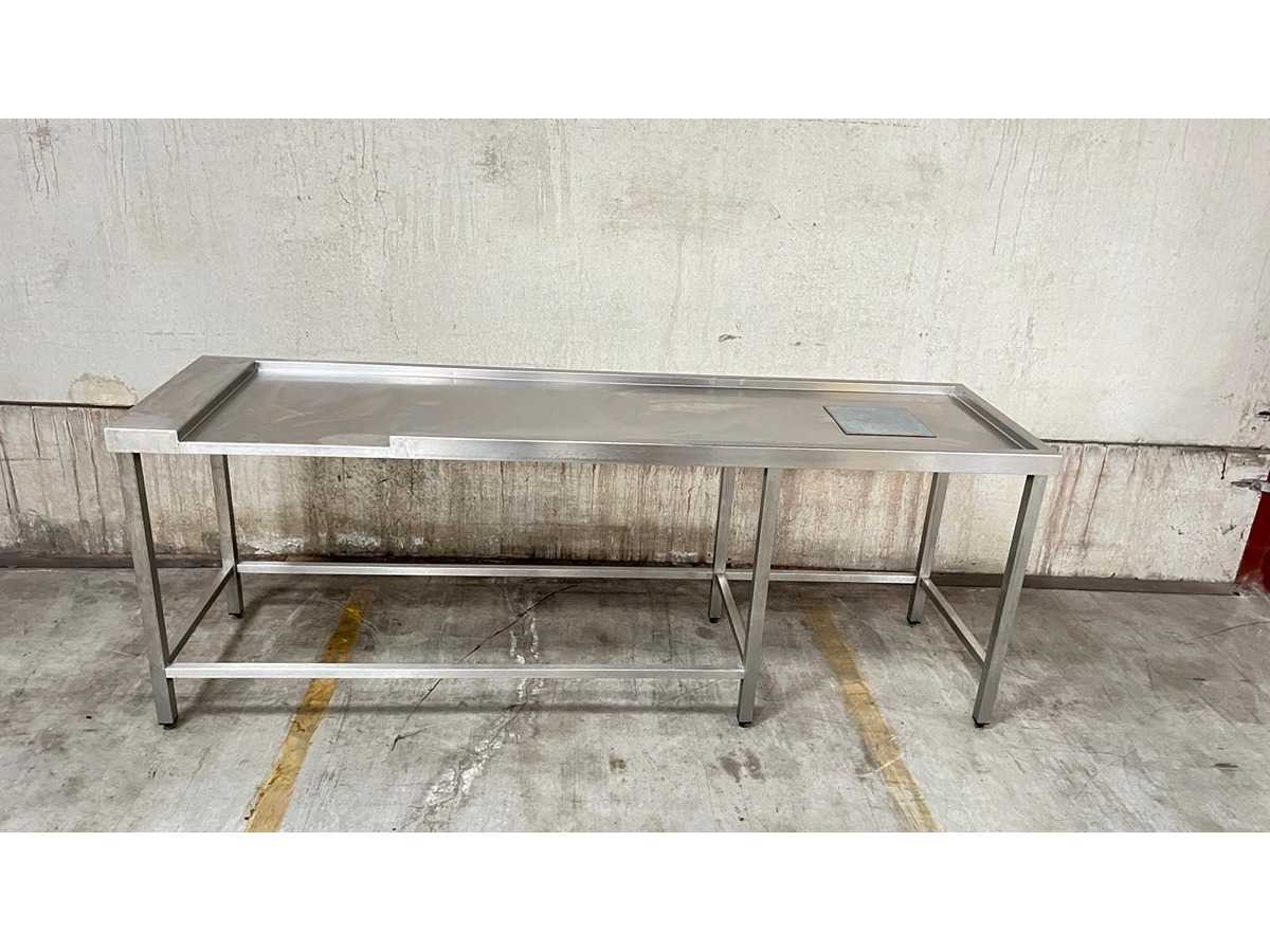 RVS Werktafel met Onderstel en Opstaande Rand – Professionele Uitvoering Professionele werktafel uitgevoerd in roestvrij staal (RVS), geschikt voor gebruik in horeca, grootkeuken of voedingsverwerking. De tafel is voorzien van een opstaande rand aan drie zijden en een verstevigd onderstel met rondom buisframe. In het werkblad is een uitsparing met afdekplaat voorzien (rechts), geschikt voor inbouw of doorvoer. Kenmerken Materiaal: RVS Open onderstel met verstevigingsframe Opstaande rand aan achter- en zijkanten Uitsparing met afdekplaat in werkblad Verstelbare stelvoeten Industriële, stabiele constructie Toepassing Ideaal als voorbereidings- of productietafel in professionele keukenomgeving. Staat Normale gebruikssporen conform professioneel gebruik. Wordt verkocht in huidige staat zoals afgebeeld. Nee Lengte: 245cm Breedte: 70cm Hoogte: 92cm Materiaal: INOX