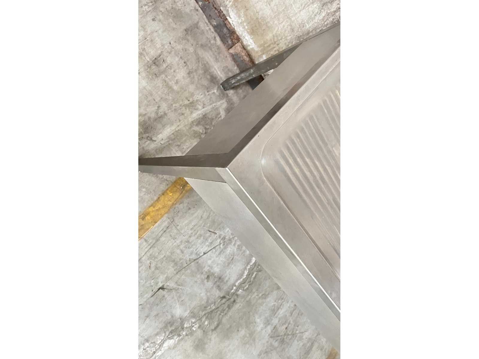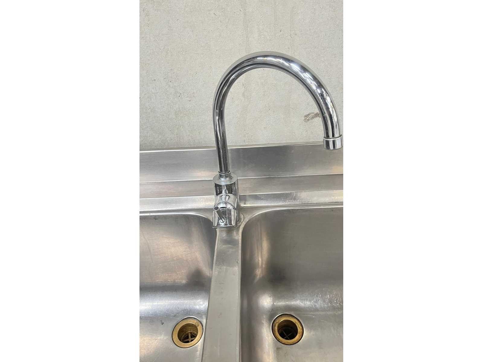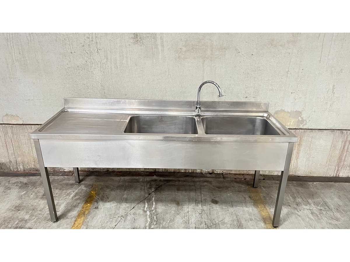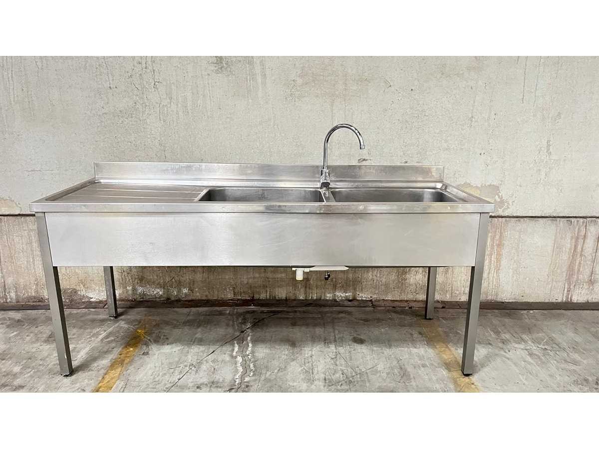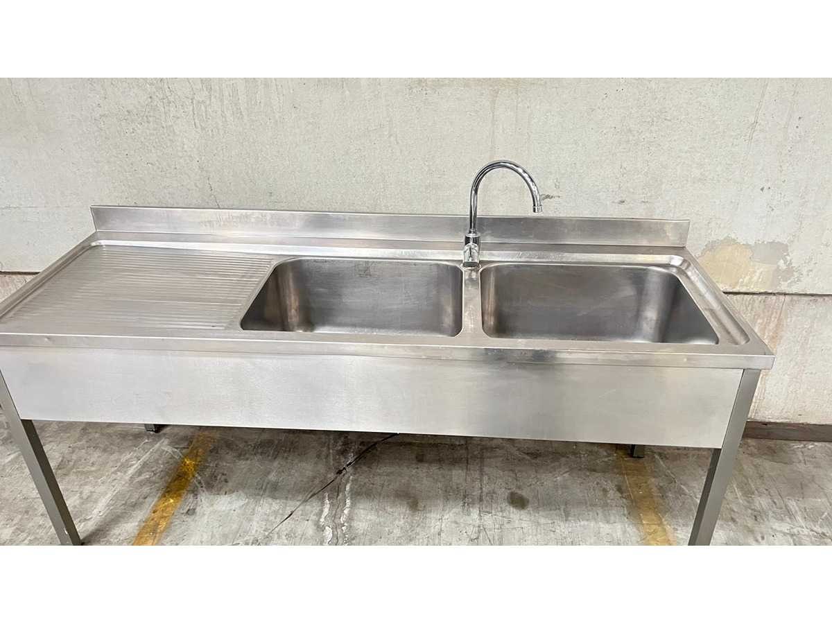 RVS Dubbele Spoeltafel met Afdruipzone – Professionele Horeca Uitvoering Professionele spoeltafel uitgevoerd in roestvrij staal (RVS), geschikt voor gebruik in horeca, grootkeuken of voedingsverwerking. De tafel is voorzien van twee ruime spoelbakken, een geïntegreerde afdruipzone links en een opstaande rand achteraan. Inclusief mengkraan. De constructie staat op vier stevige poten. Kenmerken Materiaal: RVS 2 spoelbakken Afdruipzone links Opstaande spatwand achteraan Inclusief kraan Open onderstel Industriële uitvoering Toepassing Ideaal voor afwas-, spoel- of voorbereidingszone in professionele keukenomgeving. Staat Normale gebruikssporen conform professioneel gebruik. Wordt verkocht in huidige staat zoals afgebeeld. Nee Product type: dubbele wastafel Lengte: 200cm Breedte: 70cm Hoogte: 86cm Materiaal: INOX