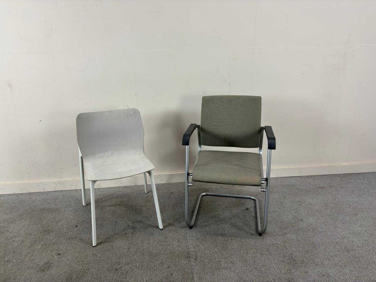 Gemengde set van 2 stoelen, 1 cantileverstoel in grijs en 1 kunststof stoel op witte vierpoot. Nee Merk: WILKHAHN Type: Stoel set Materiaal: Stof