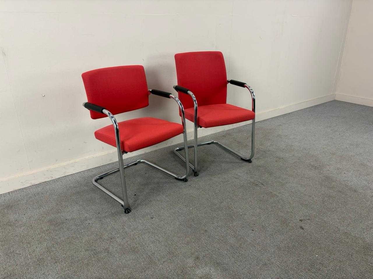 Set van 2 Dauphin ontvangststoelen met sledeonderstel in rode stof. Met gebruikssporen, staat kan variëren per item. Nee Merk: DAUPHIN Type: Ontvangststoel Kleur: Rood Gewicht: 50kg Materiaal: Stof