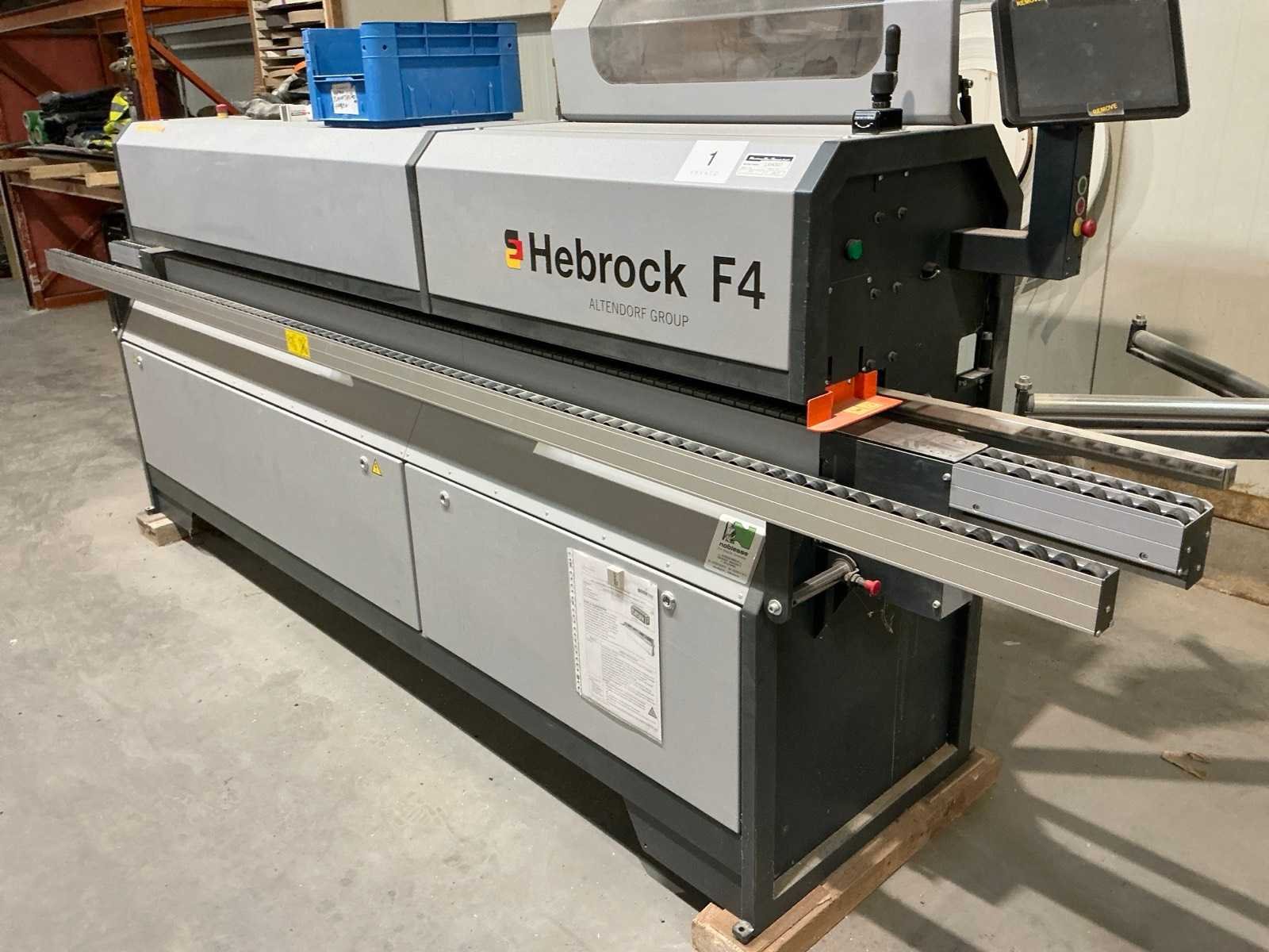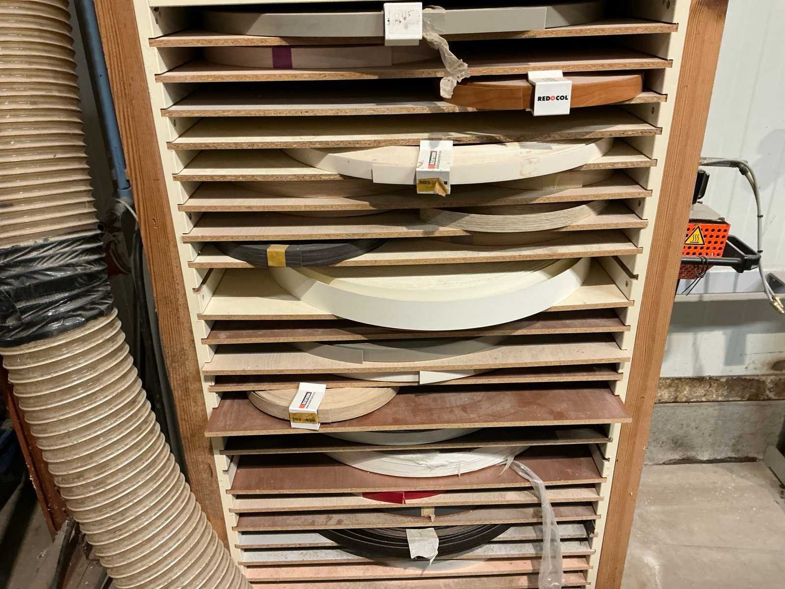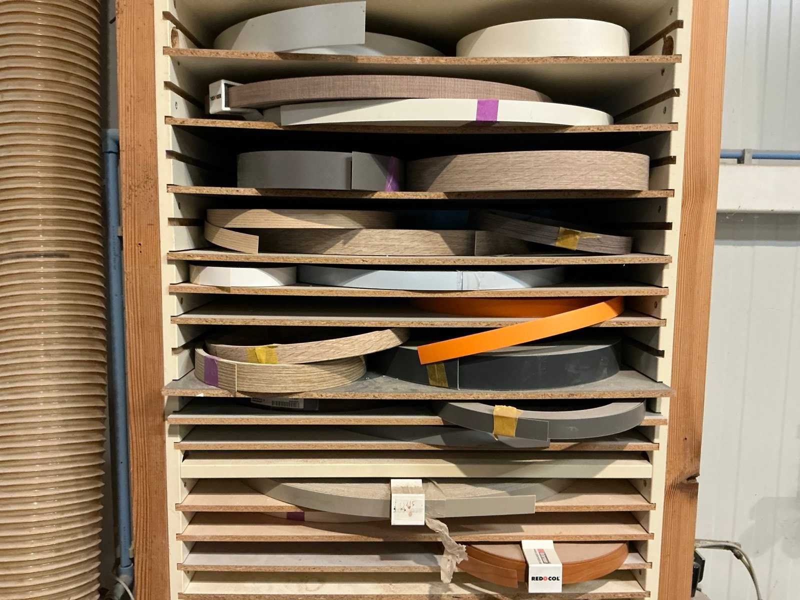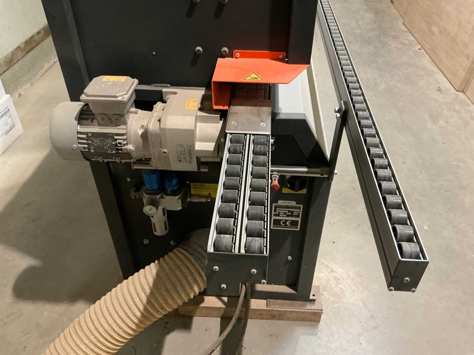 Voorzien van Cnc-sturing en gemonteerde aanvoergeleider voor kantenband, compleet met partij diverse kantenband in 2 diverse kasten waaronder met afmeting: 70x60x250cm en rollenbaanmeubel inhoudende diverse dito rollen kantenband, totale afmeting: 465x70cm, breedte rollenbaan: 35cm, te demonteren tot aan afzuigdarm Nee Merk: Hebrock Type: Altendorf F4 Bouwjaar: 2019 Aansluiting: 400V Afmeting l: 4100mm Afmeting b: 1100mm Afmeting h: 1300mm