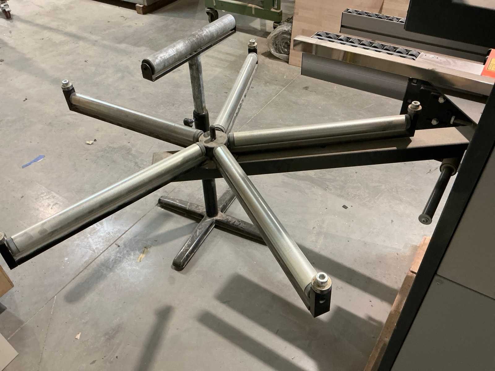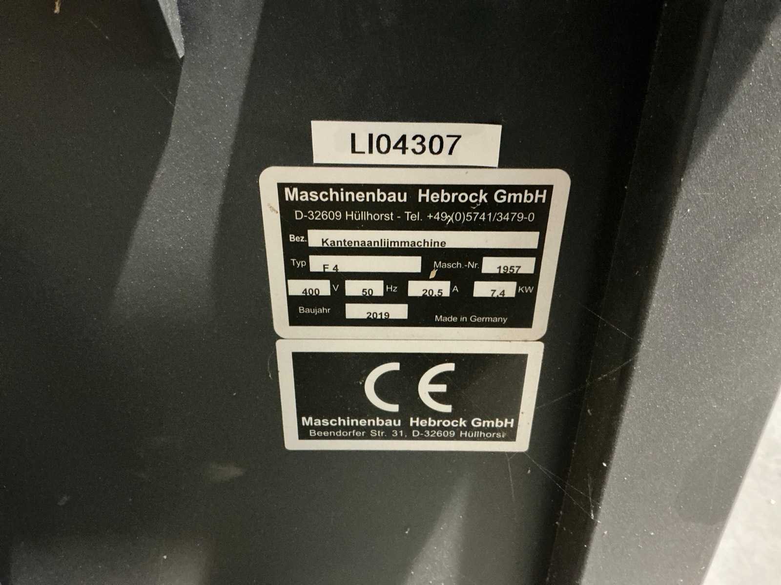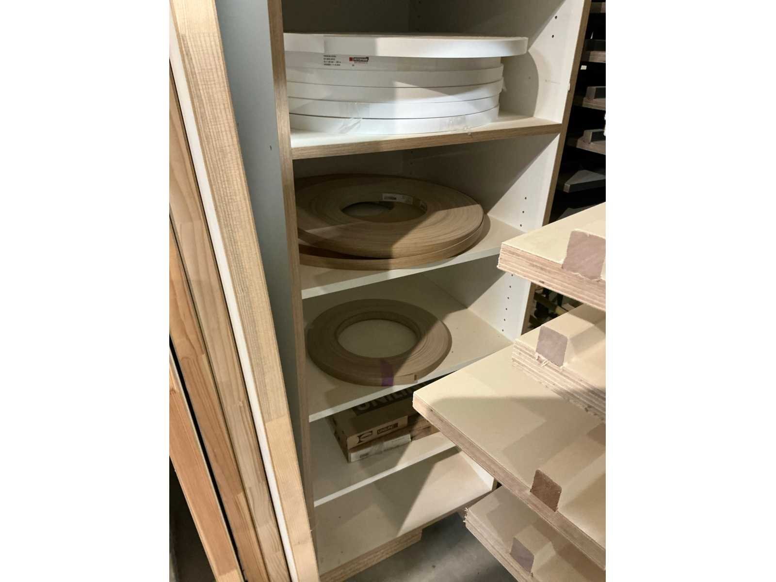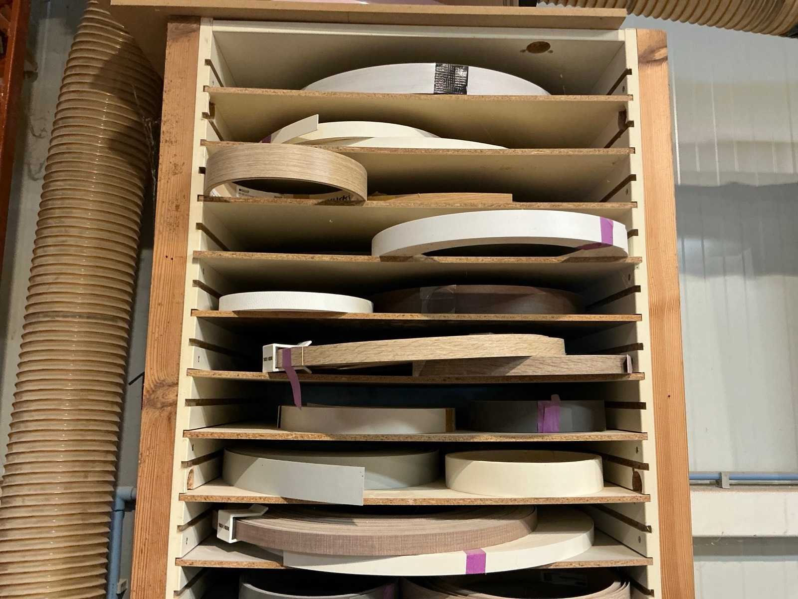 Voorzien van Cnc-sturing en gemonteerde aanvoergeleider voor kantenband, compleet met partij diverse kantenband in 2 diverse kasten waaronder met afmeting: 70x60x250cm en rollenbaanmeubel inhoudende diverse dito rollen kantenband, totale afmeting: 465x70cm, breedte rollenbaan: 35cm, te demonteren tot aan afzuigdarm Nee Merk: Hebrock Type: Altendorf F4 Bouwjaar: 2019 Aansluiting: 400V Afmeting l: 4100mm Afmeting b: 1100mm Afmeting h: 1300mm