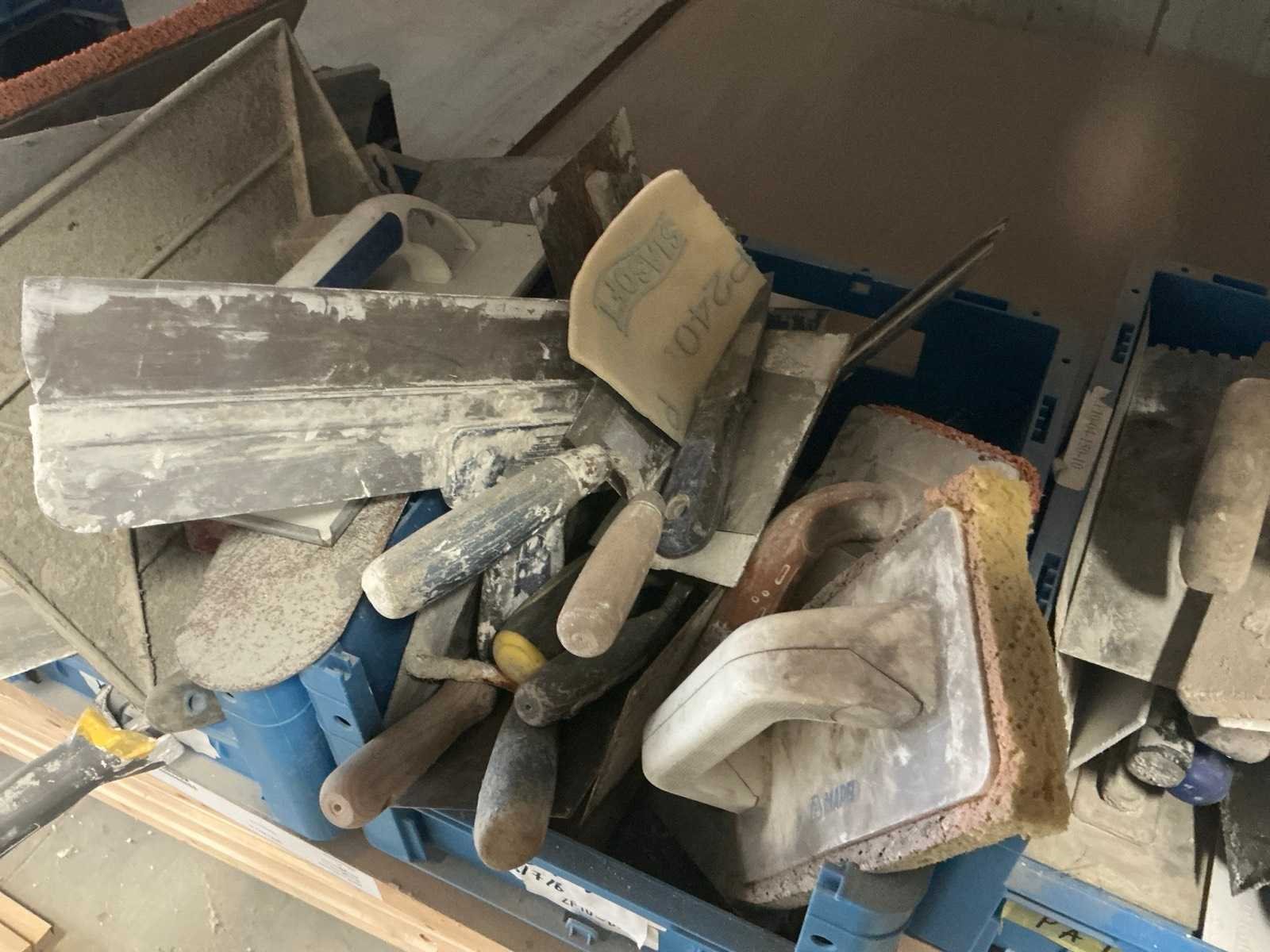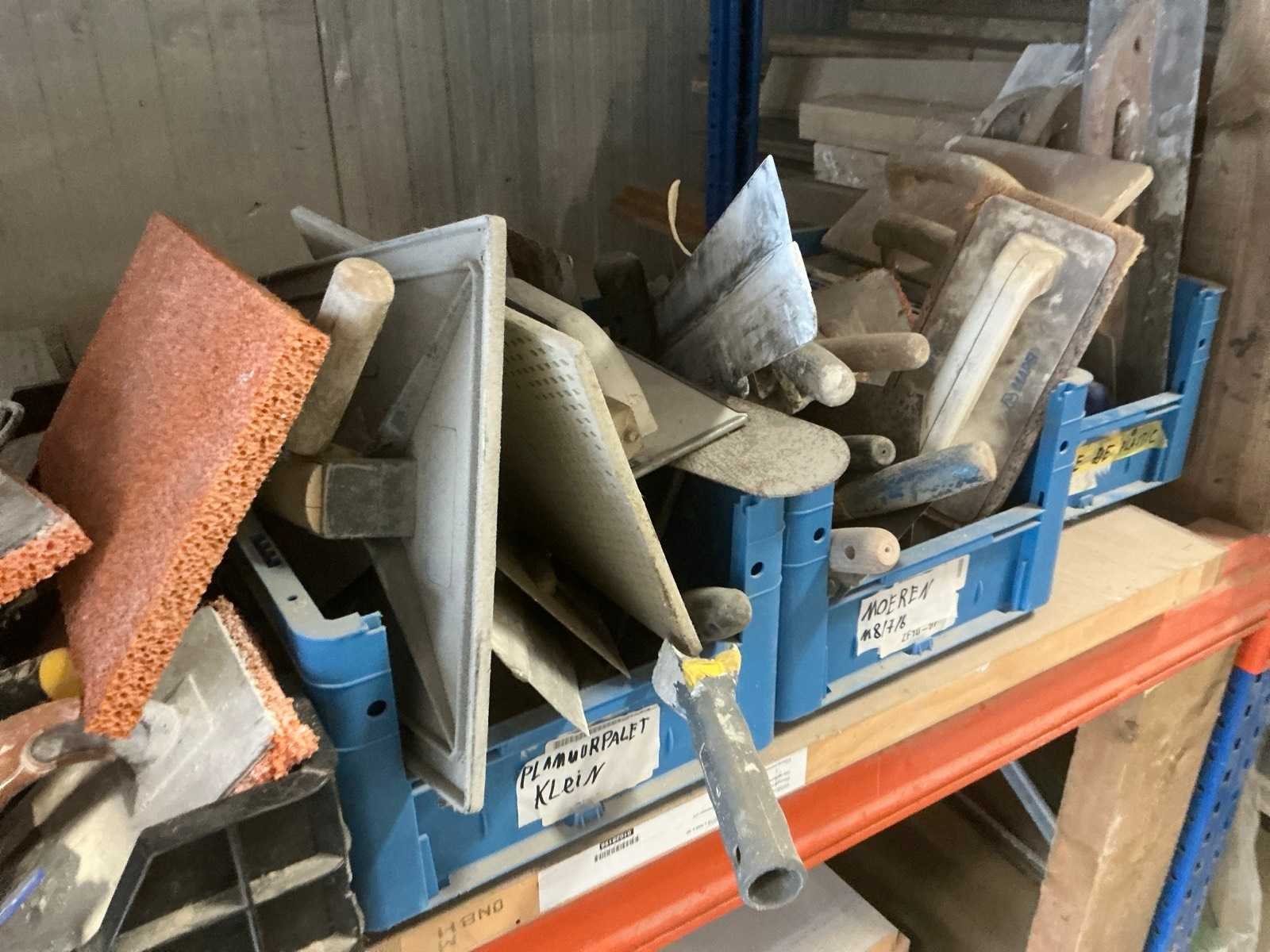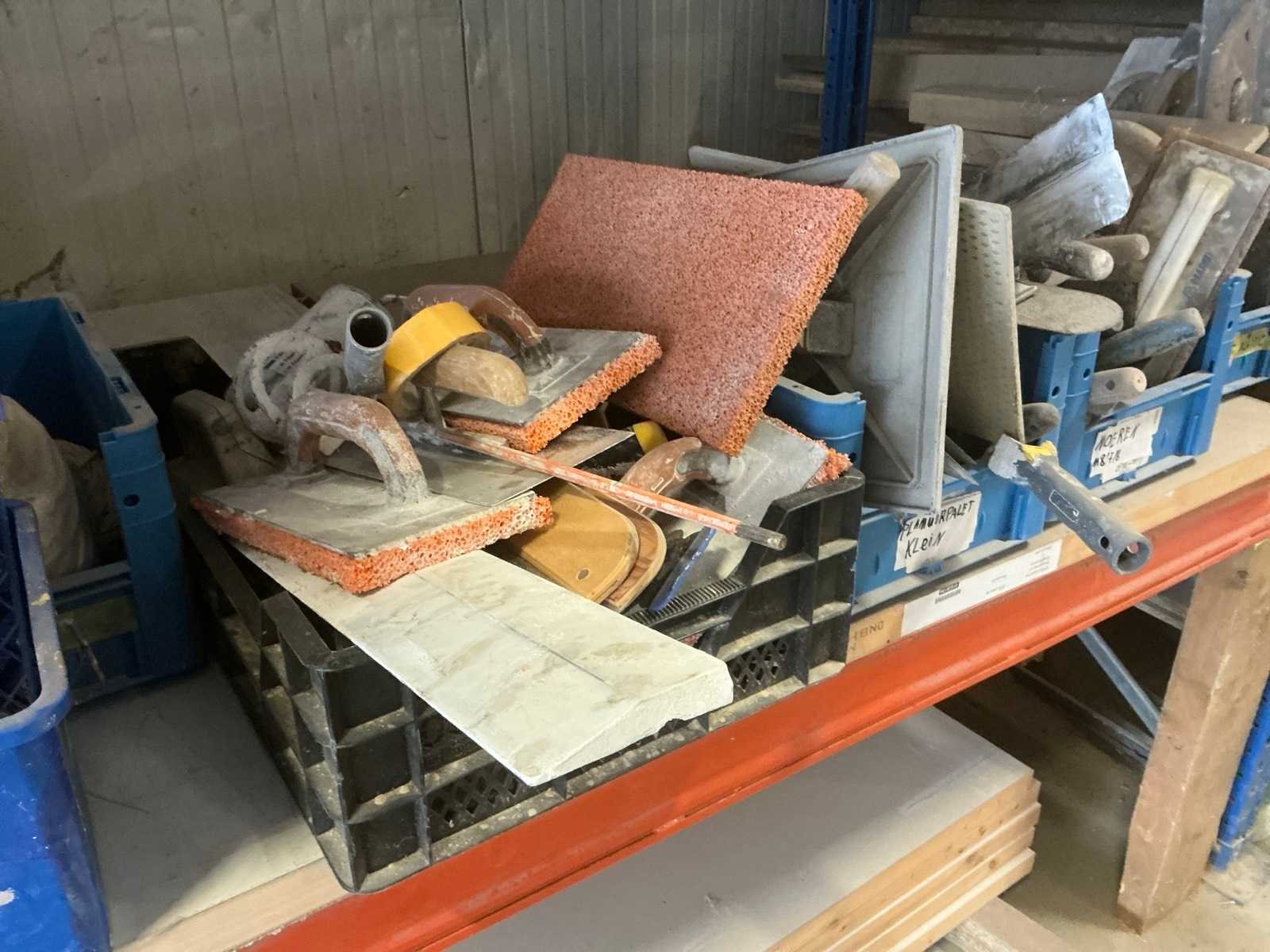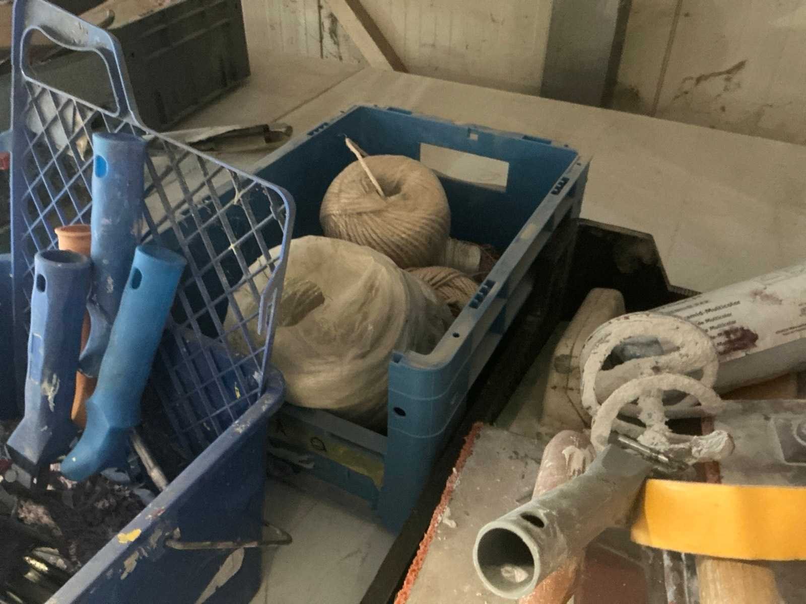Waaronder diverse verfborstelhouders, pvc verfbak, diverse afstrijkspanen, truwelen, sponsborden, diverse rollen koord, steekmessen,.. Nee