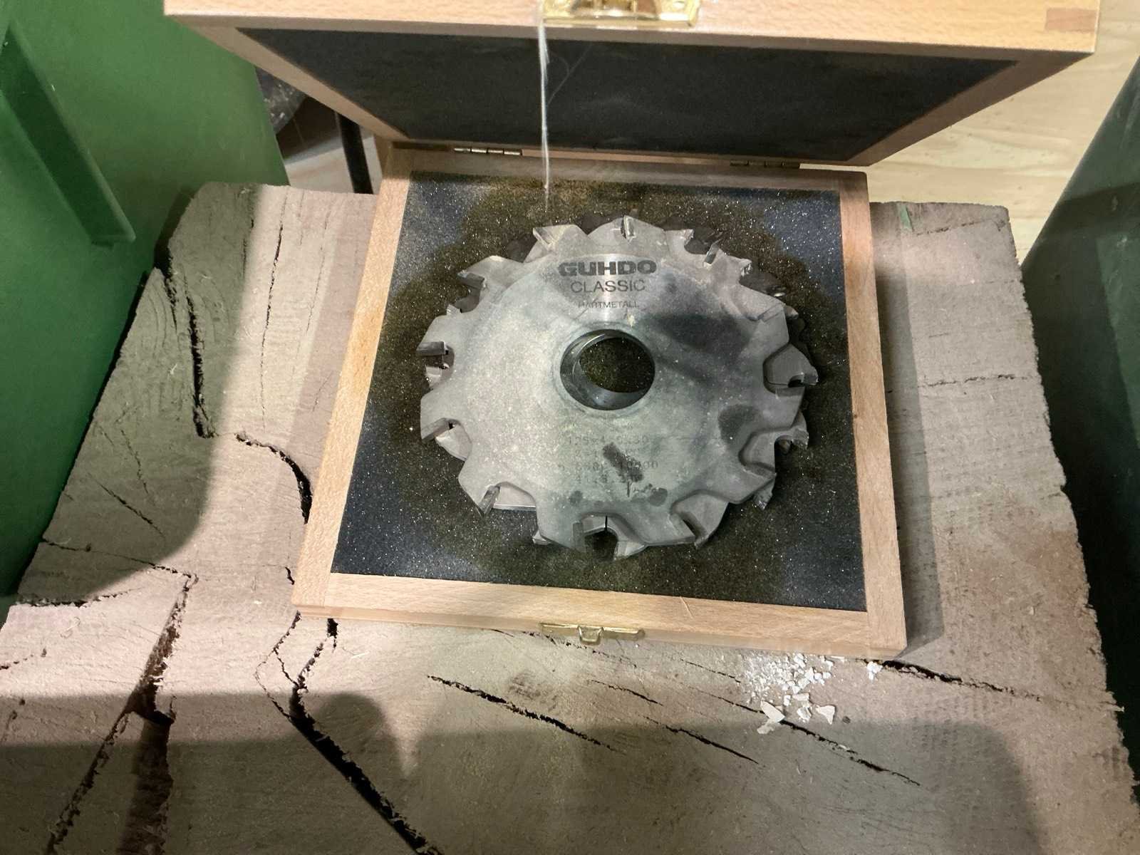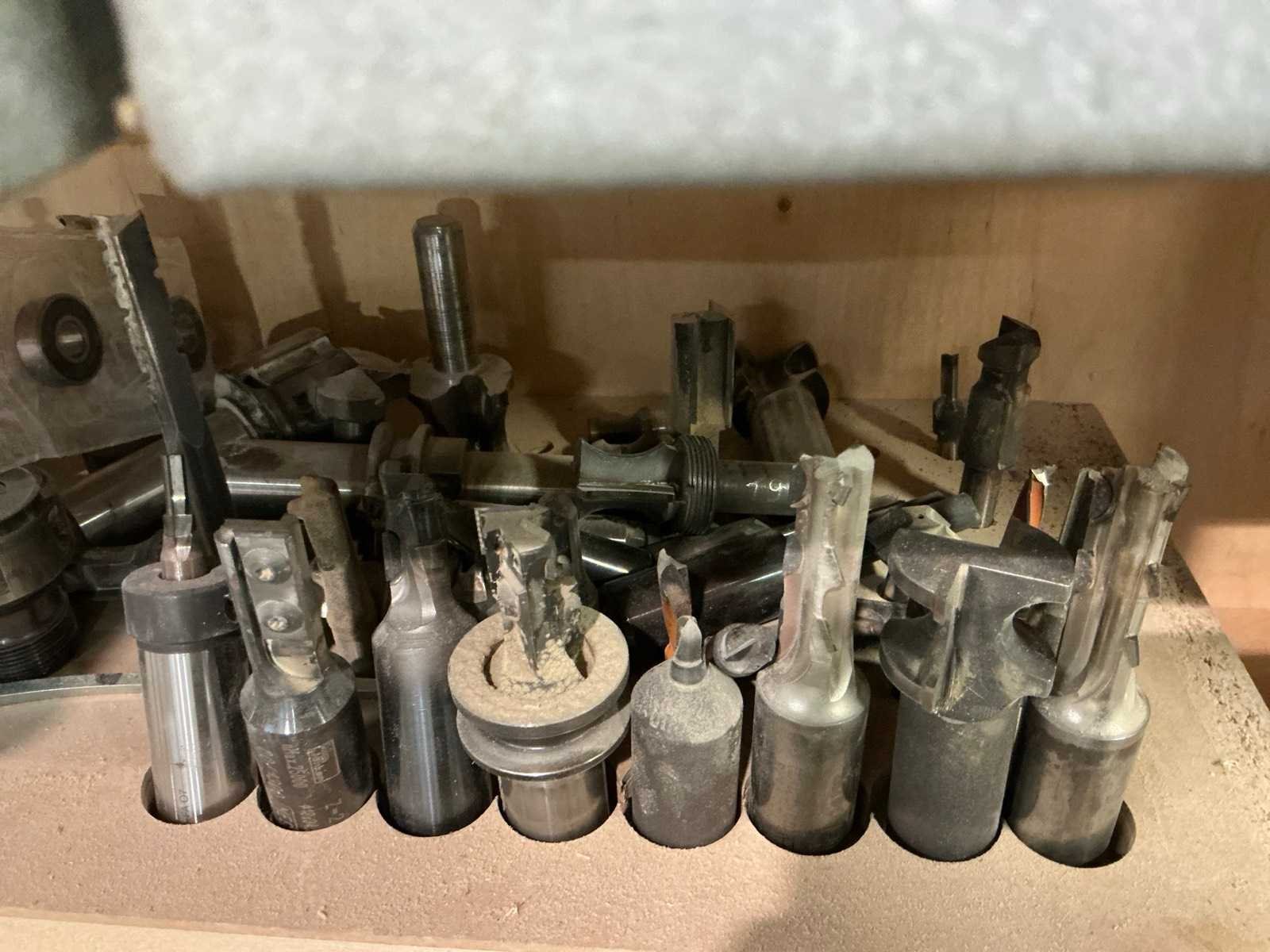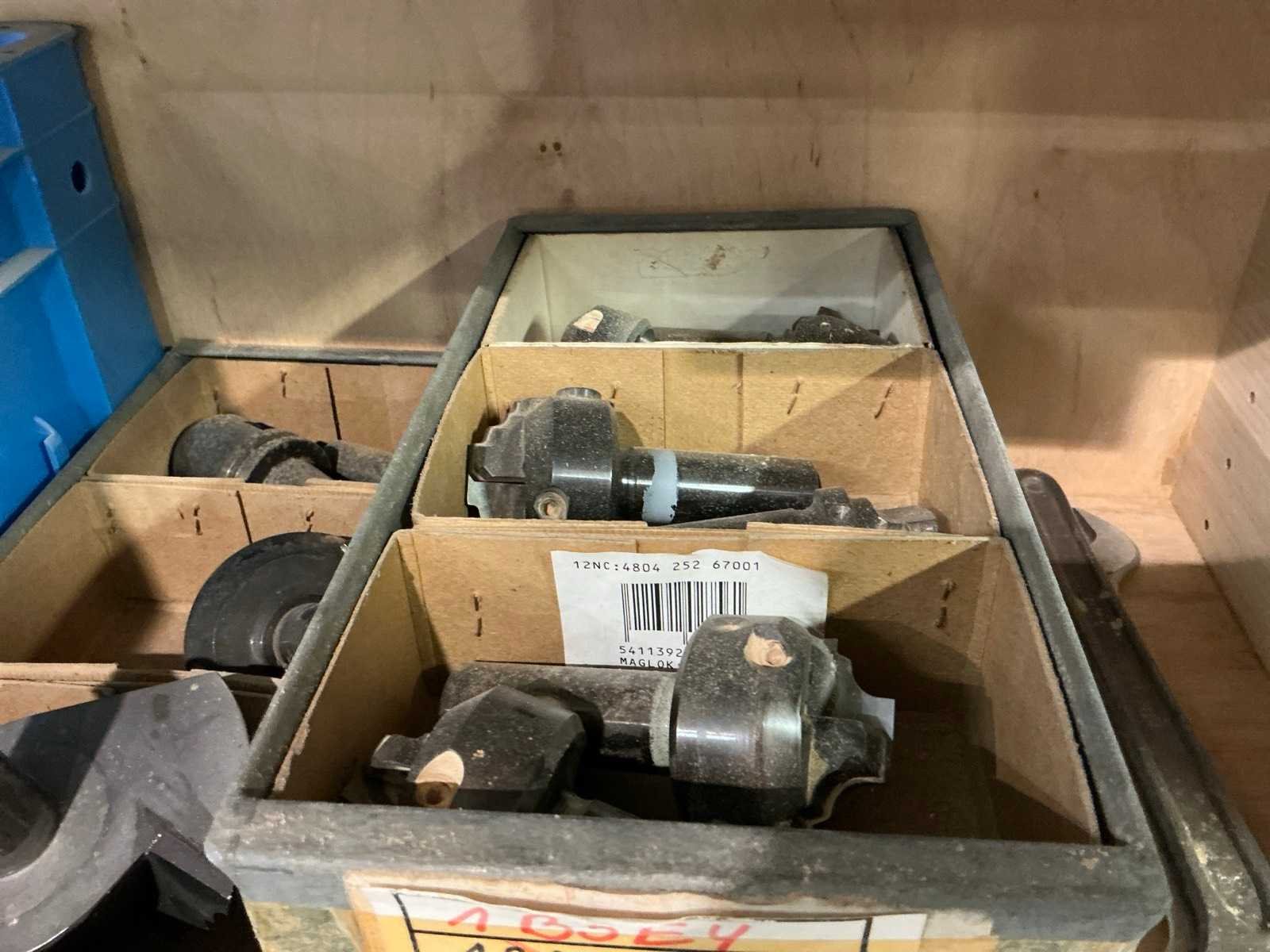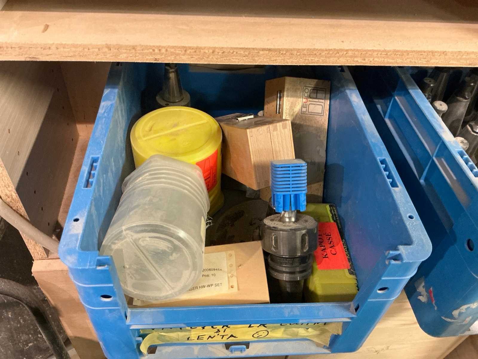 Bestaande uit: circa 55 diverse freeskoppen en zaagbladen waaronder Leuco, Karat, circa. 28 freeskophouders, 10-delige boorset, compleet met bijhorende kast 80x28x210cm Nee