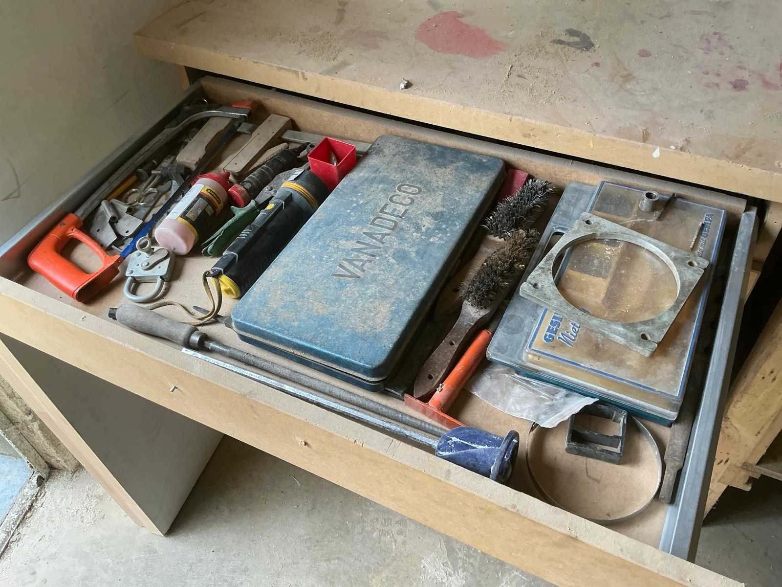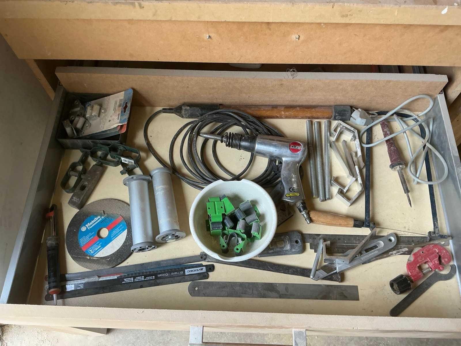 Voorzien van 2 diverse bankschroeven, krik Coram 3T en 2 leggers, afmeting: 140x56x92cm, compleet met werkkast met afmeting: 100x64x95cm, voorzien van 3 lades inhoudende diverse spaanplaatschroeven waaronder Wurth, soldeerbout, enige zaagbladen, pneumatische schieter Criko, meetgereedschap, handgereedschap Nee