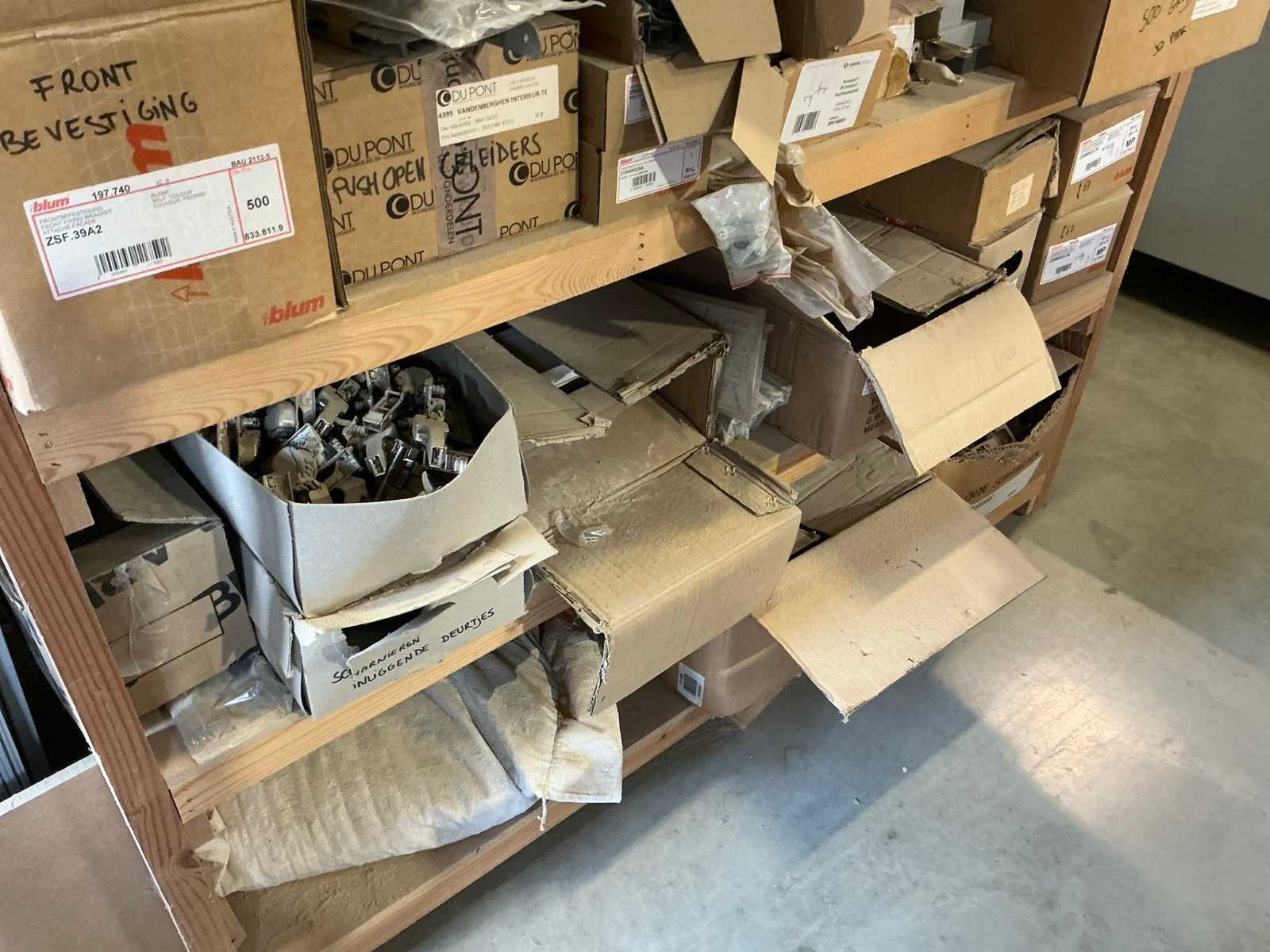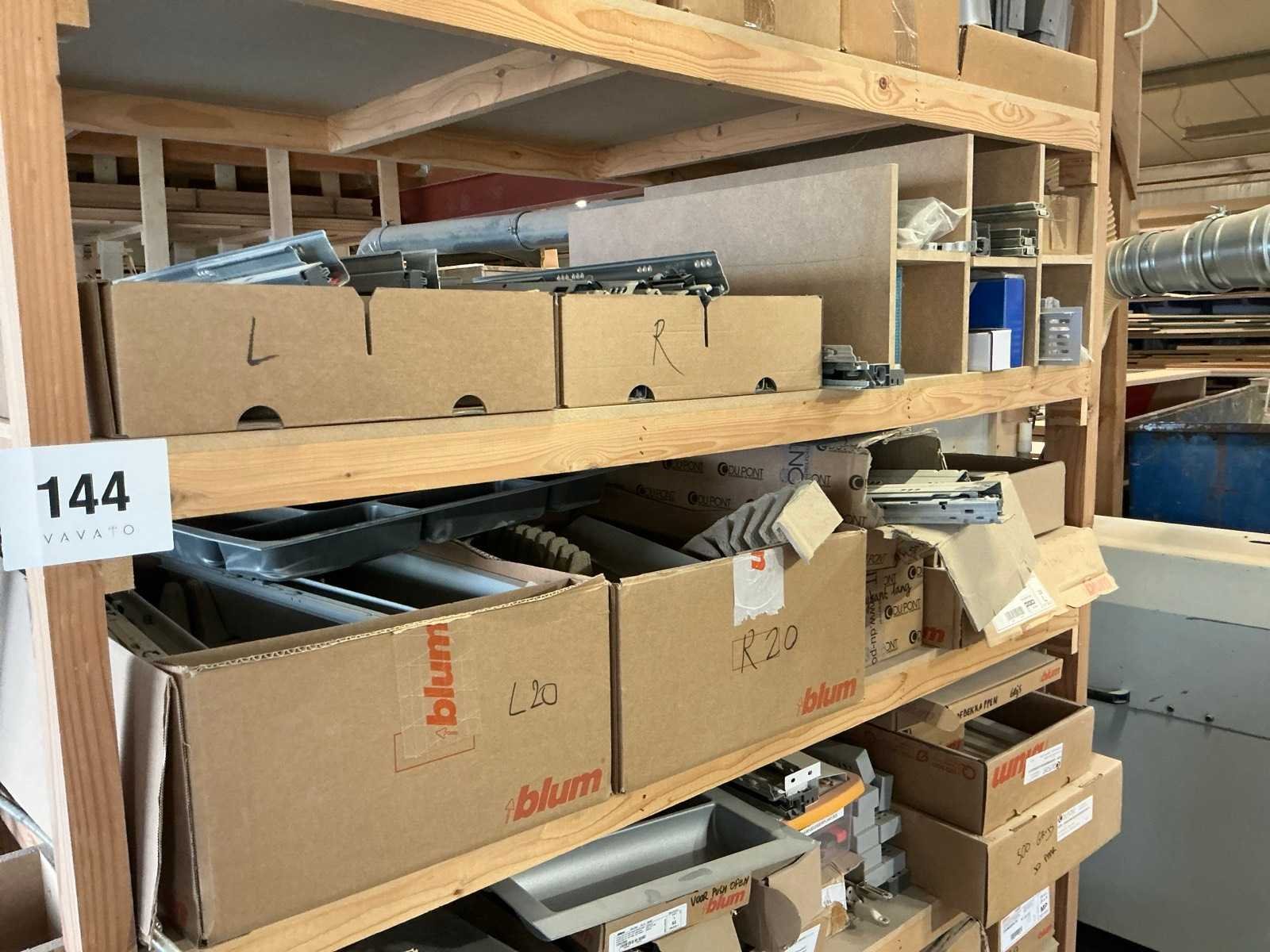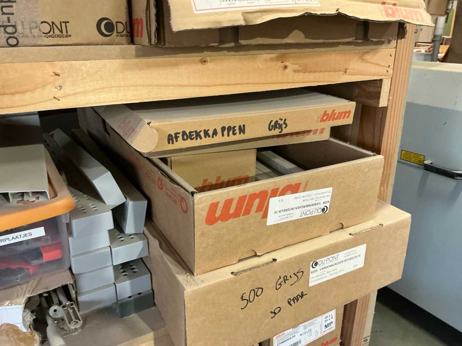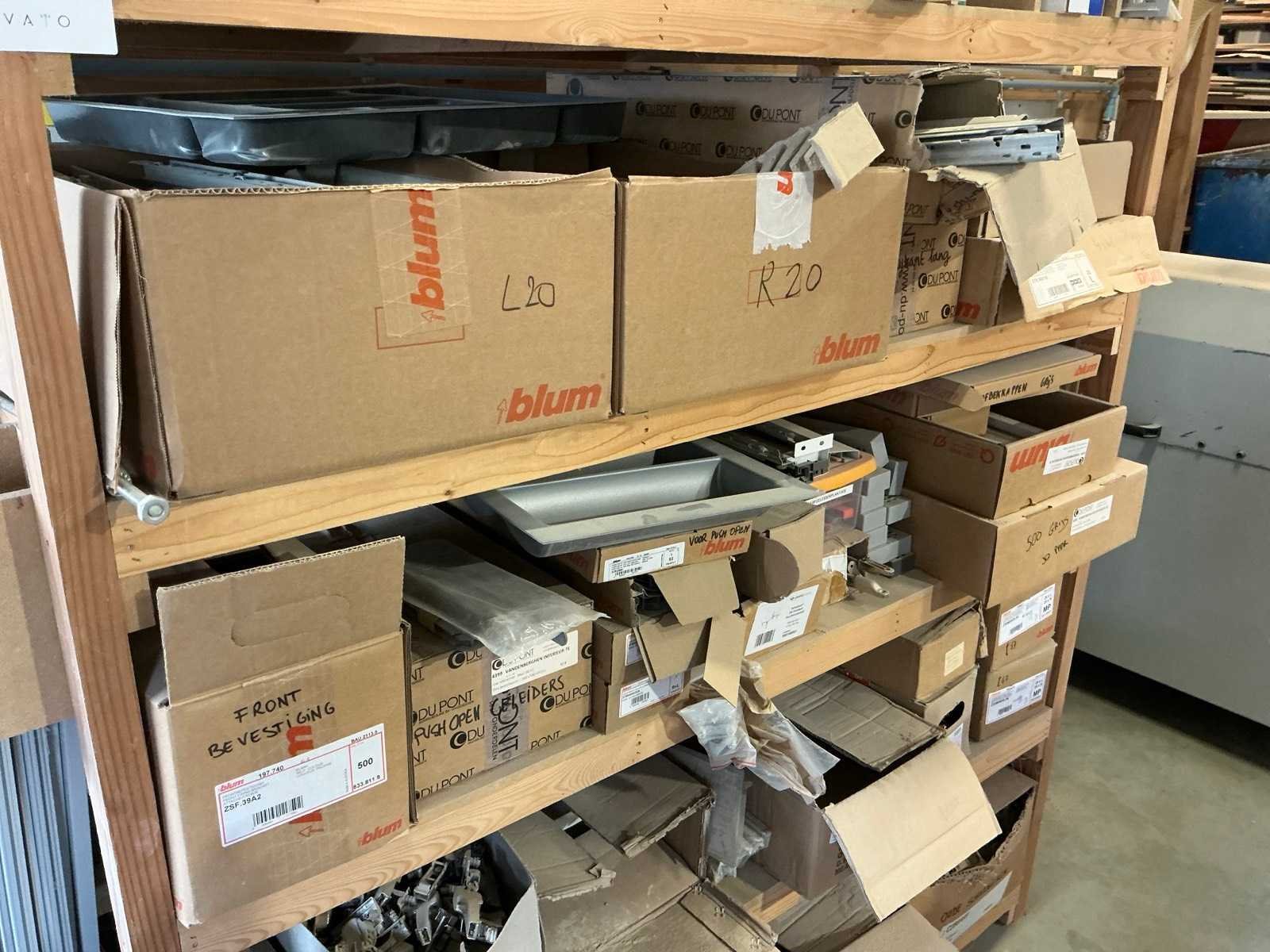 Waaronder schuifgeleiderplaatjes, afdekkappen, punthaken, back fixings, scharnieren, frontbevestigingen, ophangsystemen,.., compleet met rek Nee Merk: Blum