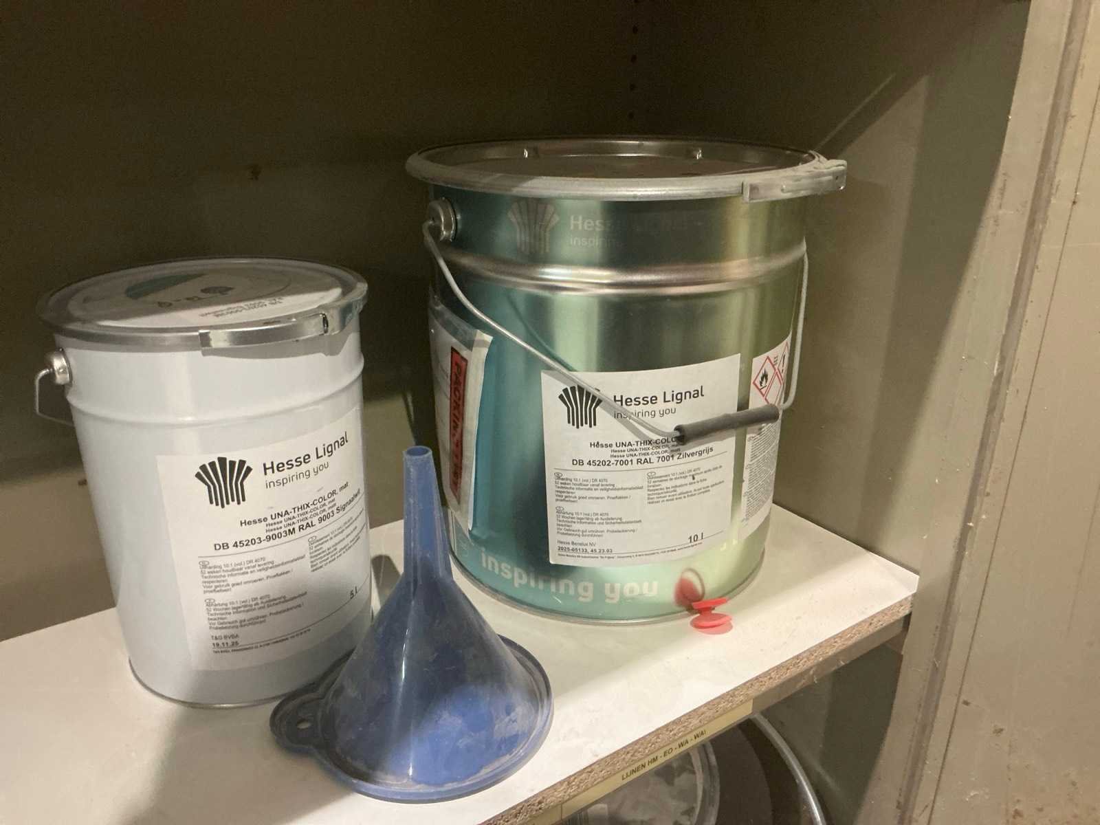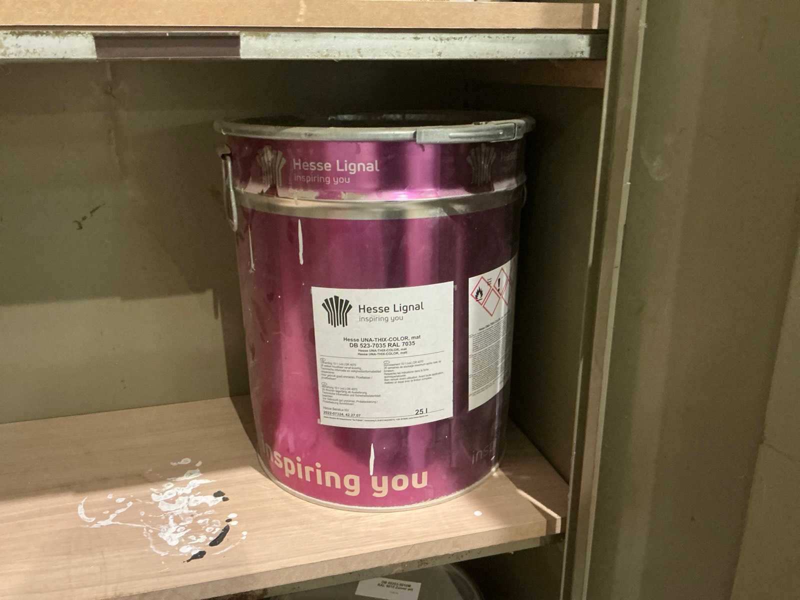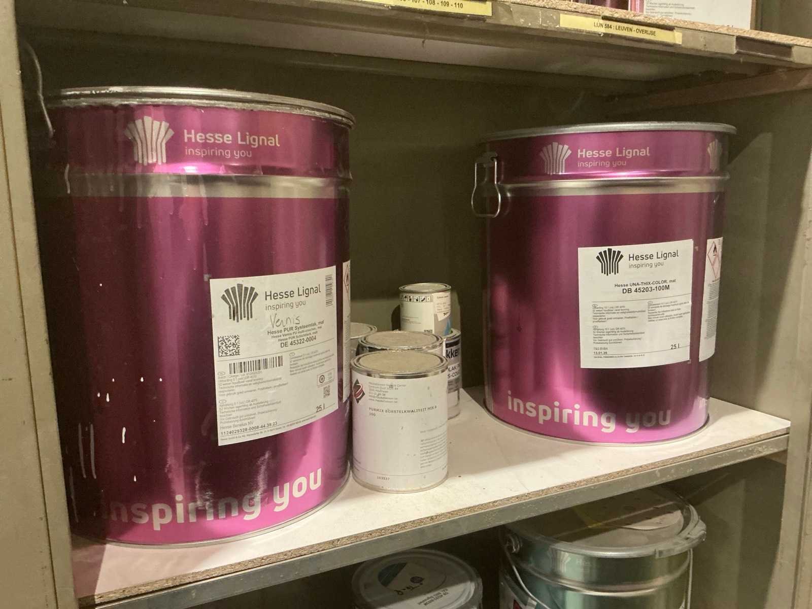 Waaronder partij diverse lakken, primers en Tinners Hesse Lignal 1L, 5L en 25L, waaronder aangesproken en ongeopend, liggende in 2 dossierkasten en rek (inclusief) Nee