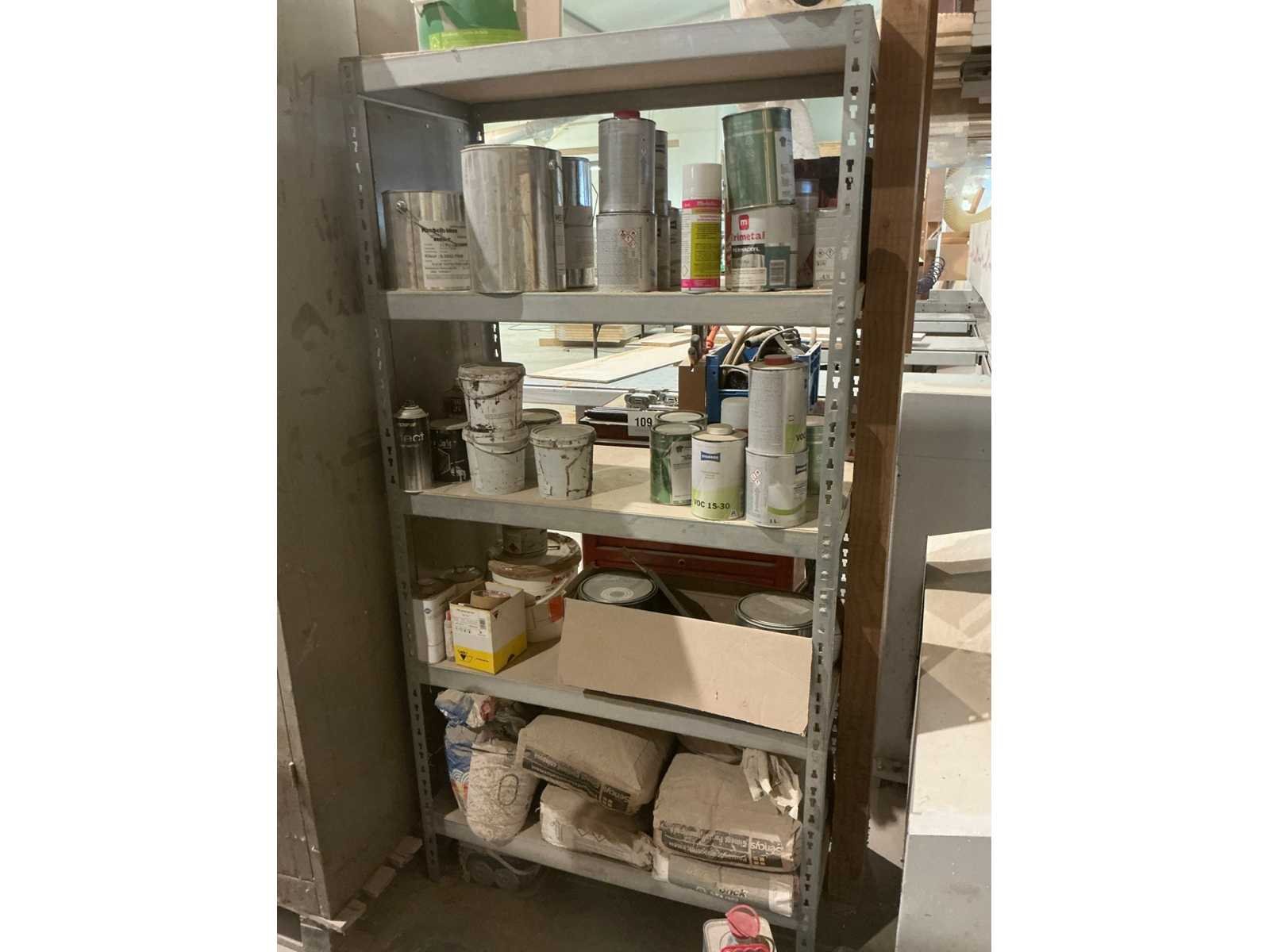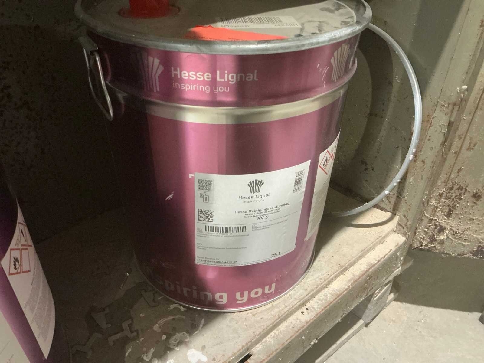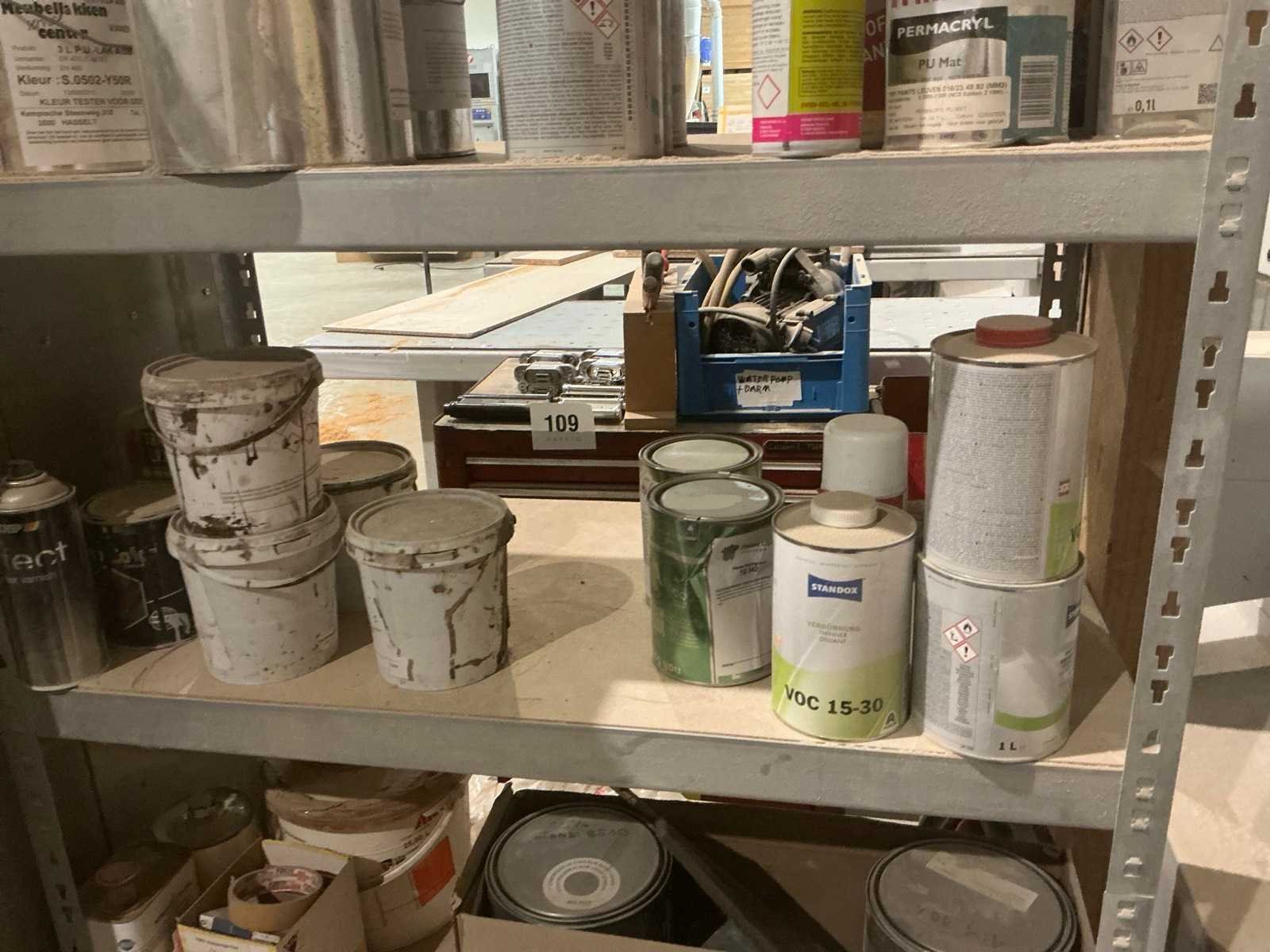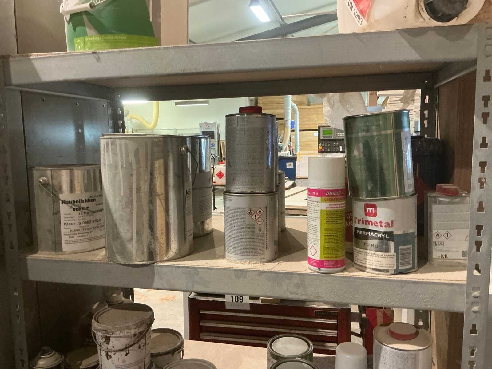 Waaronder partij diverse lakken, primers en Tinners Hesse Lignal 1L, 5L en 25L, waaronder aangesproken en ongeopend, liggende in 2 dossierkasten en rek (inclusief) Nee