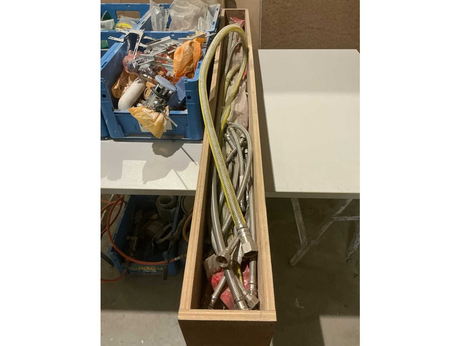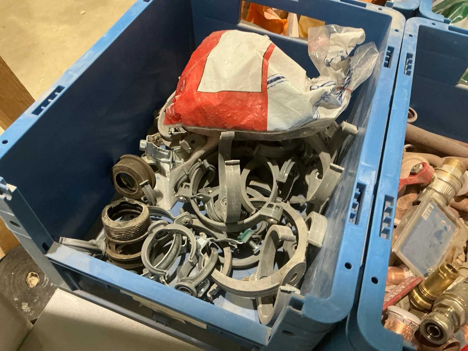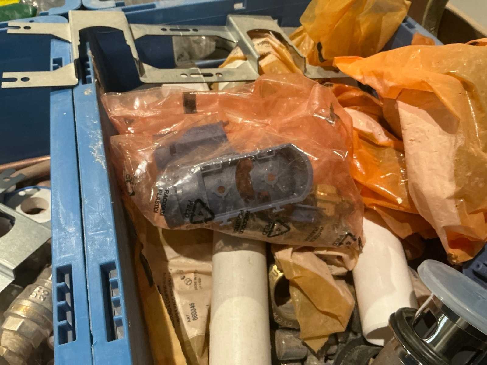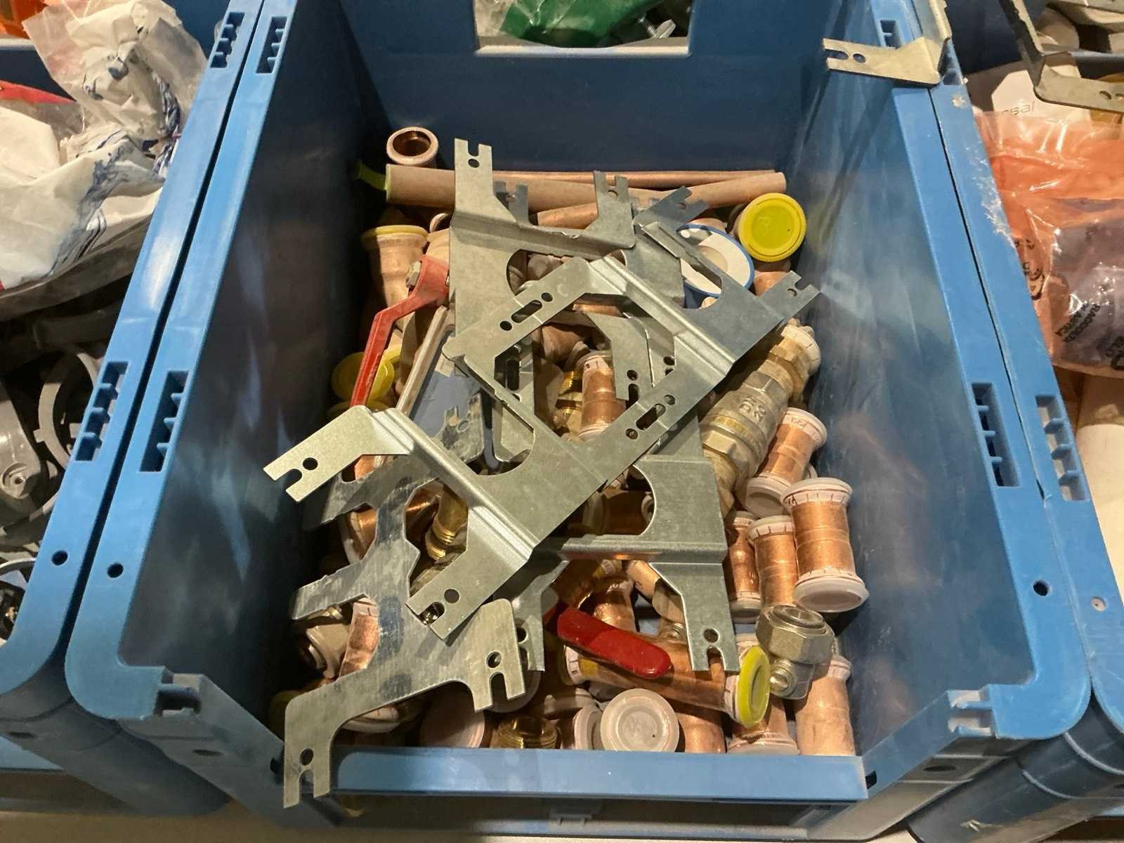 Waaronder partij diverse koperen koppelstukken, installatiekraantjes Aster, diverse buizenhouders, inbouwdozen Systempex voor perslucht, bevestigingsplaatjes, afvoerpluggen NF en diverse flexibele aansluitdarmen Nee