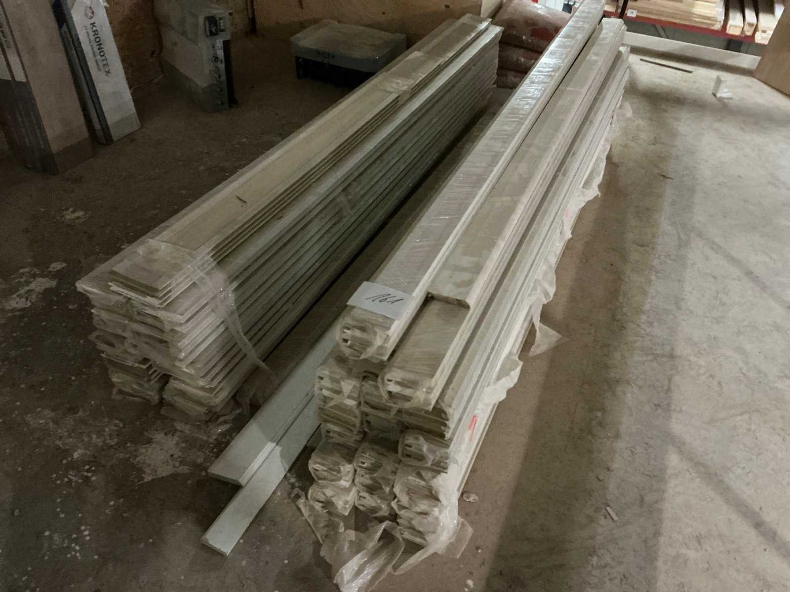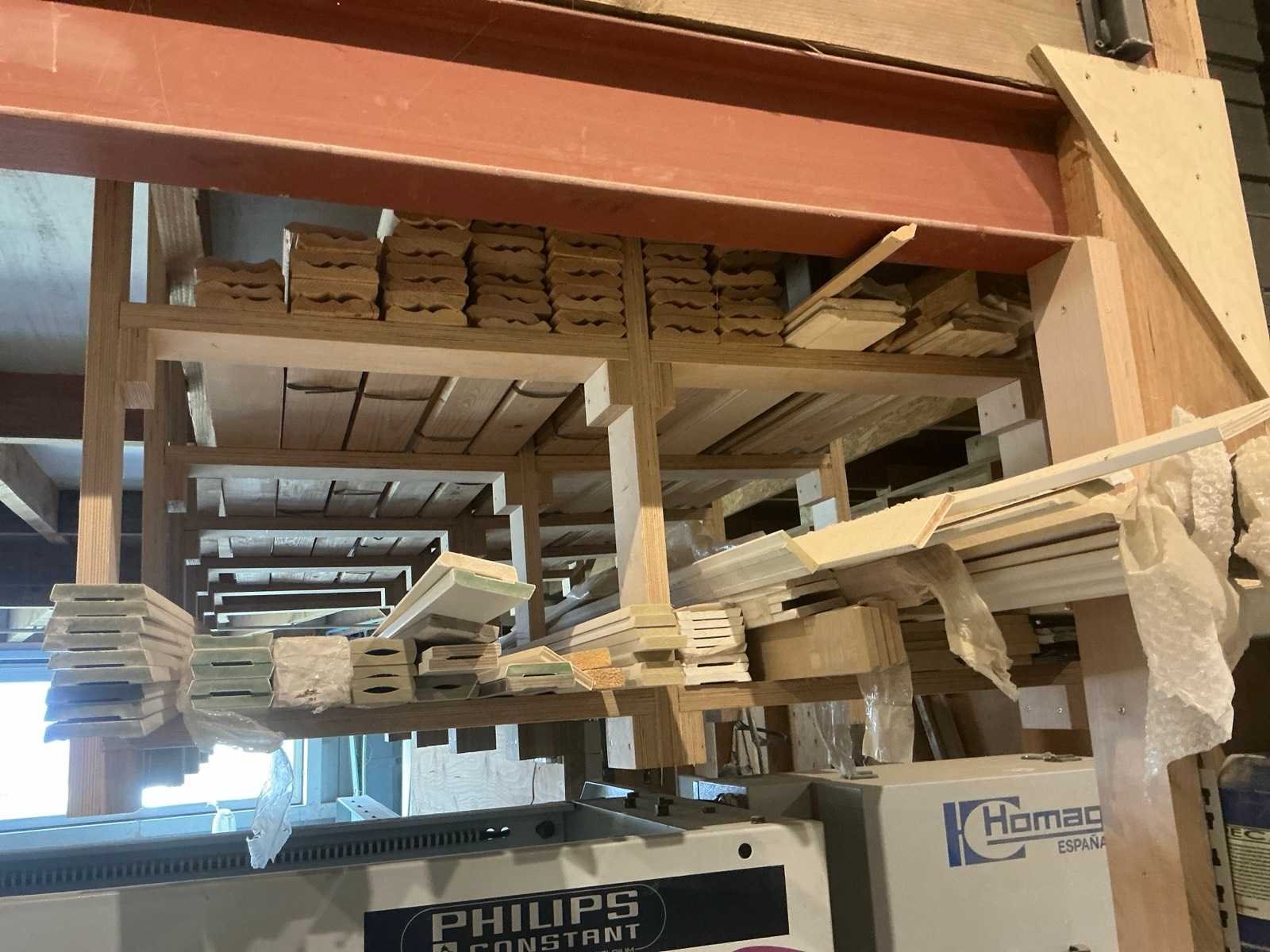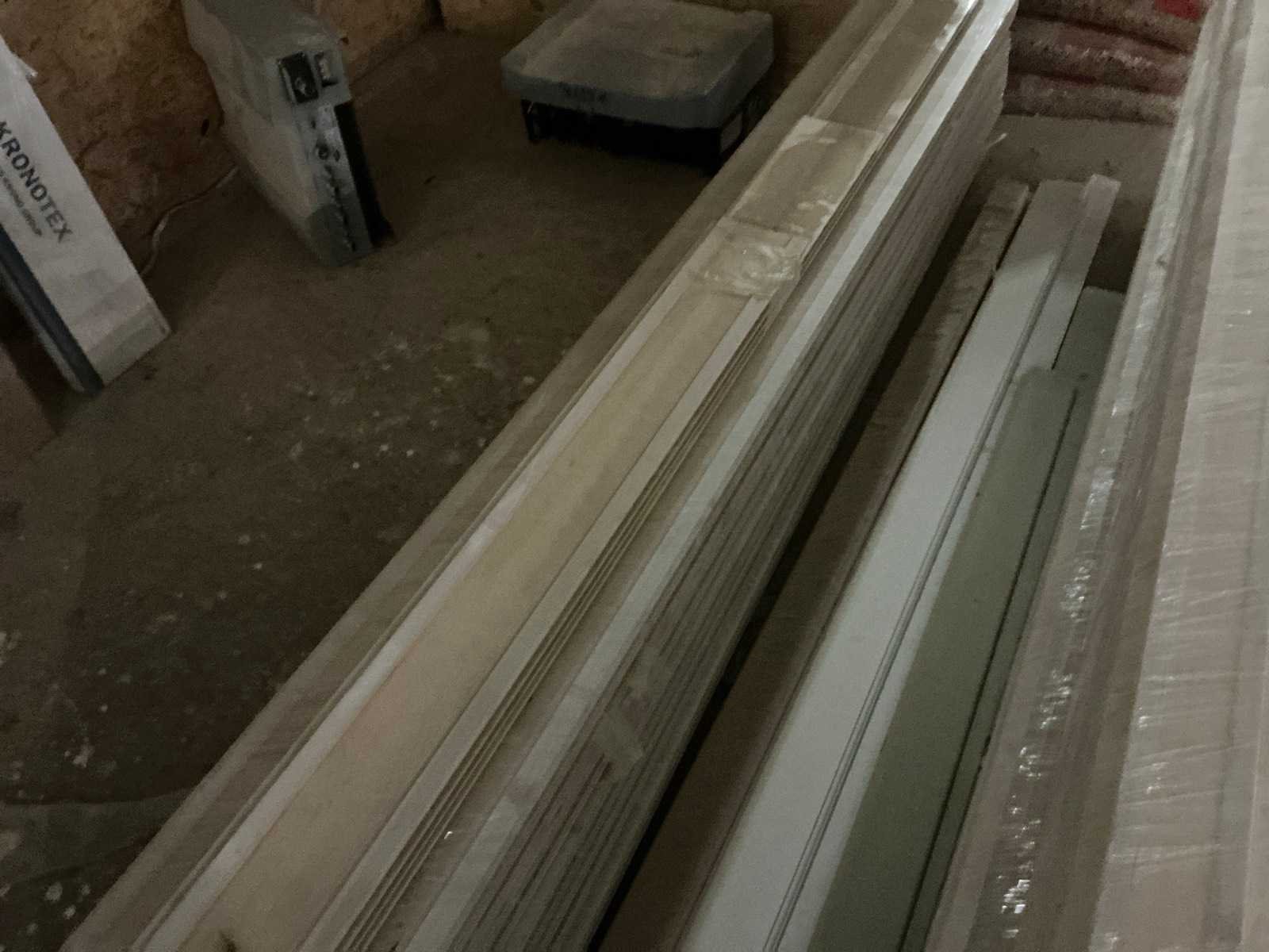 Waaronder met lengtes: 244cm, 176cm en 144 cm, compleet met partij diverse moullures tot 300cm Liggende op vlonder en in houten opbergrek Door koper zelfstandig naar beneden te halen. Nee