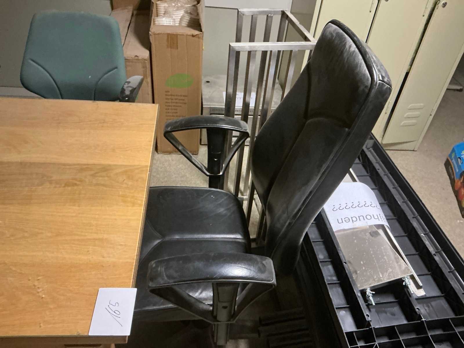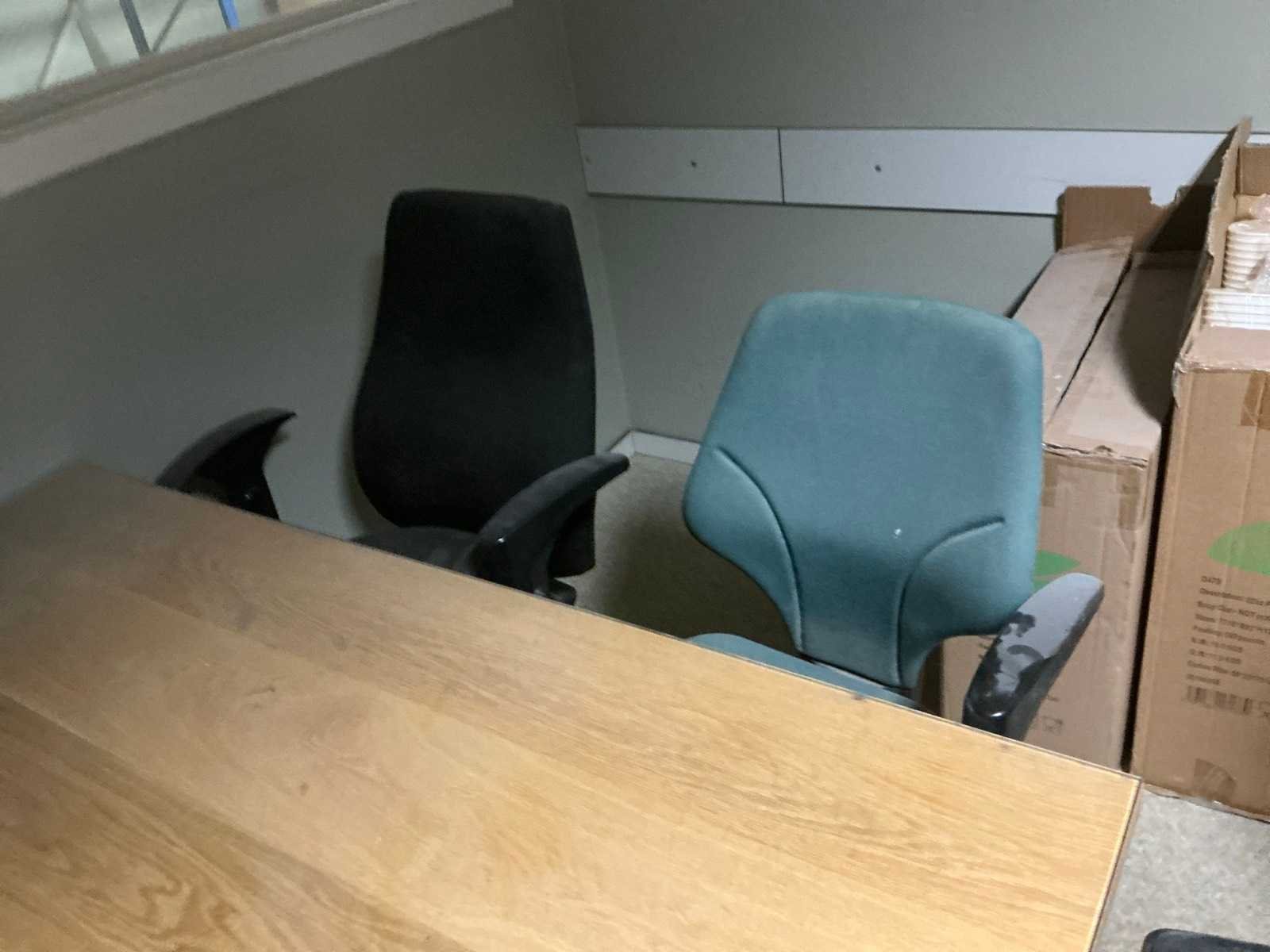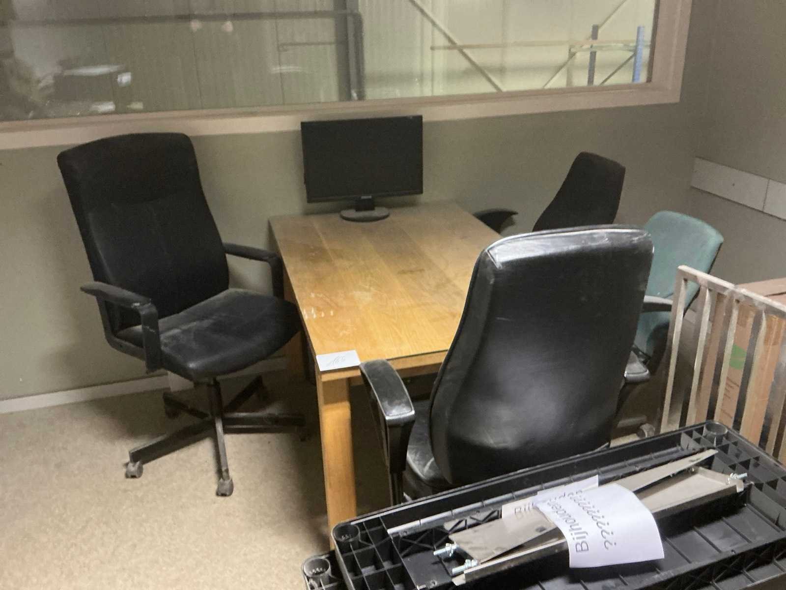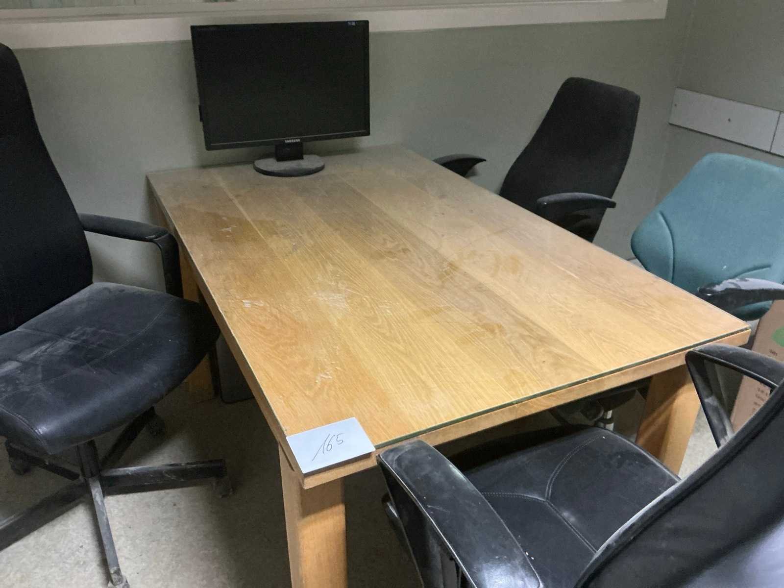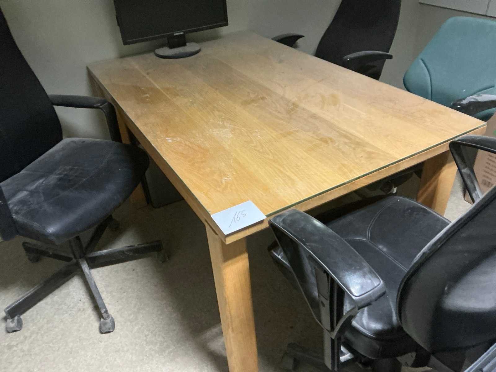 Bestaande uit houten bureautafel voorzien van glazen afdekblad, met afmetingen ca. 140 x 85 x 76cm en 4x bureaustoel. Liggende op vlonder. Door koper zelfstandig naar beneden te halen. Nee