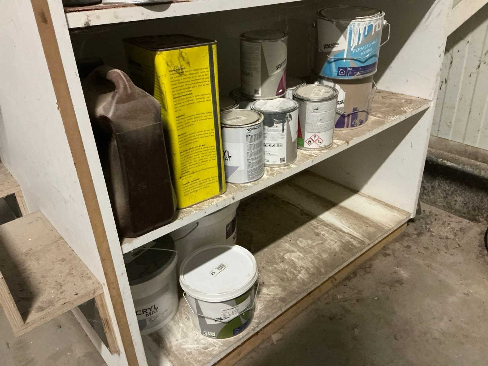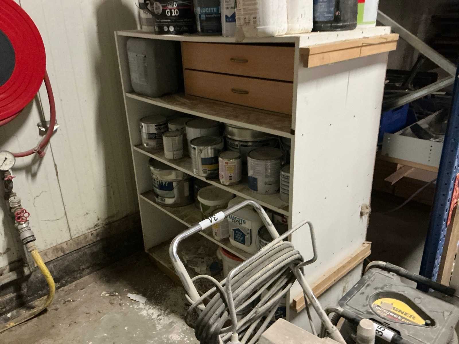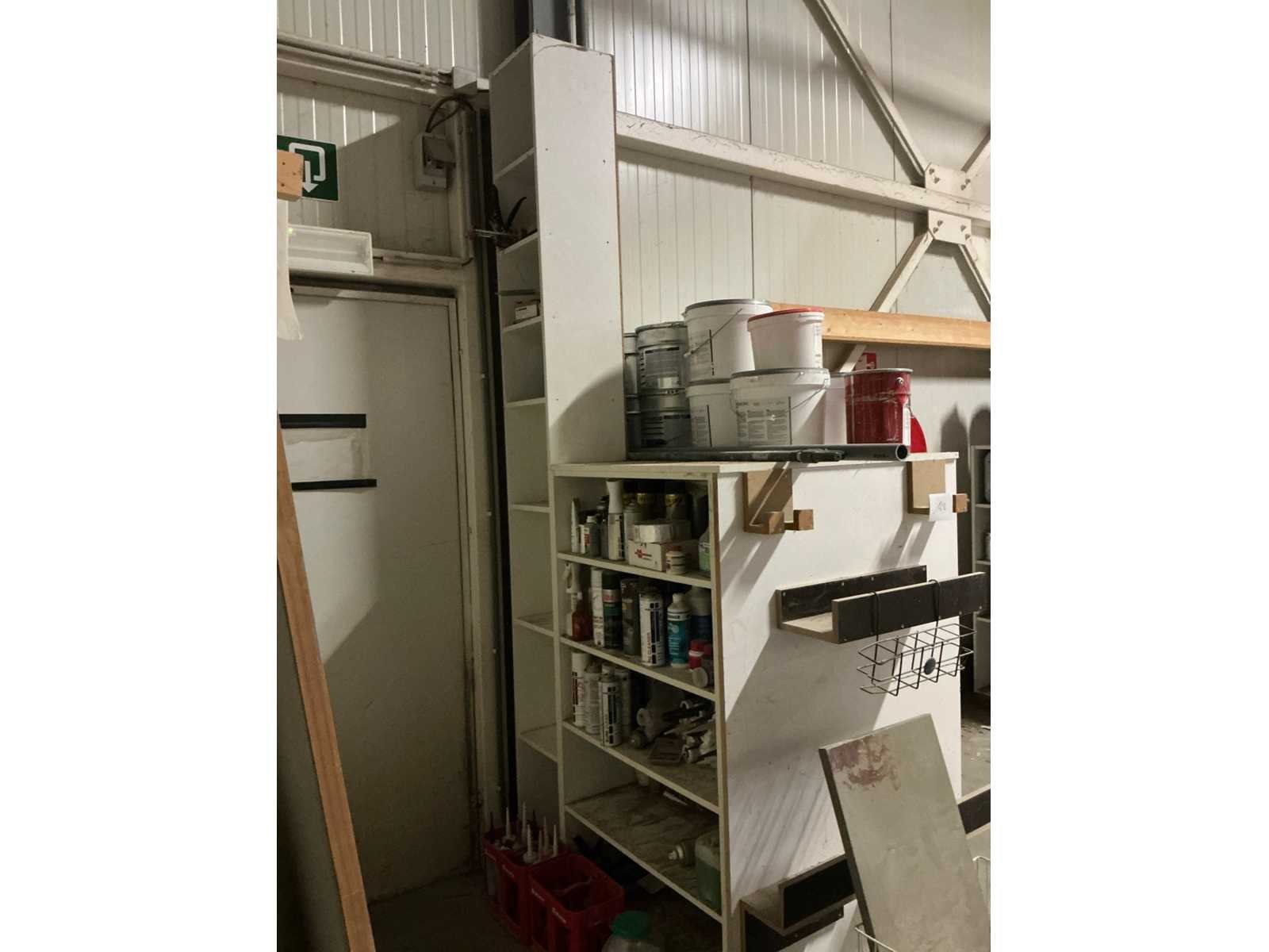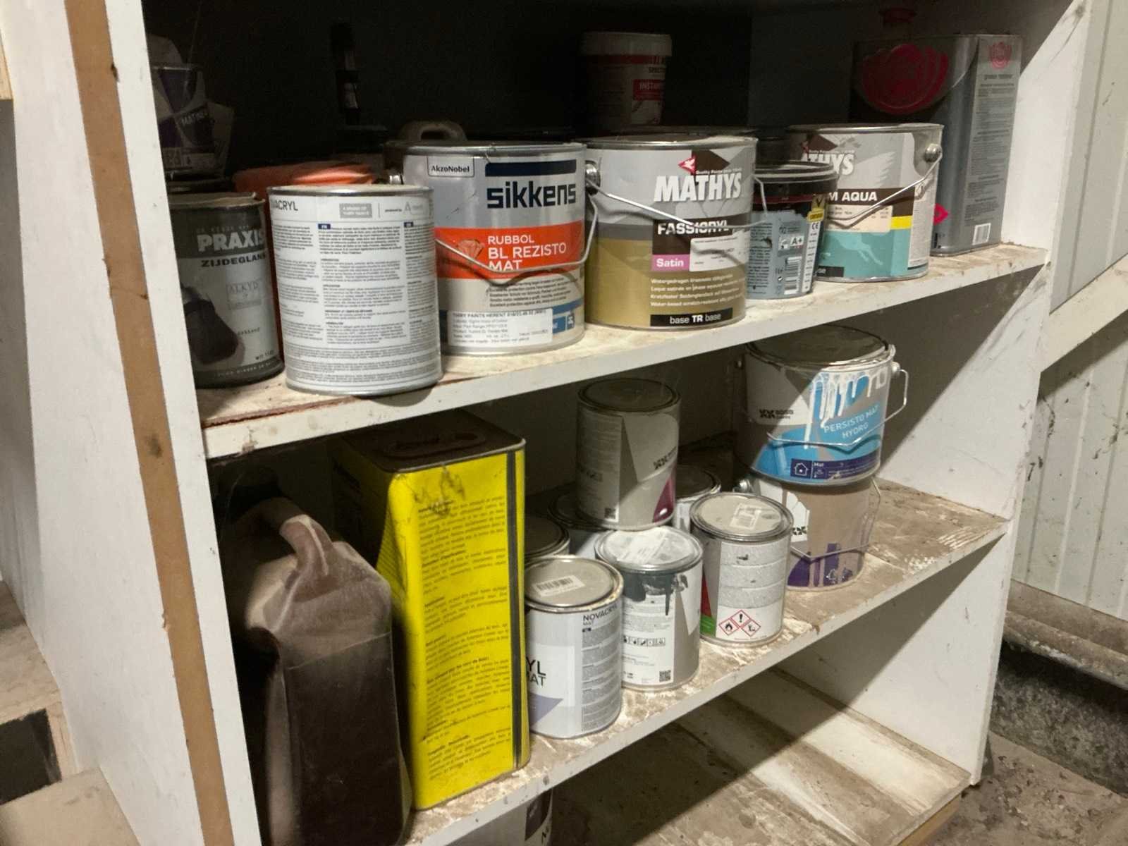 Met inhoud waaronder muurverf, lak, diverse sprays, siliconen en diverse vloeistoffen. Waaronder merken Novaprim, Sikkens, Mathys, Boss Paints, Ardex,… Waaronder 1x met afmetingen ca. 120 x 94 x 290cm en 1x met afmetingen ca. 124 x 61 x 148cm. Afgifte volgens aanwijzing. Door koper te verplaatsen van omgeving. Nee